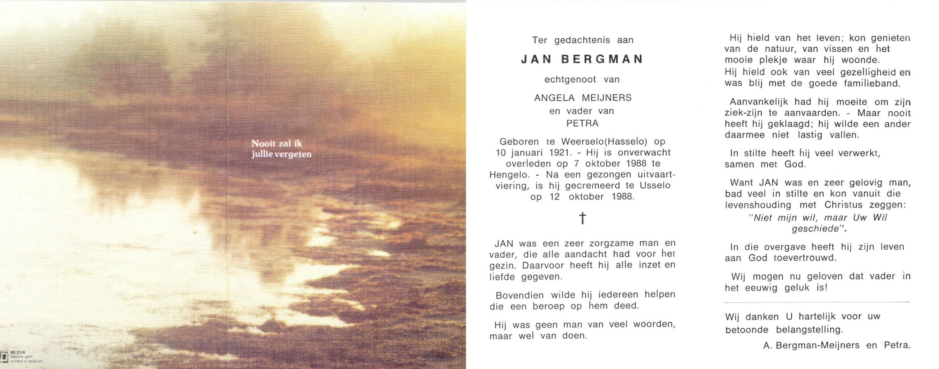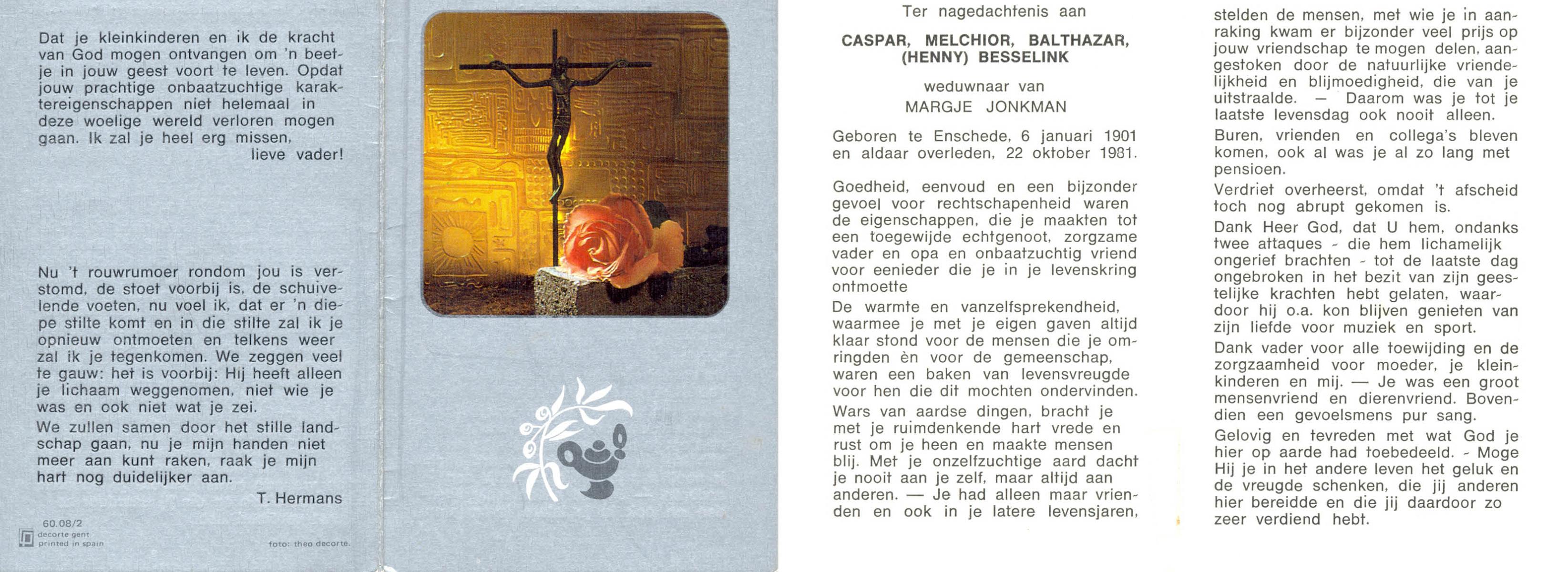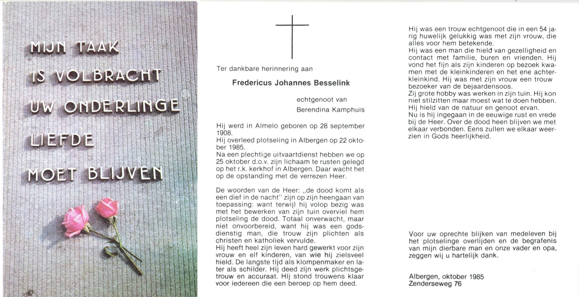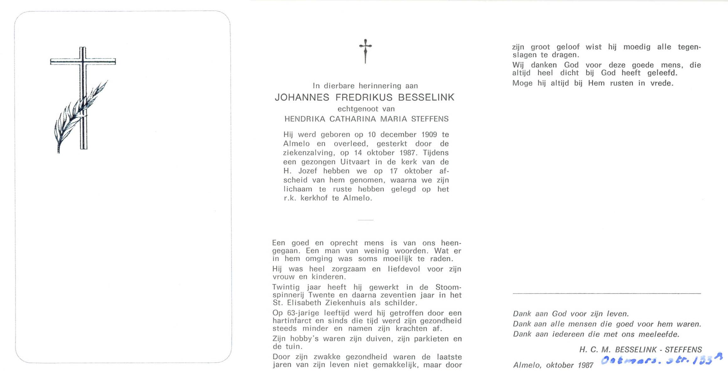 BEKKEDAM, Johannes Hendrikus, geboren op 27-5-1913 te Hasselo, overleden op 31-3-1985 te Hengelo (Ov.) op 71-jarige leeftijd.