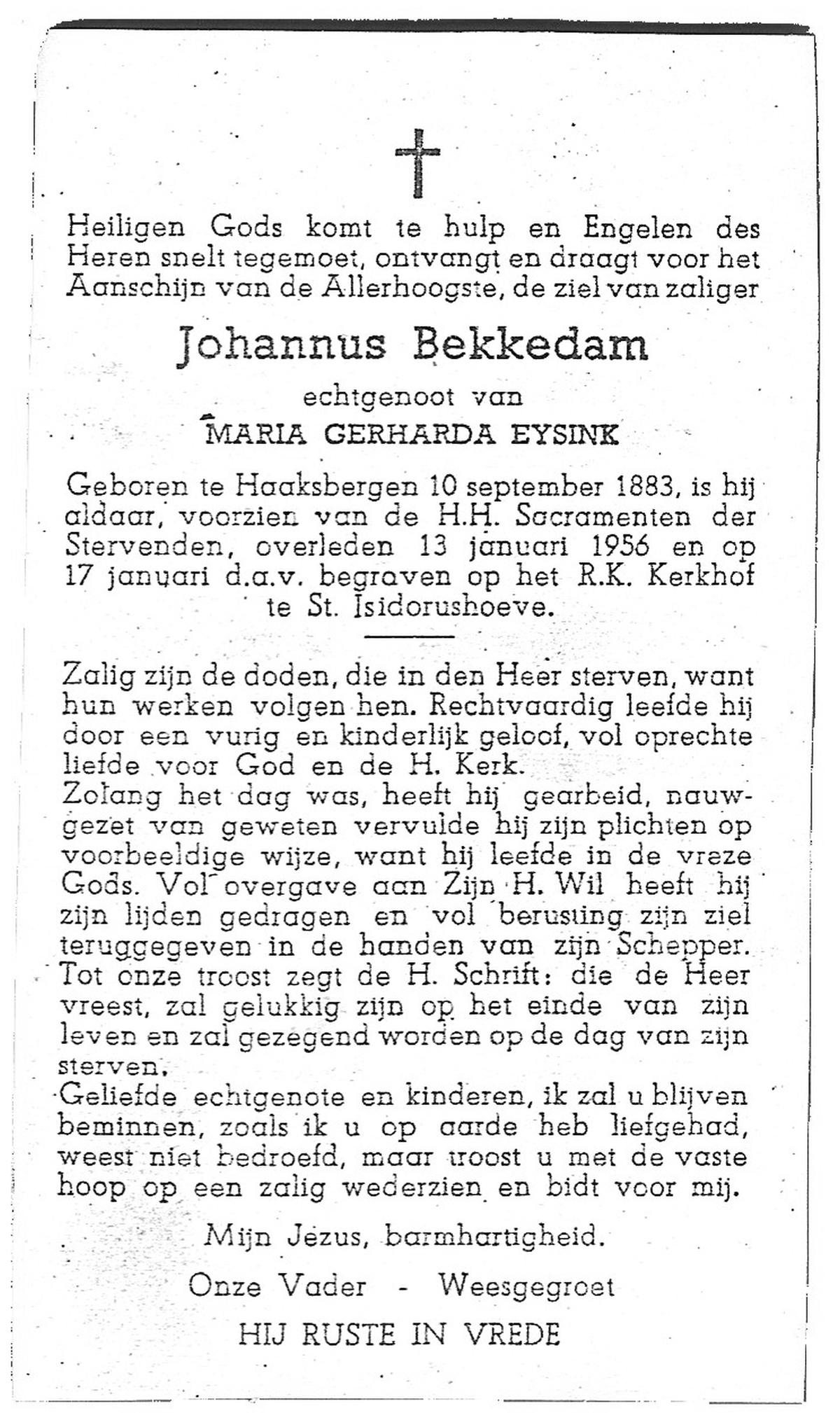 BEKKEDAM, Johannus, geboren op 10-09-1883 te Haaksbergen, overleden op 13-1-1956 op 72-jarige leeftijd, begraven op 17-1-1956 te St.Isidorushoeve.