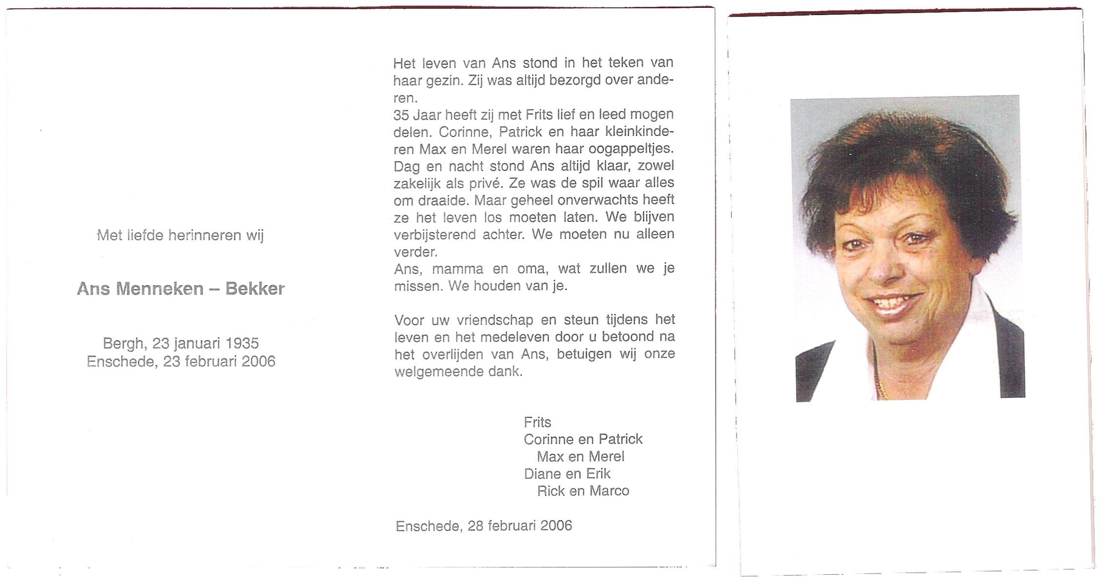 BEKKER, Ans, geboren op 23-1-1935 te Bergh, overleden op 23-2-2006 te Enschede op 71-jarige leeftijd.