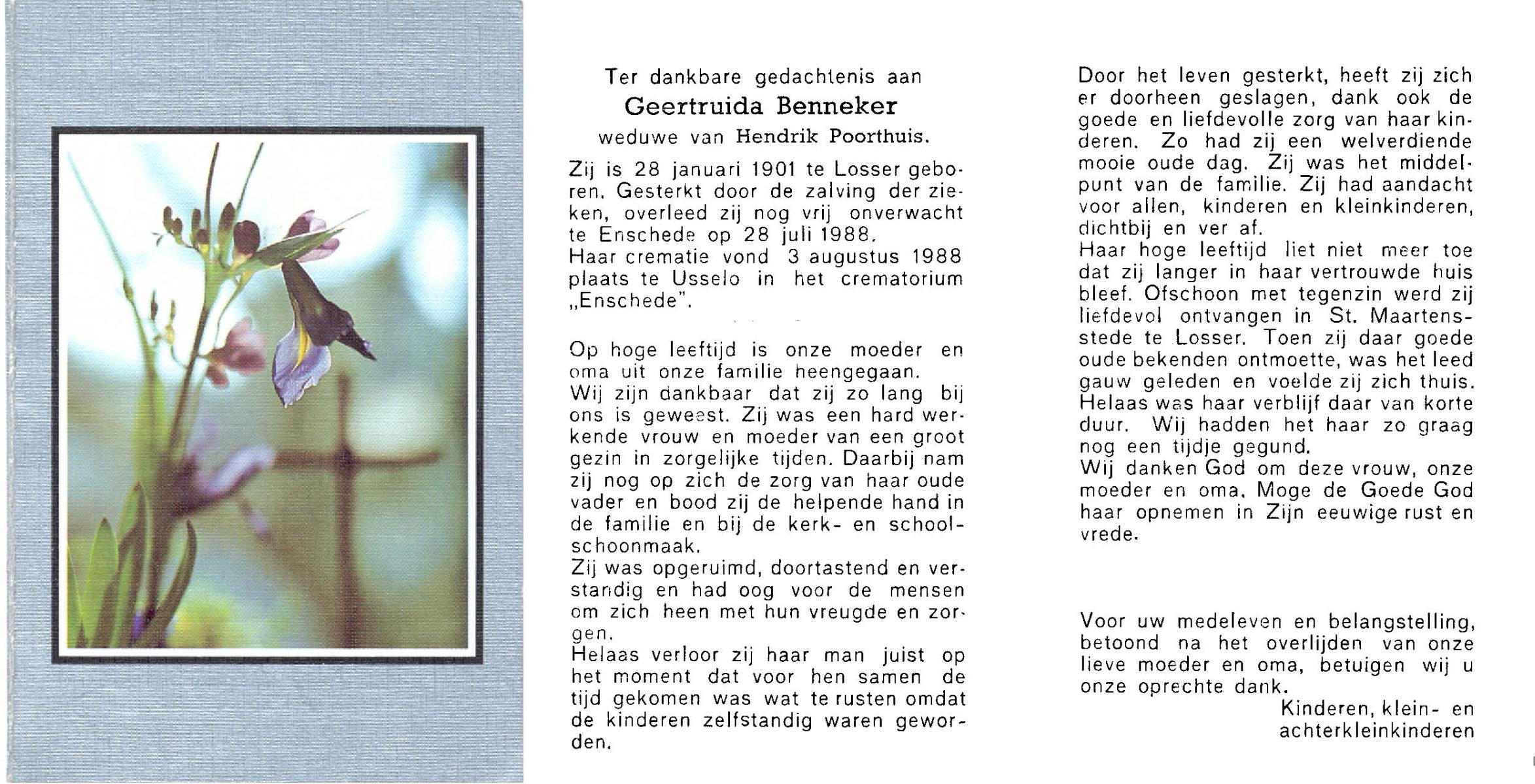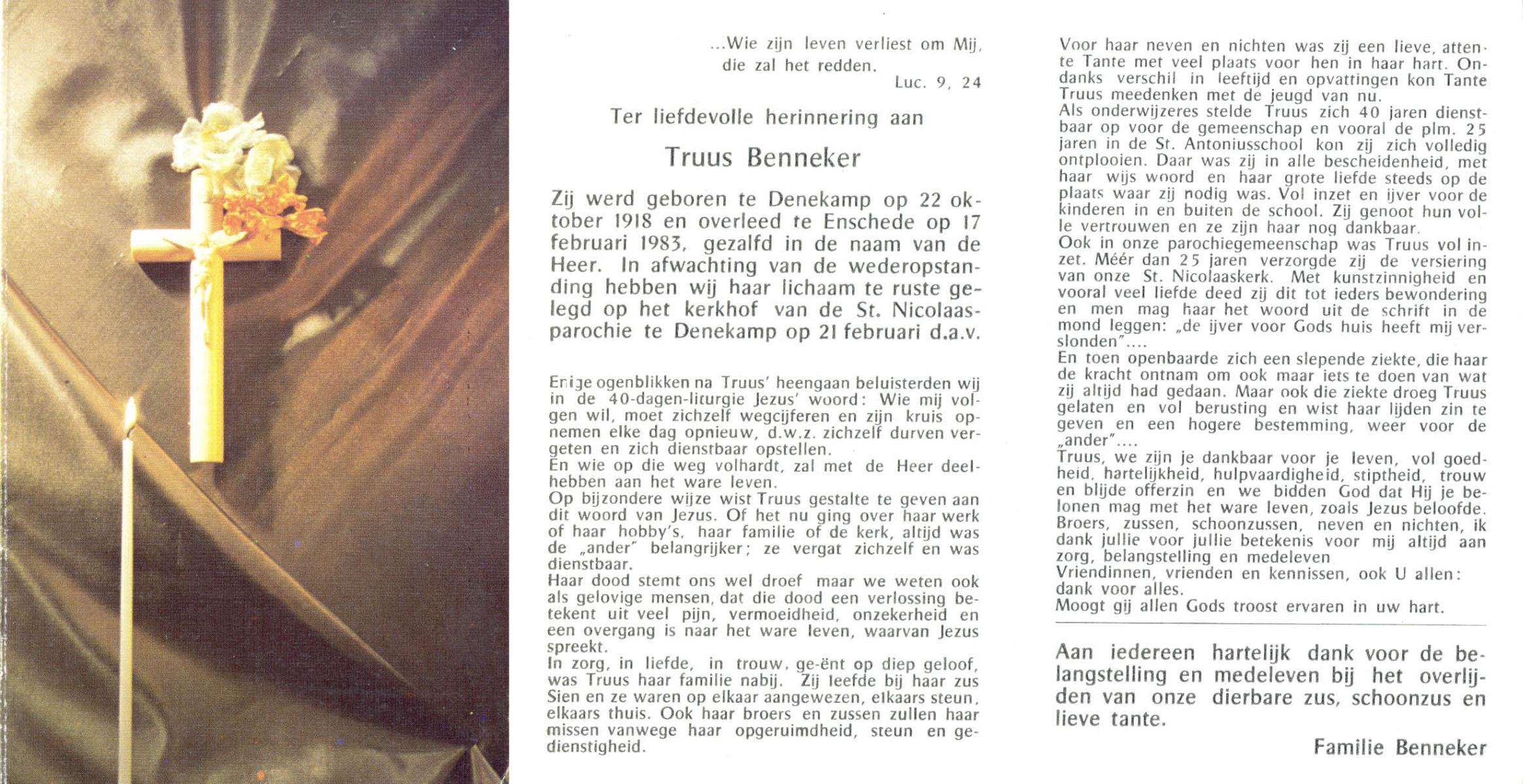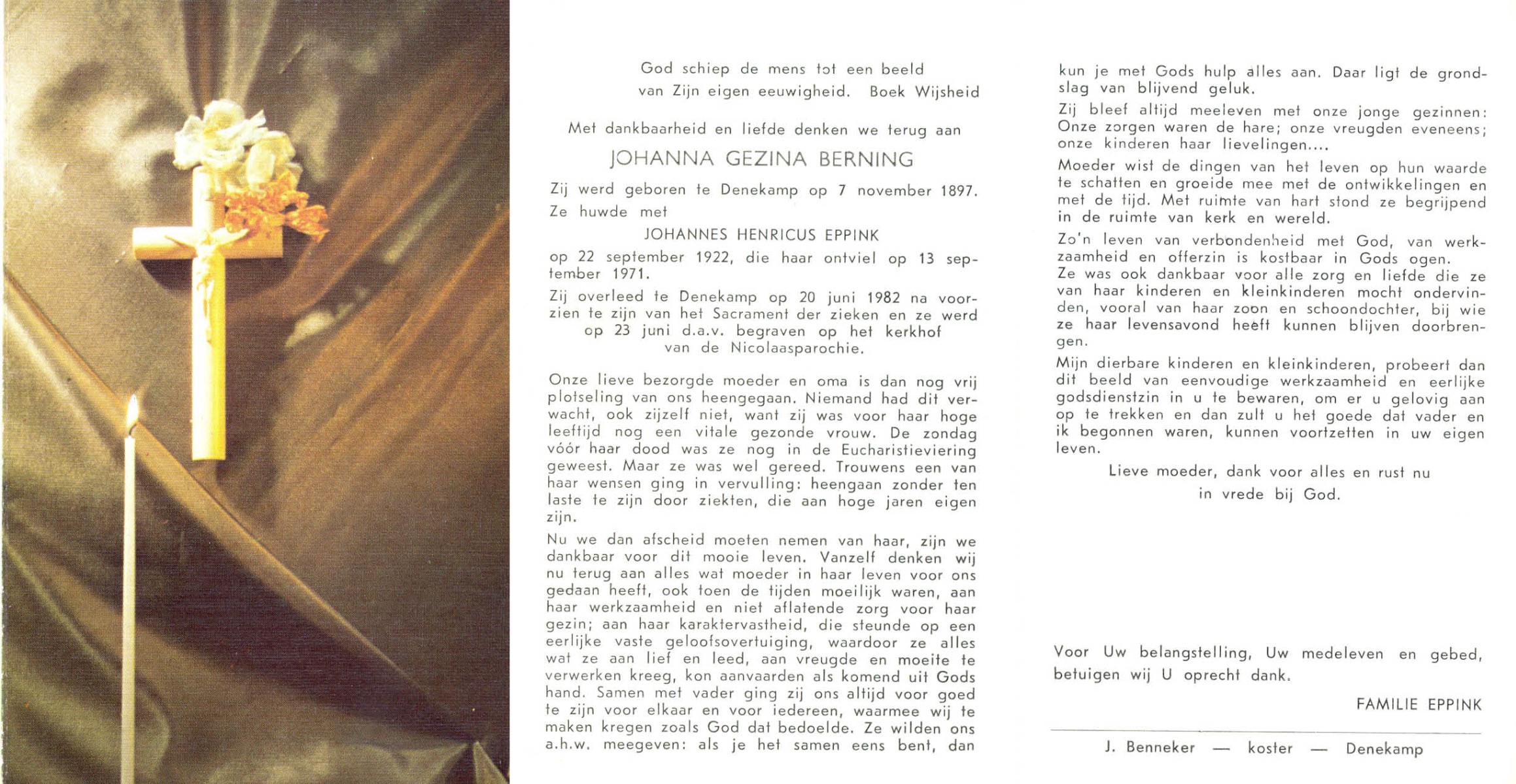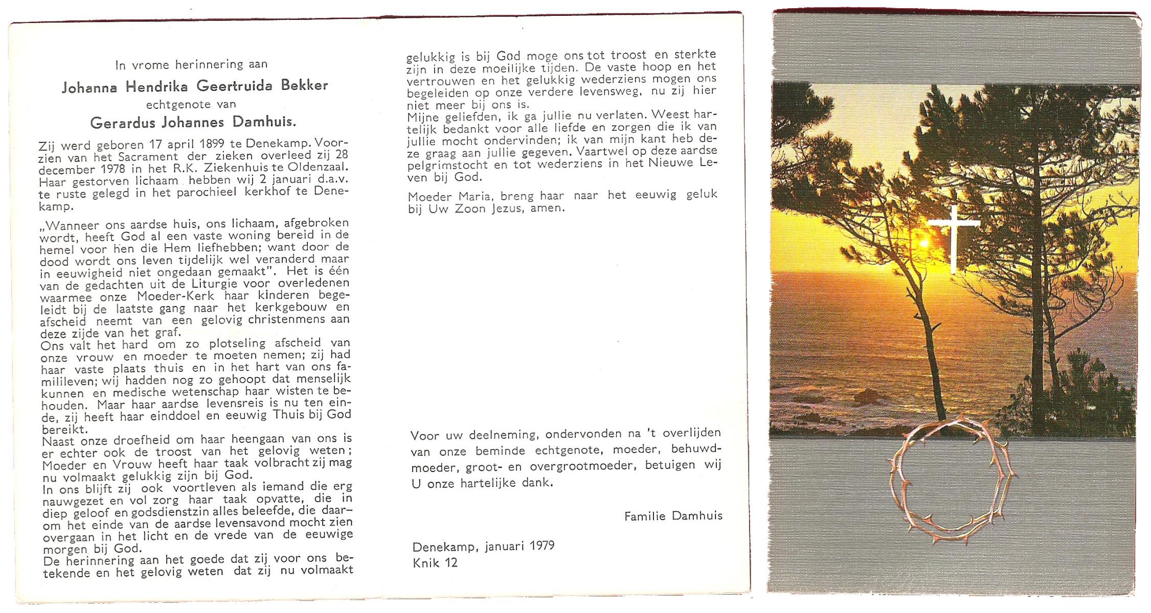 BEKKER, Johanna Hendrika Geertruida, geboren op 17-04-1899 te Denekamp, overleden op 28-12-1978 te Oldenzaal op 79-jarige leeftijd, begraven op 2-1-1979 te Denekamp.