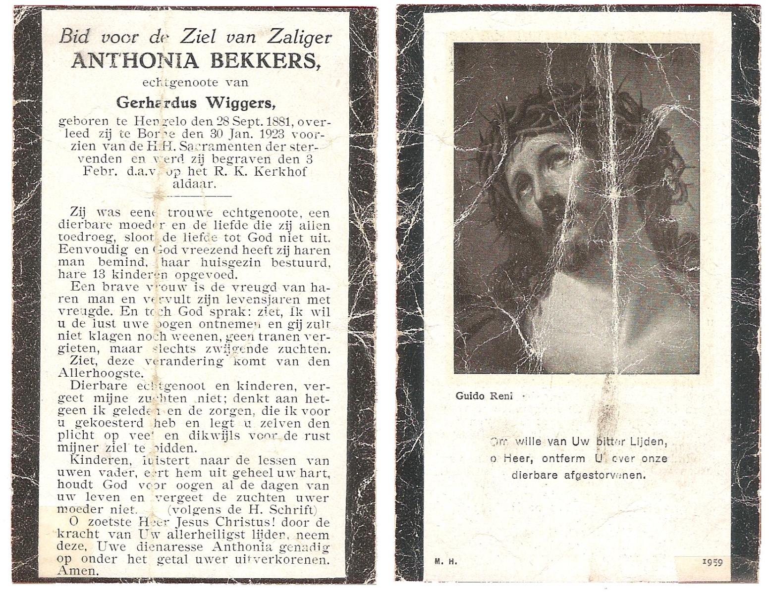 BEKKERS, Anthonia, geboren op 28-09-1881 te Hengelo (O), overleden op 30-1-1923 te Borne op 42-jarige leeftijd, begraven op 3-2-1923 te Borne.