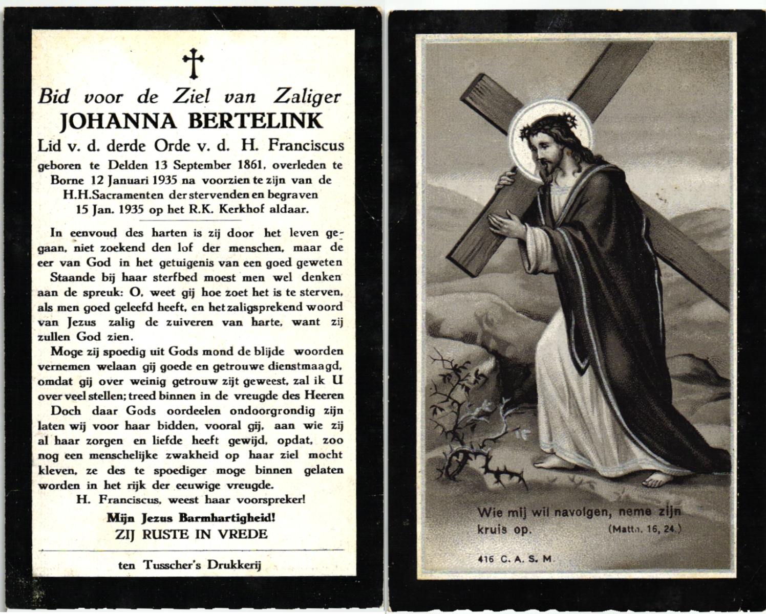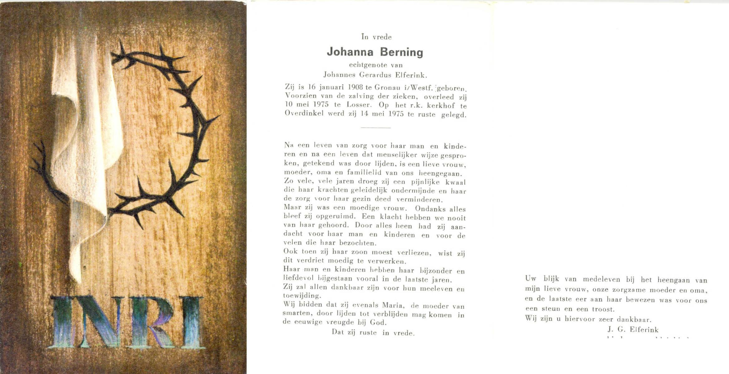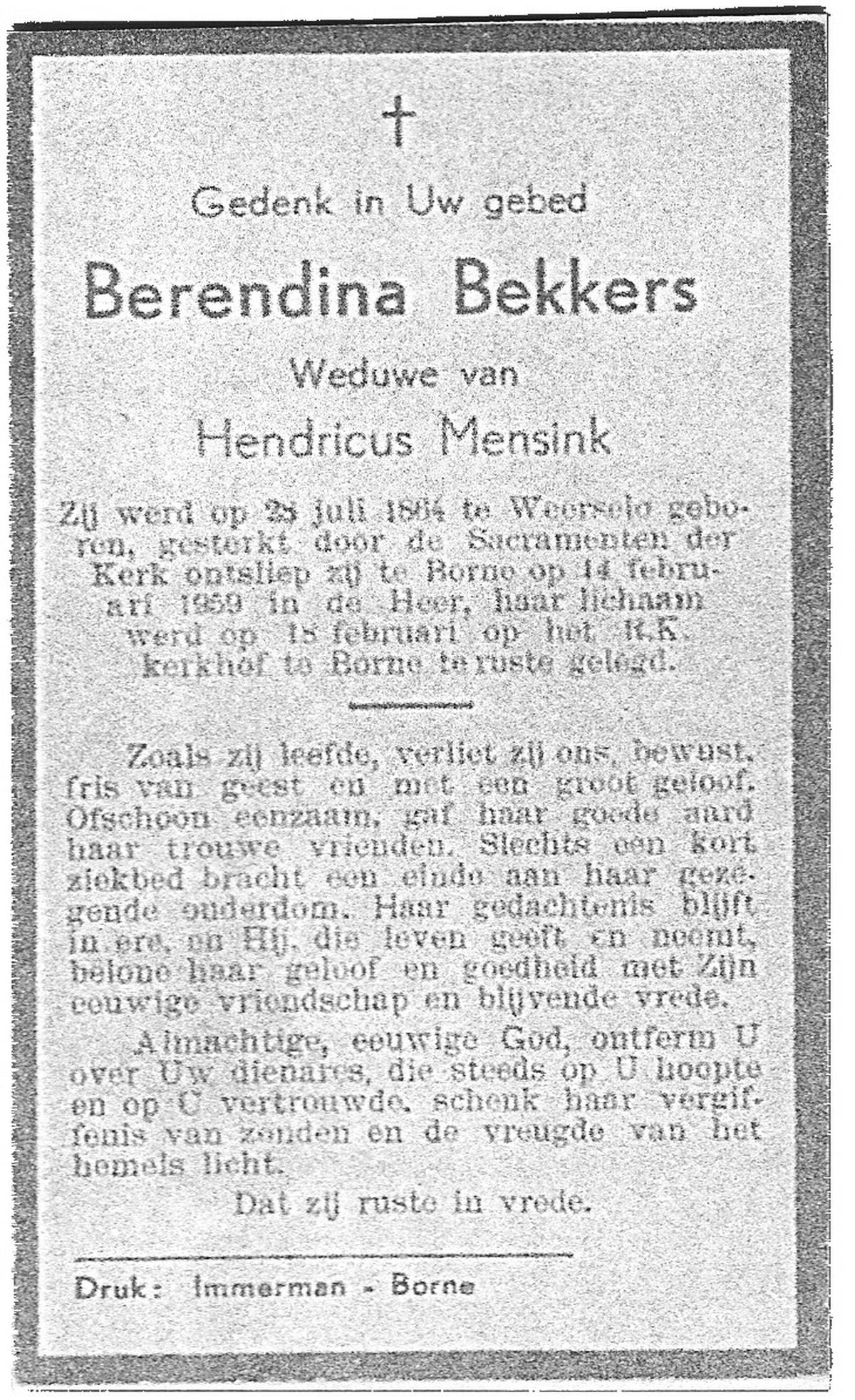 BEKKERS, Berendina, geboren op 28-07-1864 te Weerselo, overleden op 14-2-1959 te Borne op 94-jarige leeftijd, begraven op 18-2-1959 te Borne.