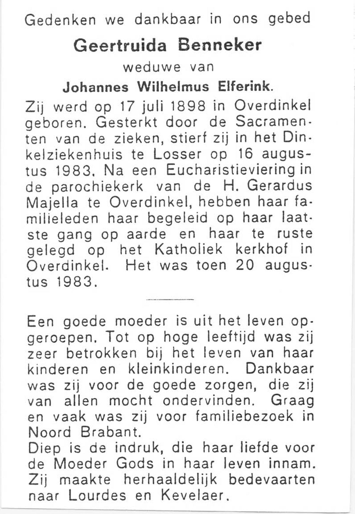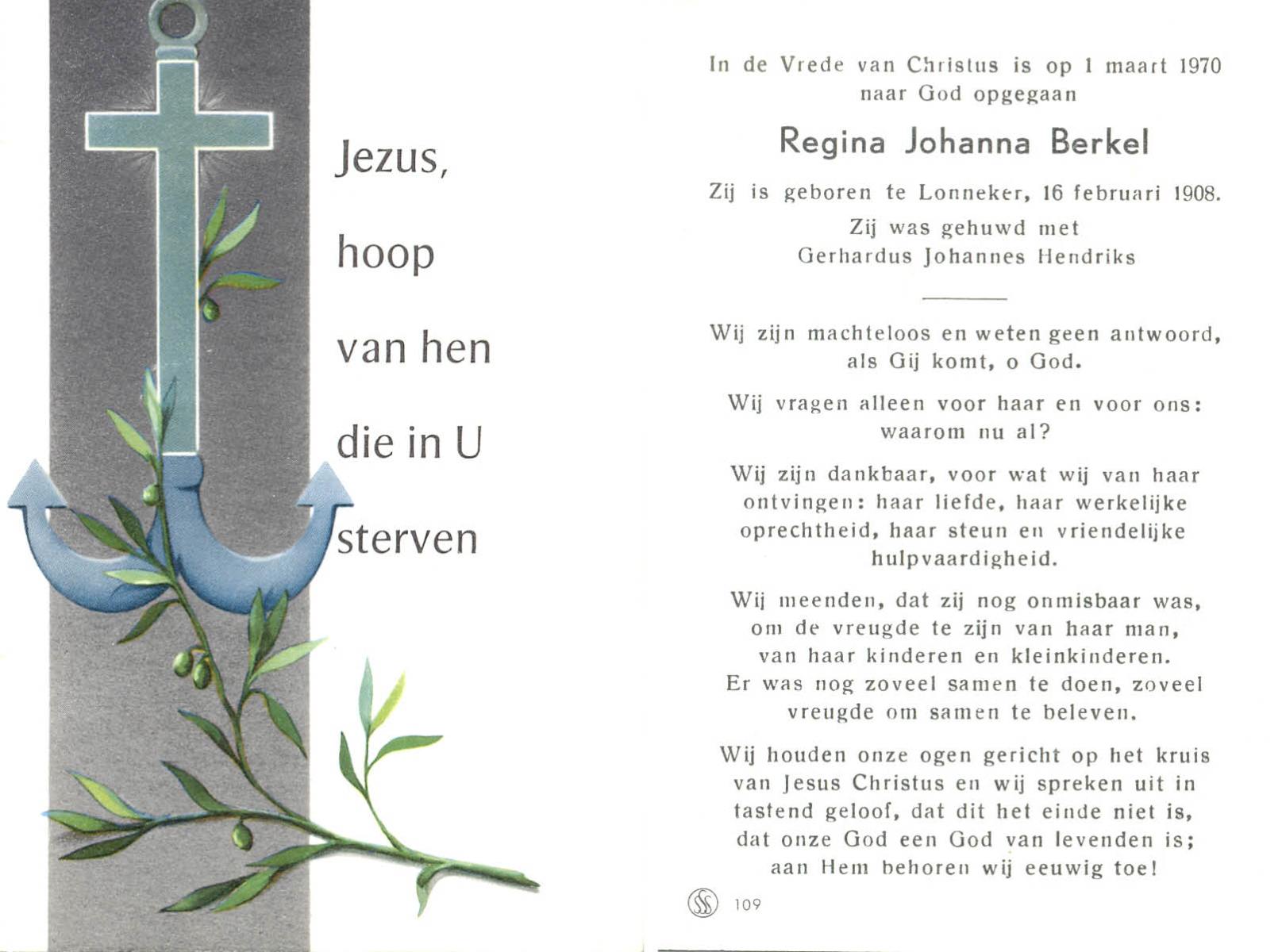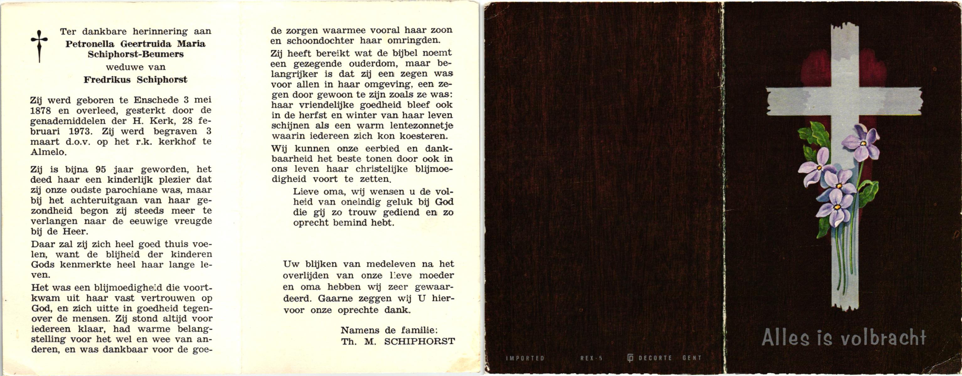 BEKKERS, Berendina, geboren op 28-07-1864 te Weerselo, overleden op 14-2-1959 te Borne op 94-jarige leeftijd, begraven op 18-2-1959 te Borne.