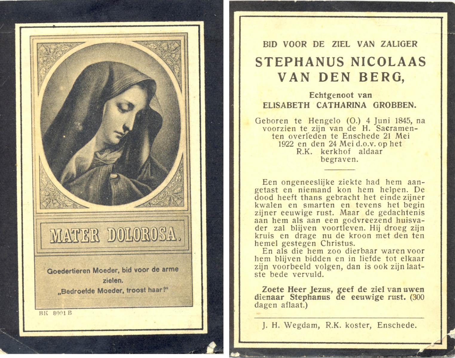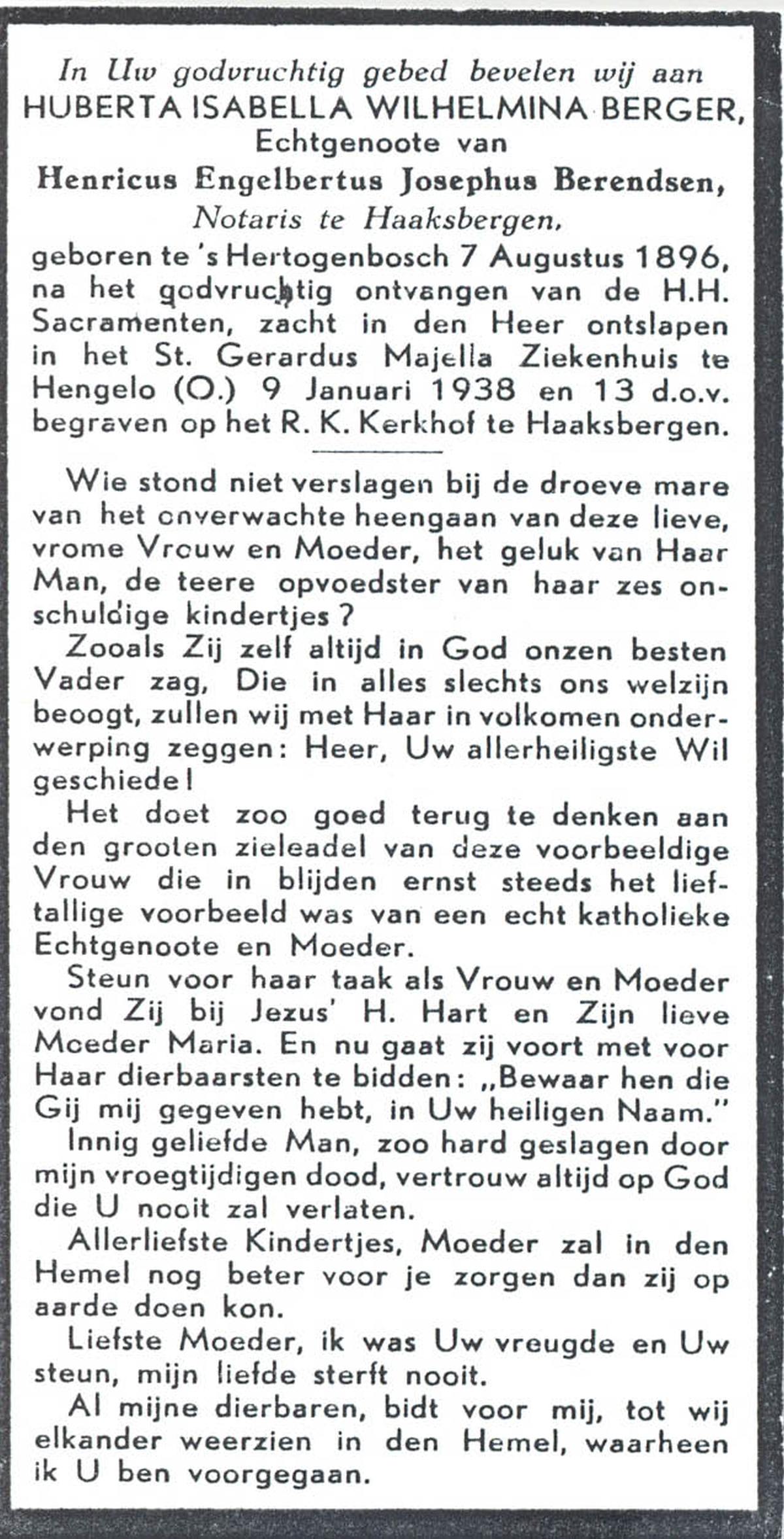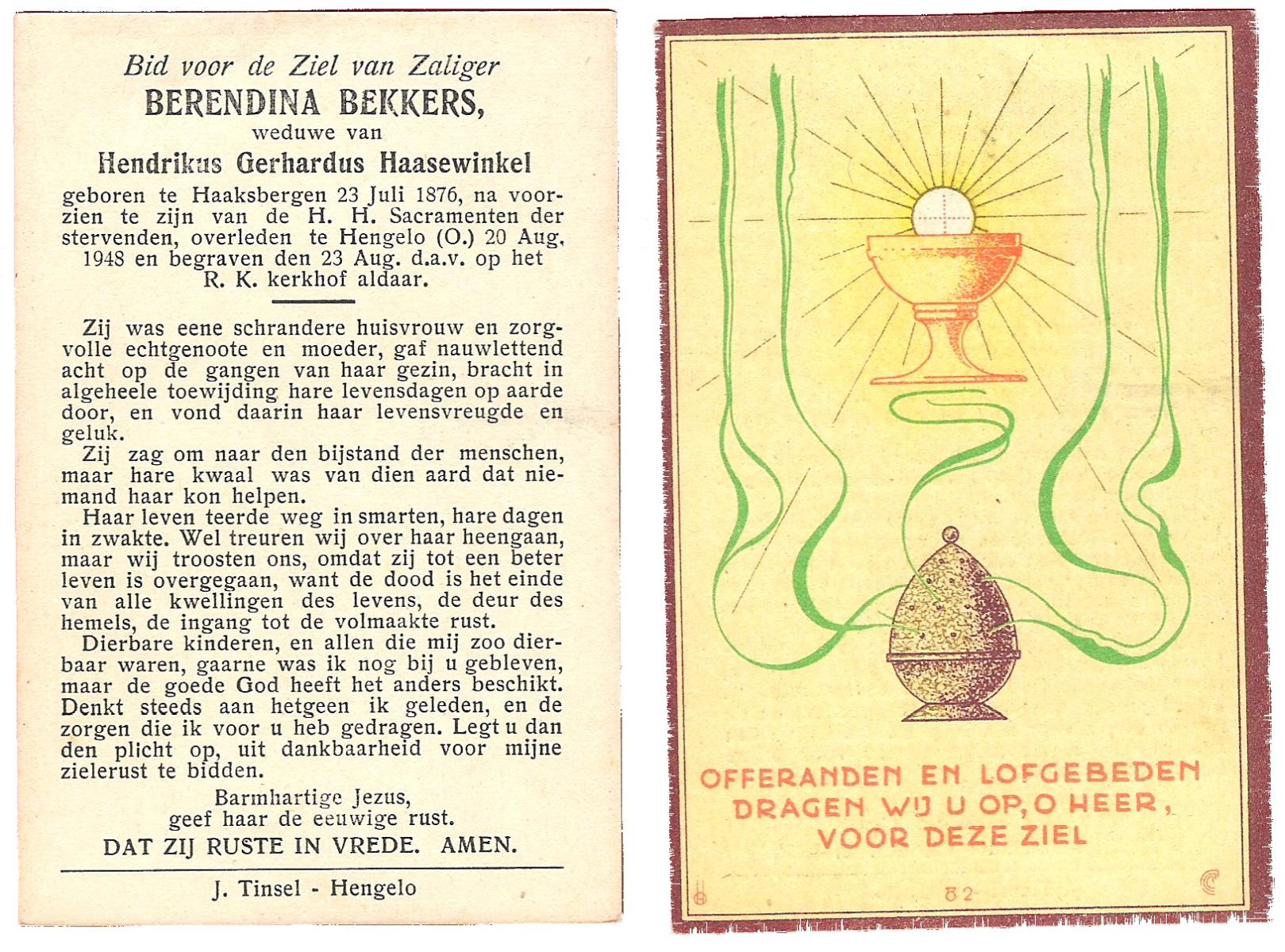 BEKKERS, Berendina, geboren op 23-07-1876 te Haaksbergen, overleden op 20-8-1948 te Hengelo (Ov.) op 72-jarige leeftijd, begraven op 23-8-1948 te Hengelo (Ov.).