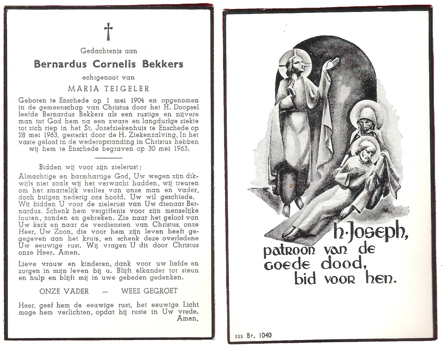 BEKKERS, Bernardus Cornelis, geboren op 1-5-1904 te Enschede, overleden op 28-5-1963 te Enschede op 59-jarige leeftijd, begraven op 30-5-1963 te Enschede.