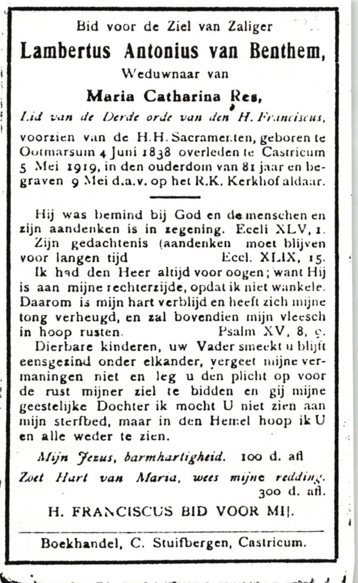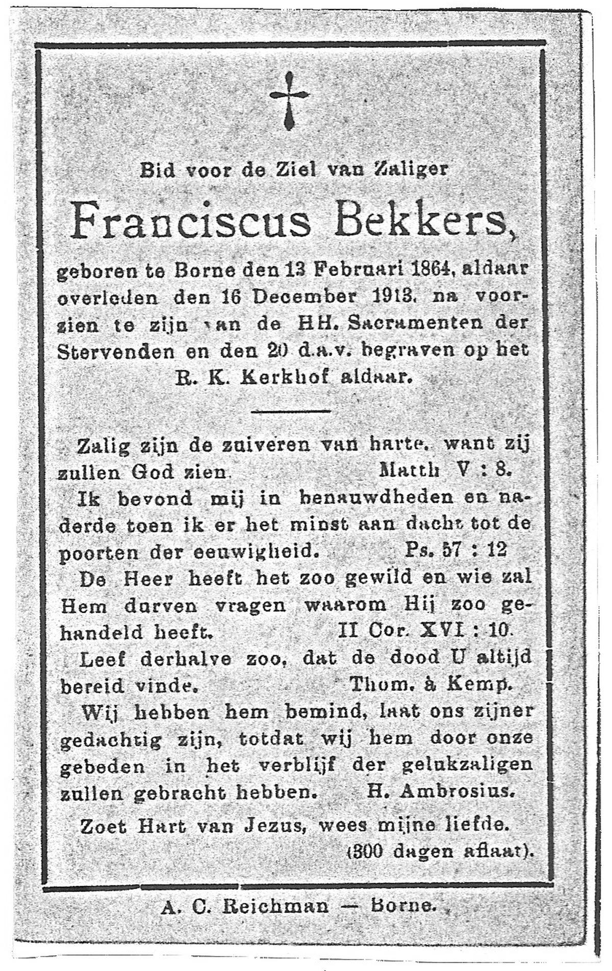 BEKKERS, Franciscus, geboren op 12-02-1864 te Borne, overleden op 16-12-1913 te Borne op 49-jarige leeftijd, begraven op 20-12-1913 te Borne.