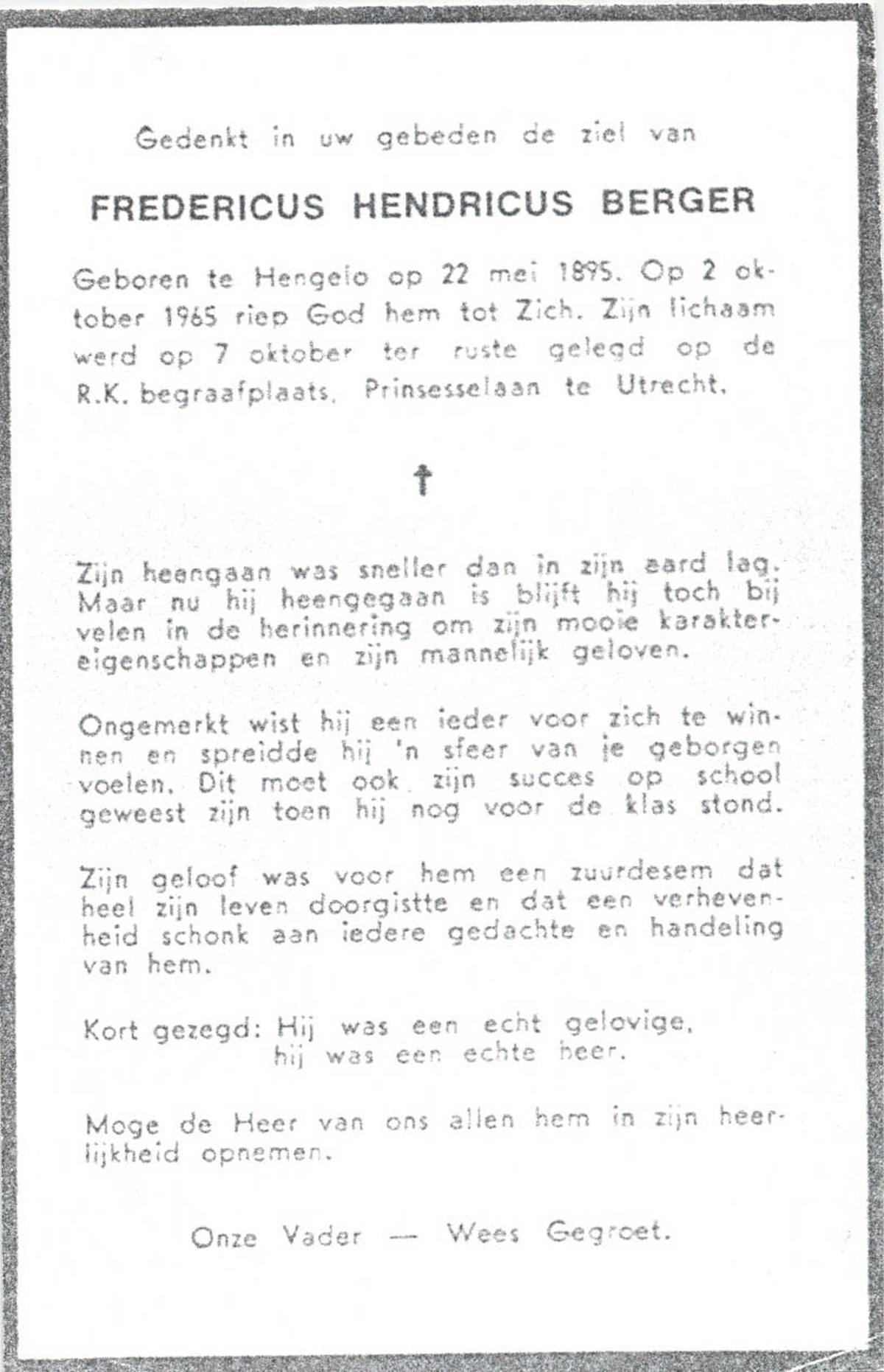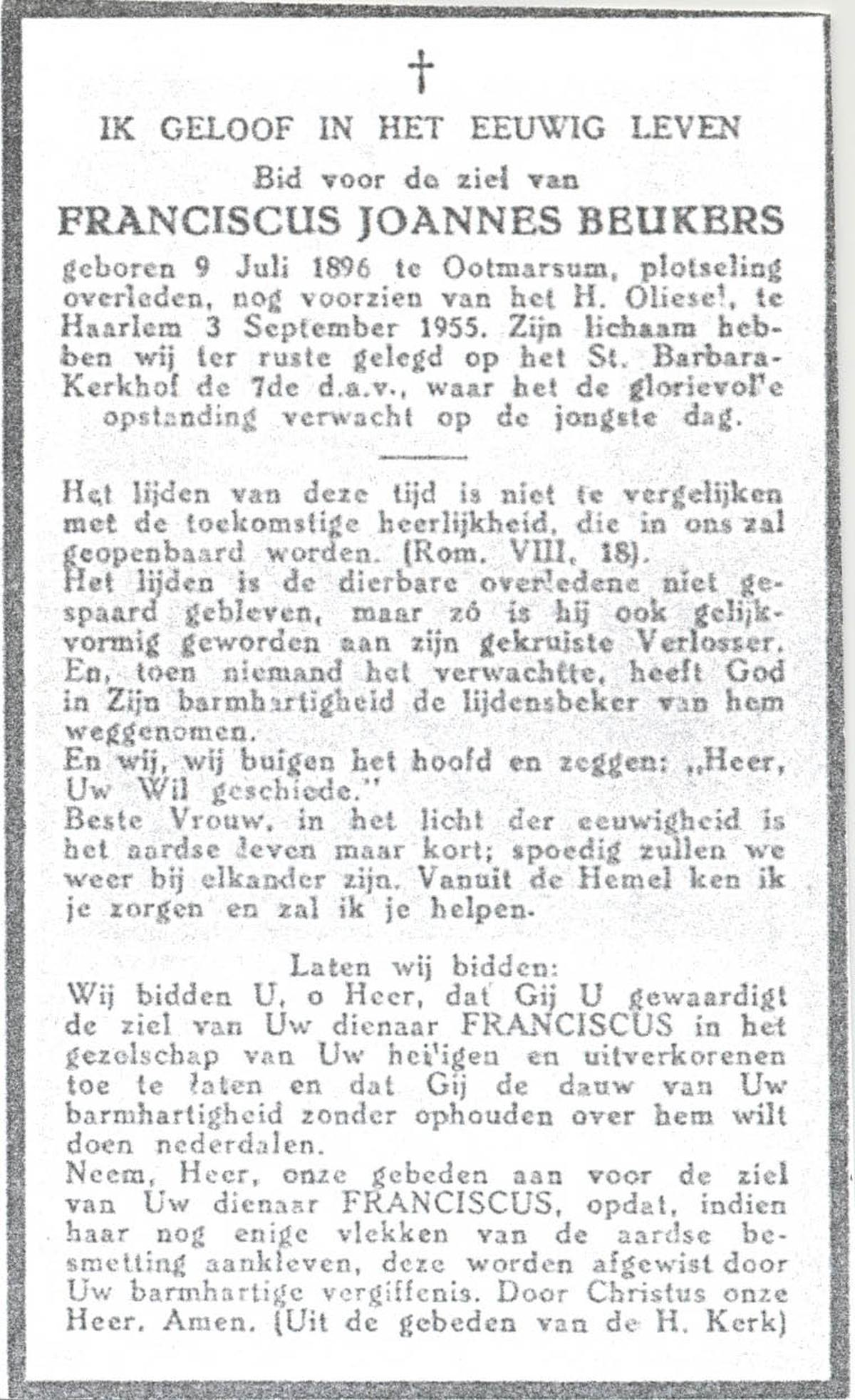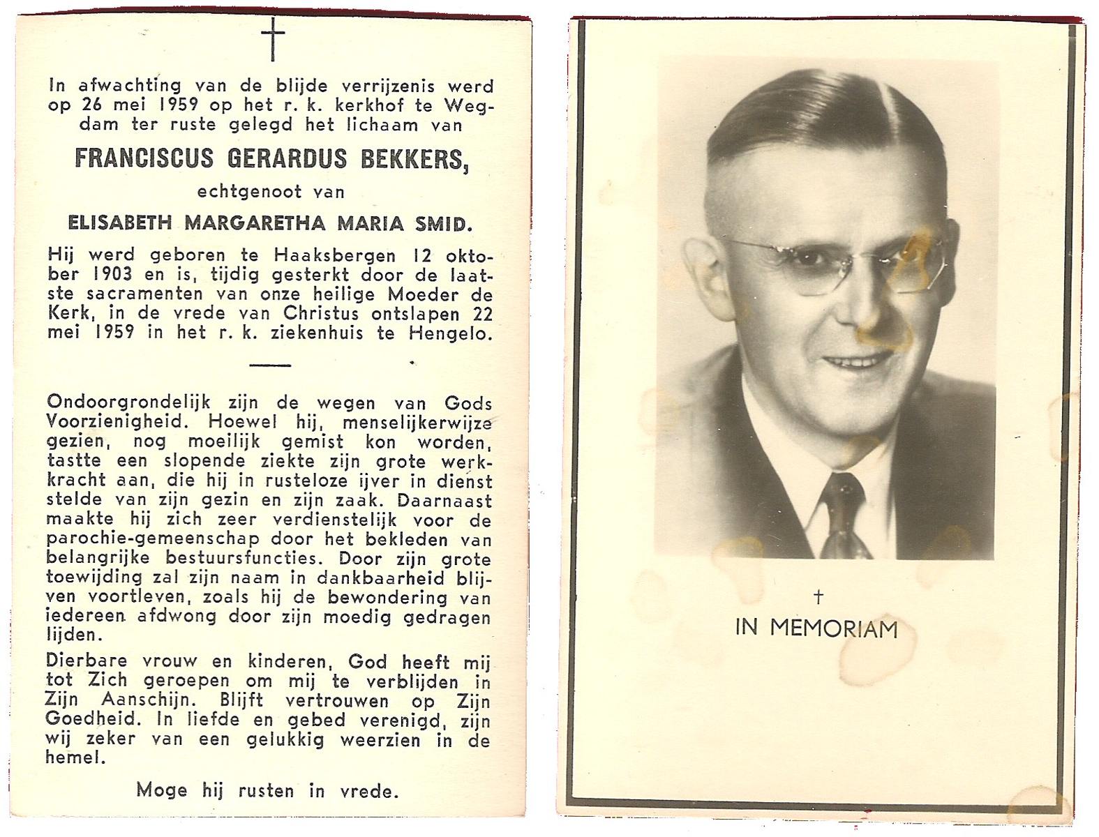 BEKKERS, Franciscus Gerardus, geboren op 12-10-1903 te Haaksbergen, overleden op 22-5-1959 te Hengelo (Ov.) op 55-jarige leeftijd.