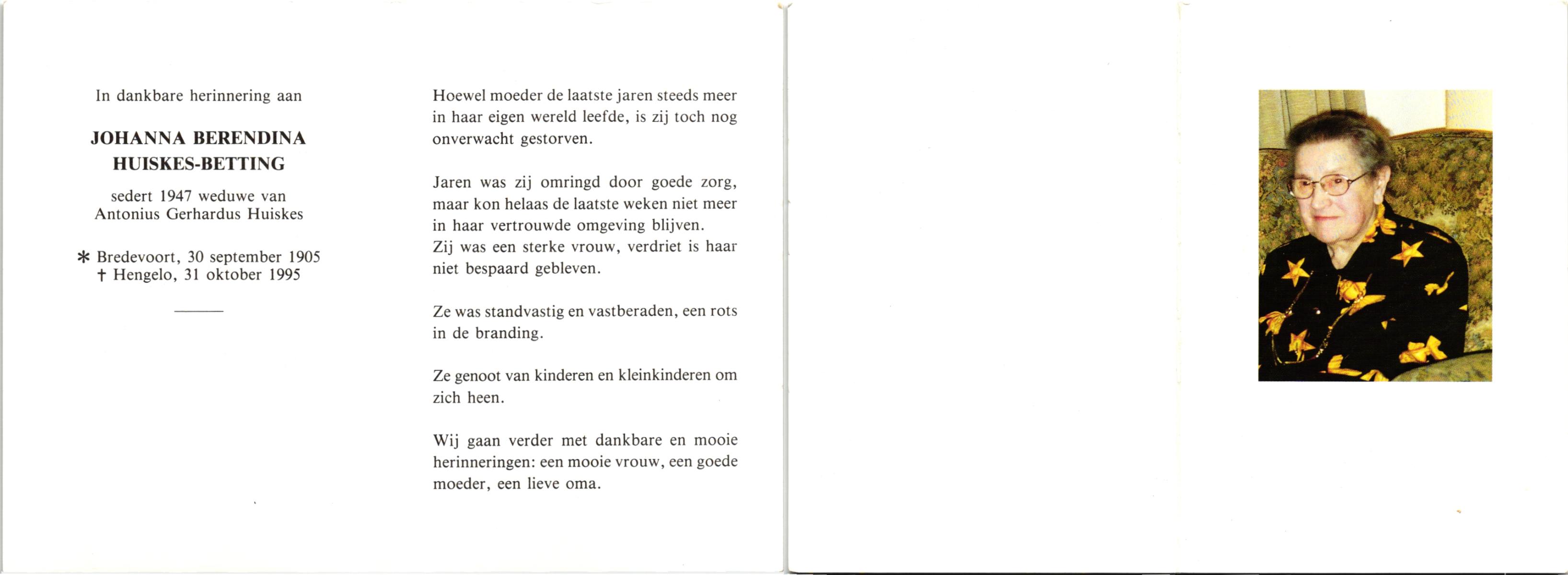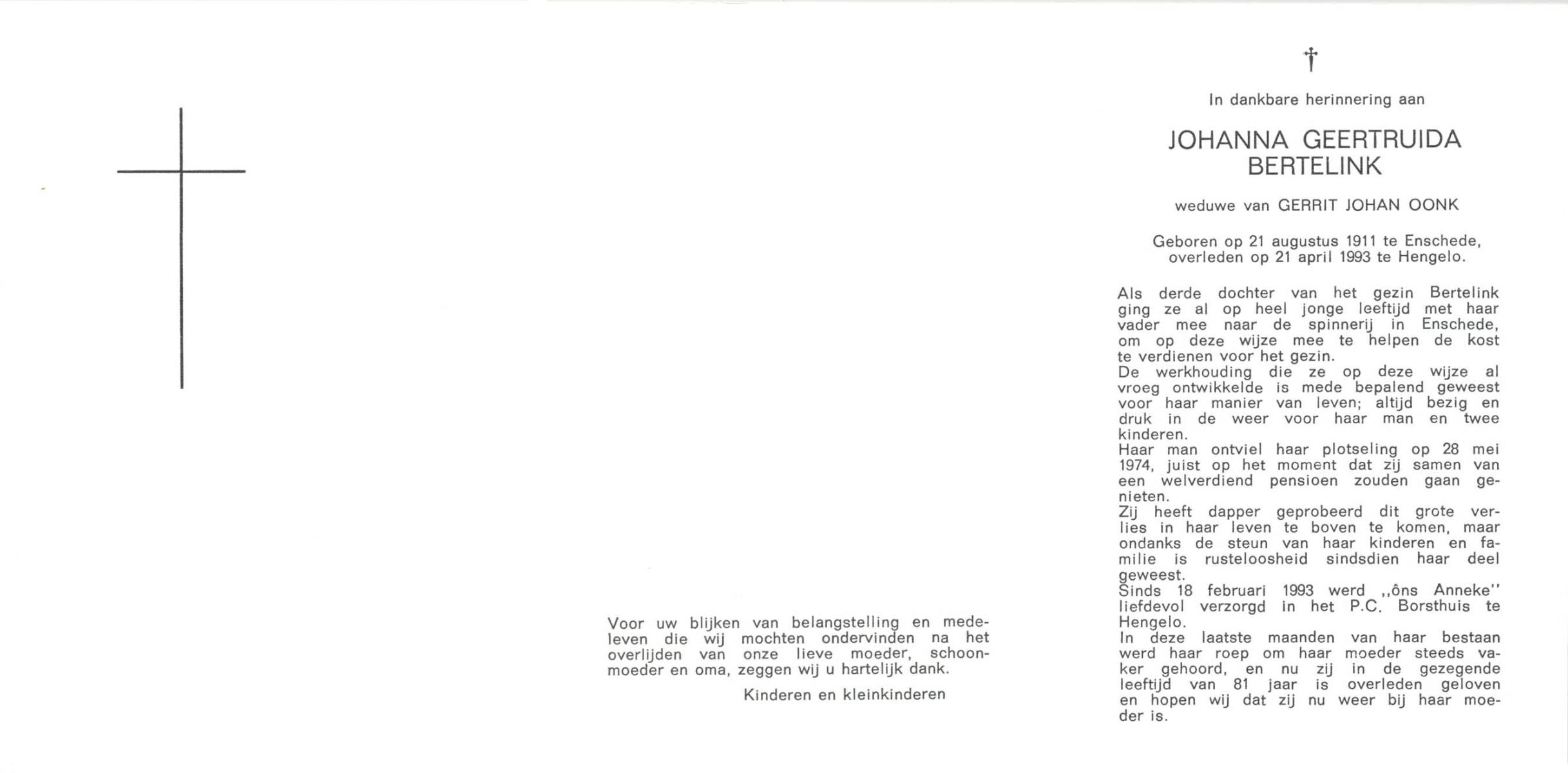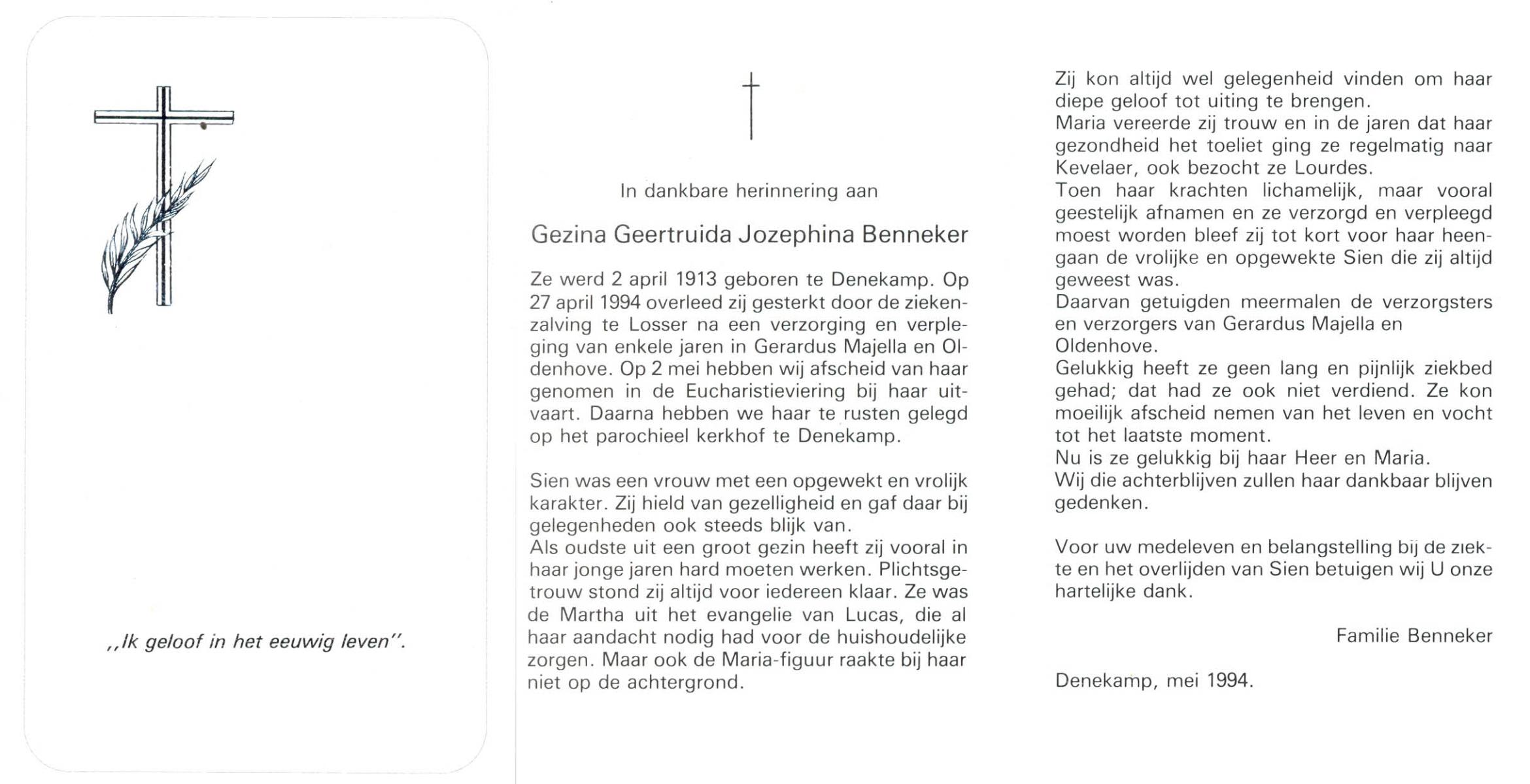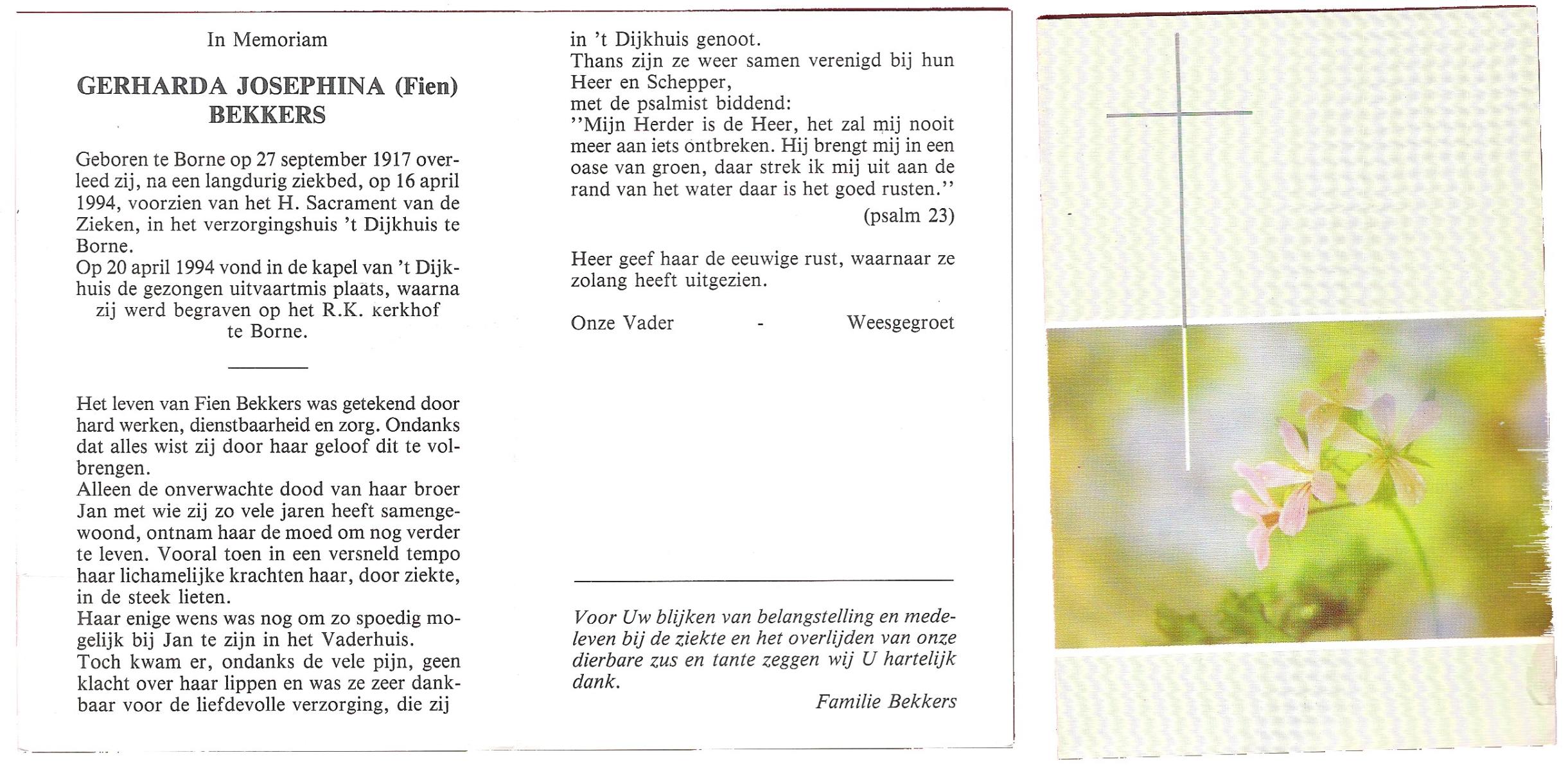 BEKKERS, Gerharda Josephina, geboren op 27-9-1917 te Borne, overleden op 16-4-1994 te Borne op 76-jarige leeftijd, begraven op 20-4-1994 te Borne.
