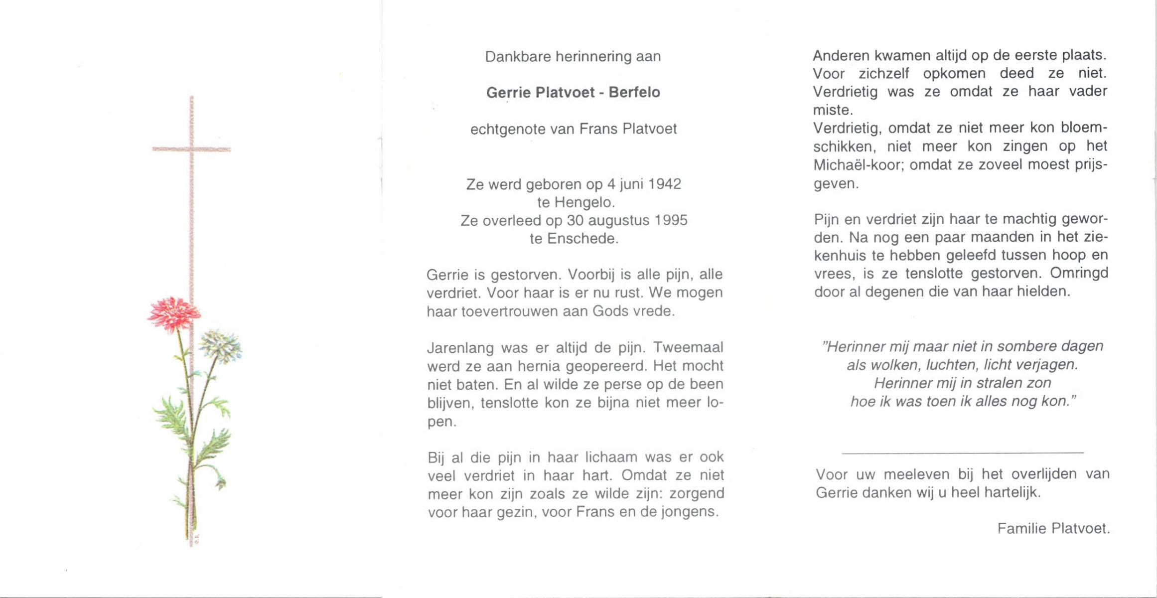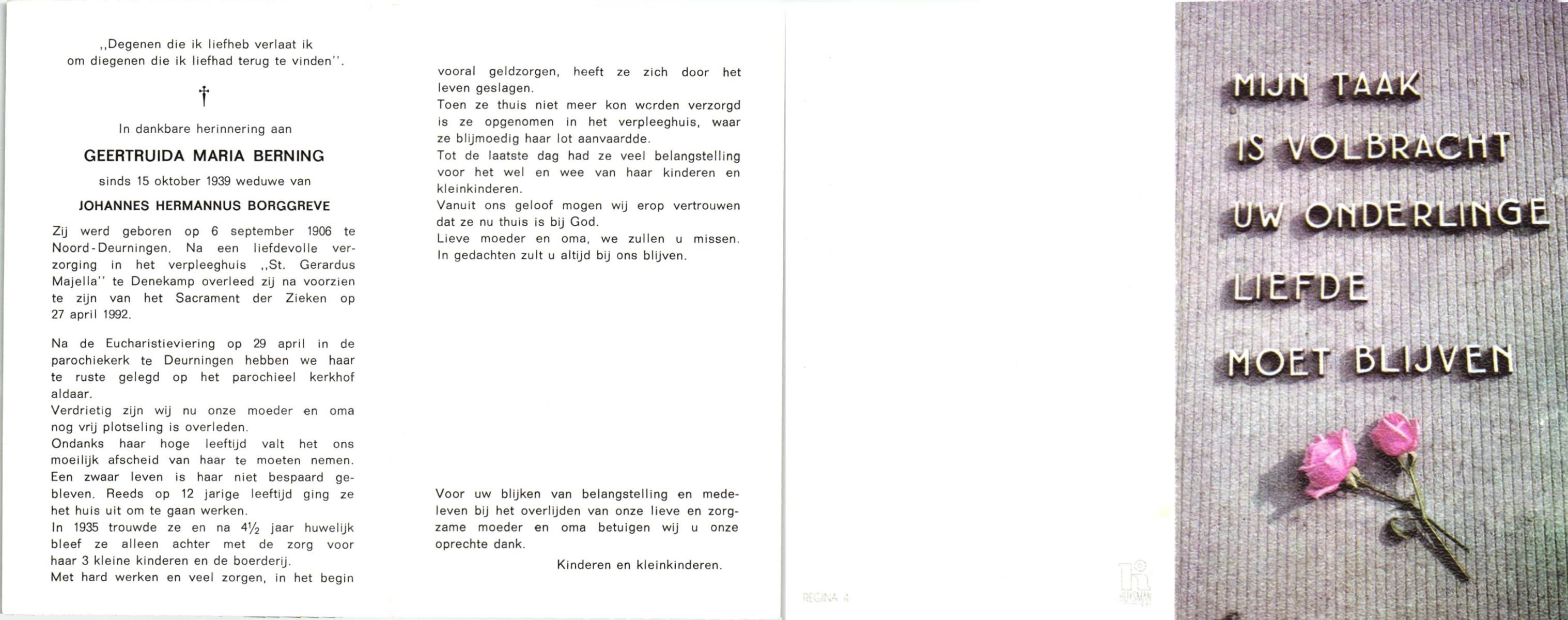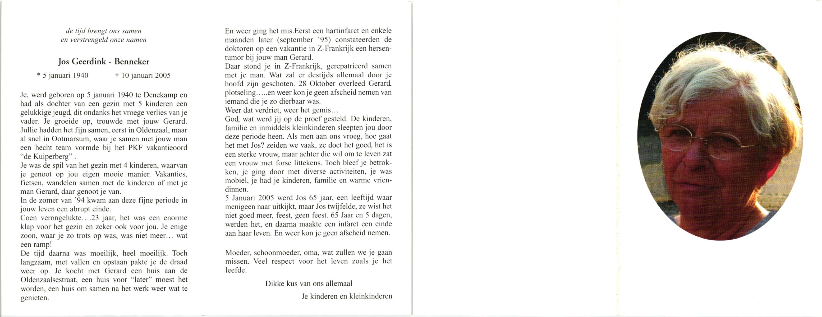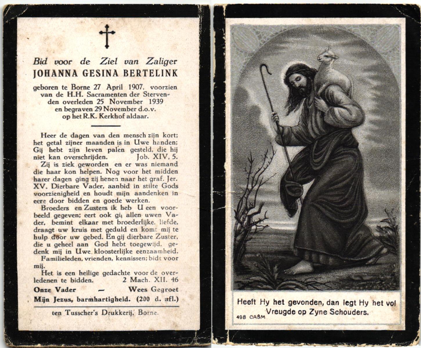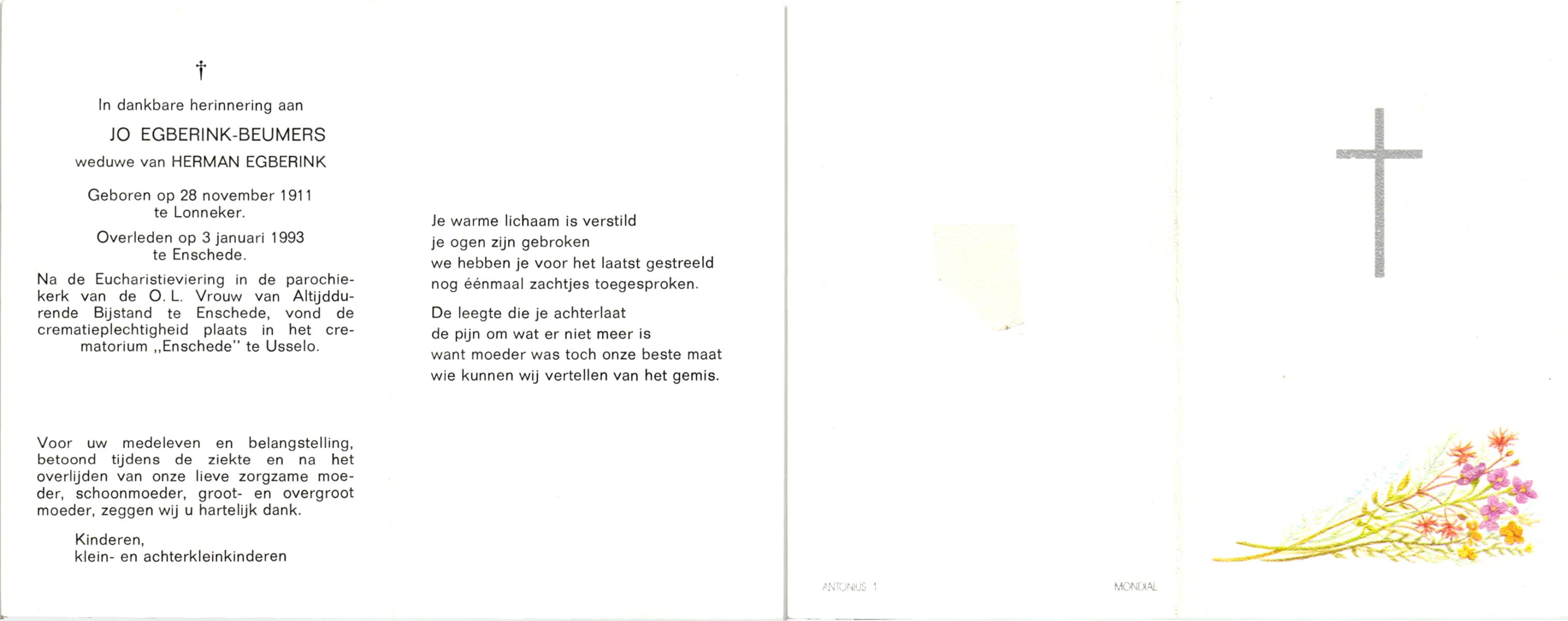 BEKKERS, Gerharda Josephina, geboren op 27-9-1917 te Borne, overleden op 16-4-1994 te Borne op 76-jarige leeftijd, begraven op 20-4-1994 te Borne.