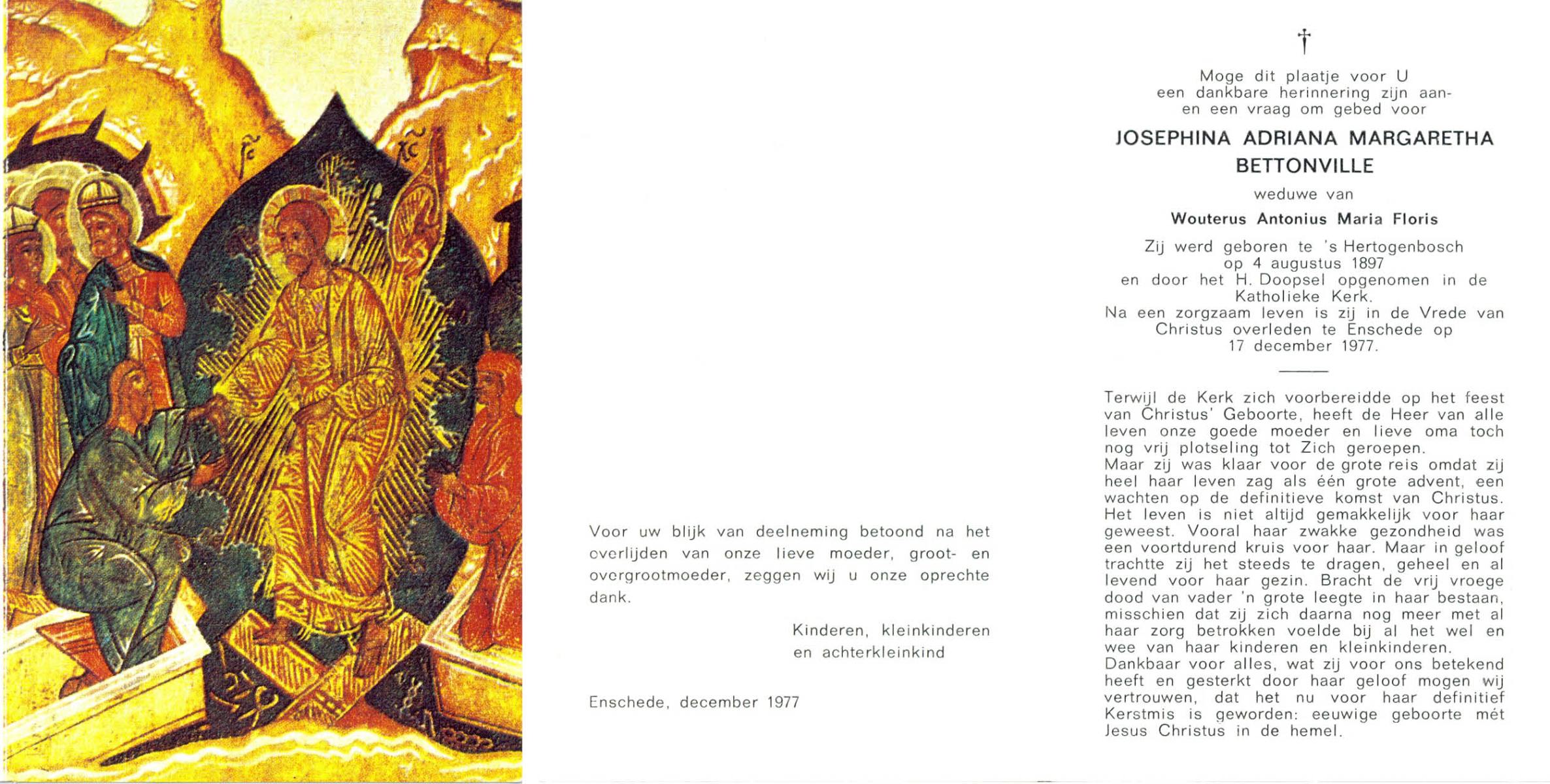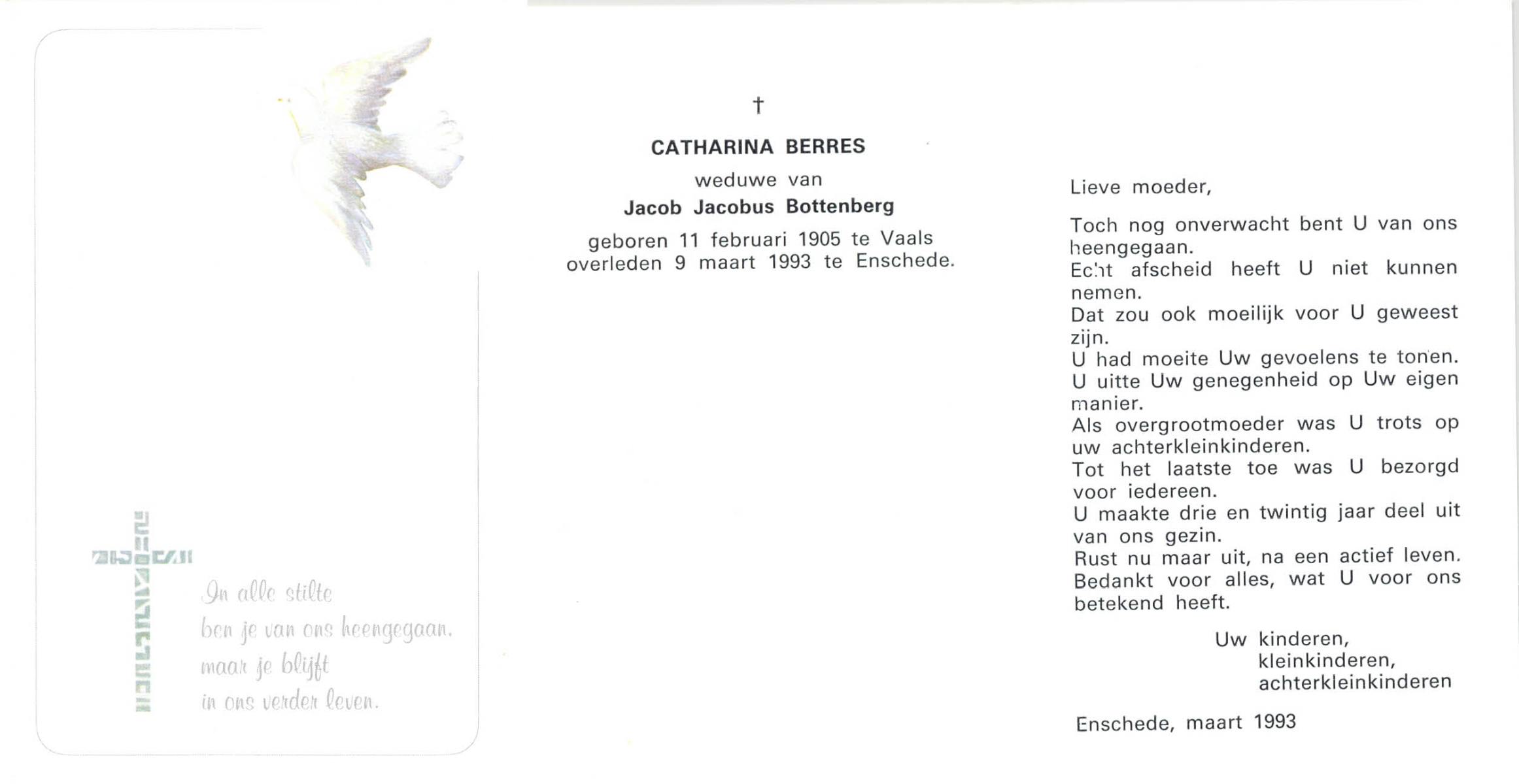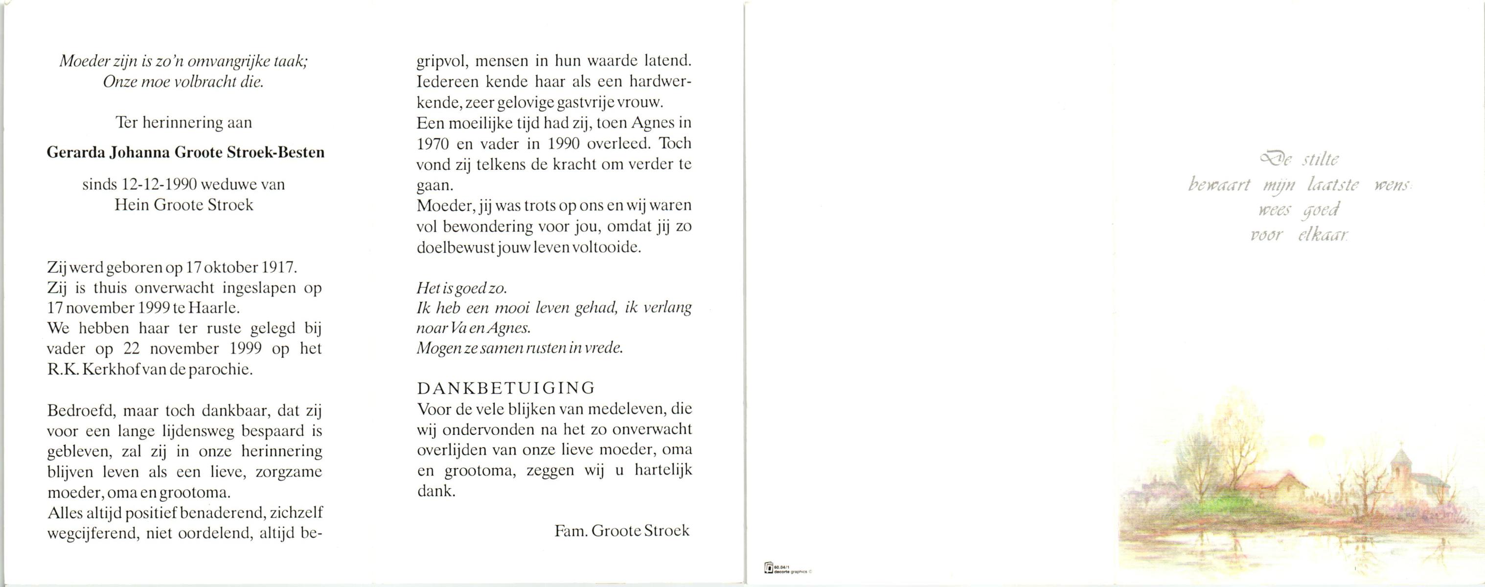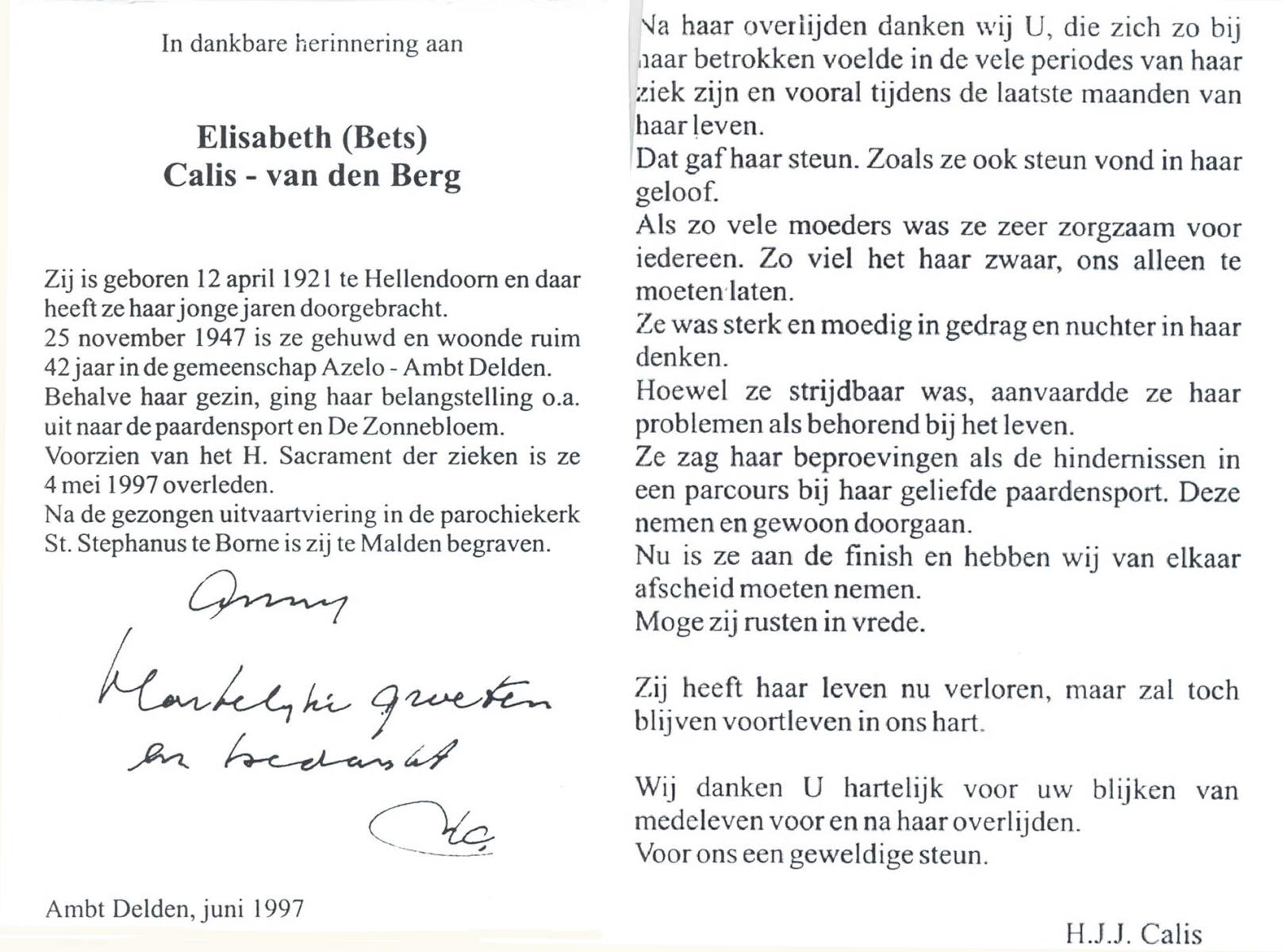 BEKKERS, Gerharda Josephina, geboren op 27-9-1917 te Borne, overleden op 16-4-1994 te Borne op 76-jarige leeftijd, begraven op 20-4-1994 te Borne.