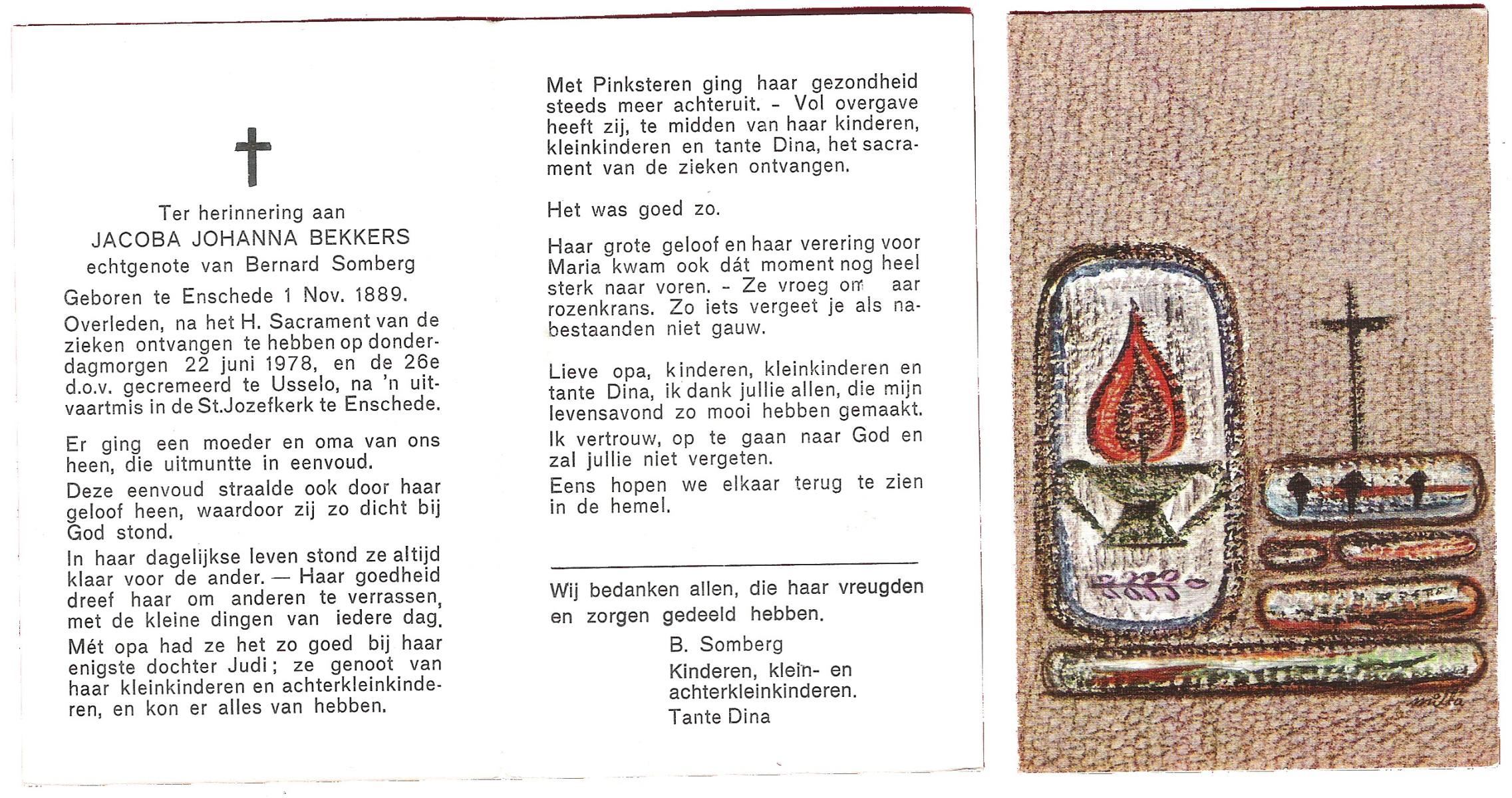 BEKKERS, Jacoba Johanna, geboren op 01-11-1889 te Enschede, overleden op 22-6-1978 op 88-jarige leeftijd, gecremeerd op 26-6-1978 te Usselo.