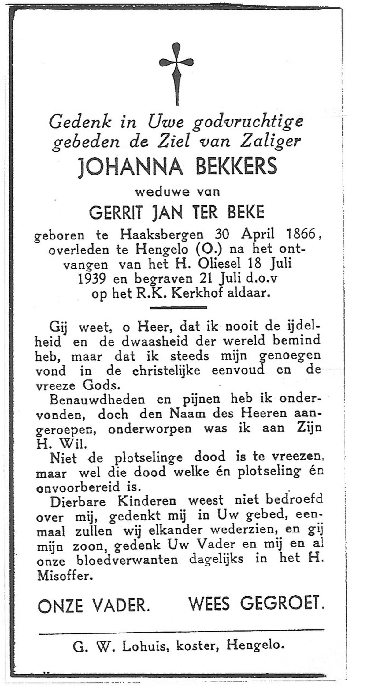 BEKKERS, Johanna, geboren op 30-04-1866 te Haaksbergen, overleden op 18-7-1939 te Hengelo (Ov.) op 73-jarige leeftijd, begraven op 21-7-1939 te Hengelo (Ov.).