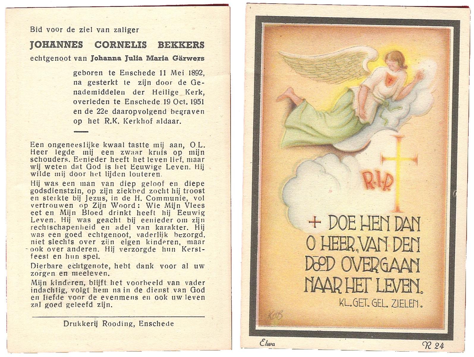 BEKKERS, Johannes Cornelis, geboren op 11-05-1892 te Enschede, overleden op 19-10-1951 te Enschede op 59-jarige leeftijd, begraven op 22-10-1951 te Enschede.