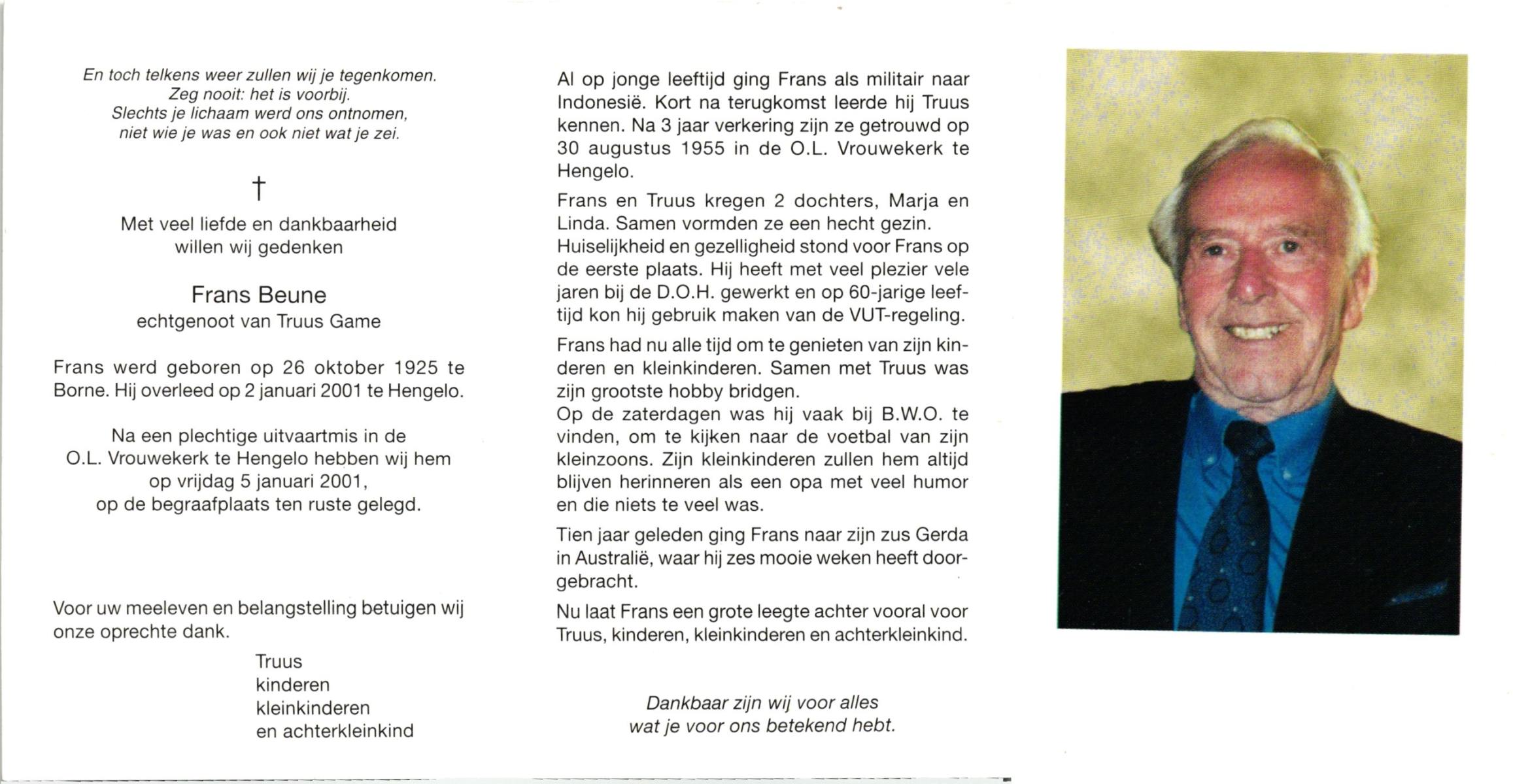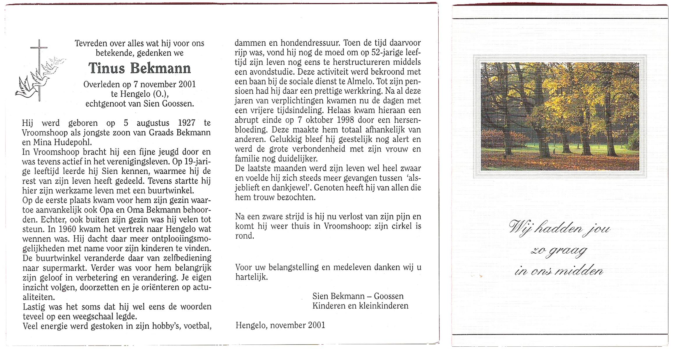 BEKMAN, Tinus, geboren op 5-8-1927 te Vroomshoop, overleden op 7-11-2001 te Hengelo (Ov.) op 74-jarige leeftijd.