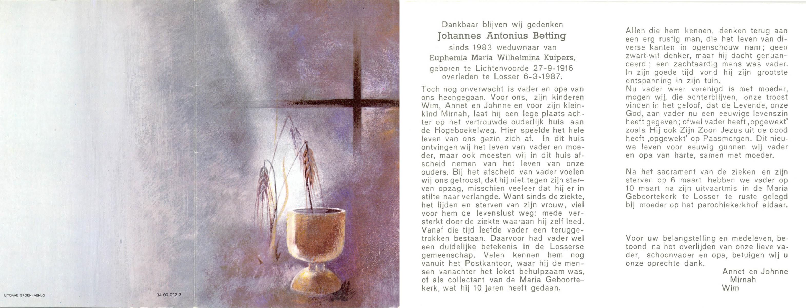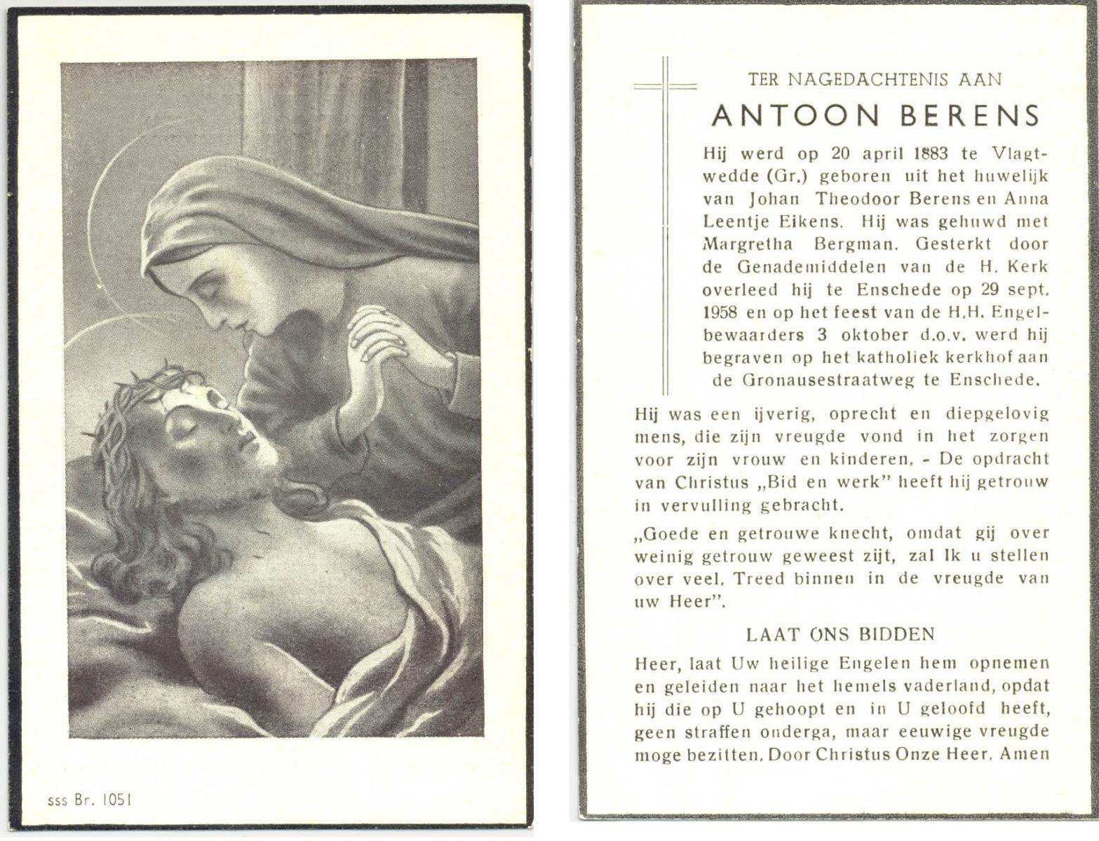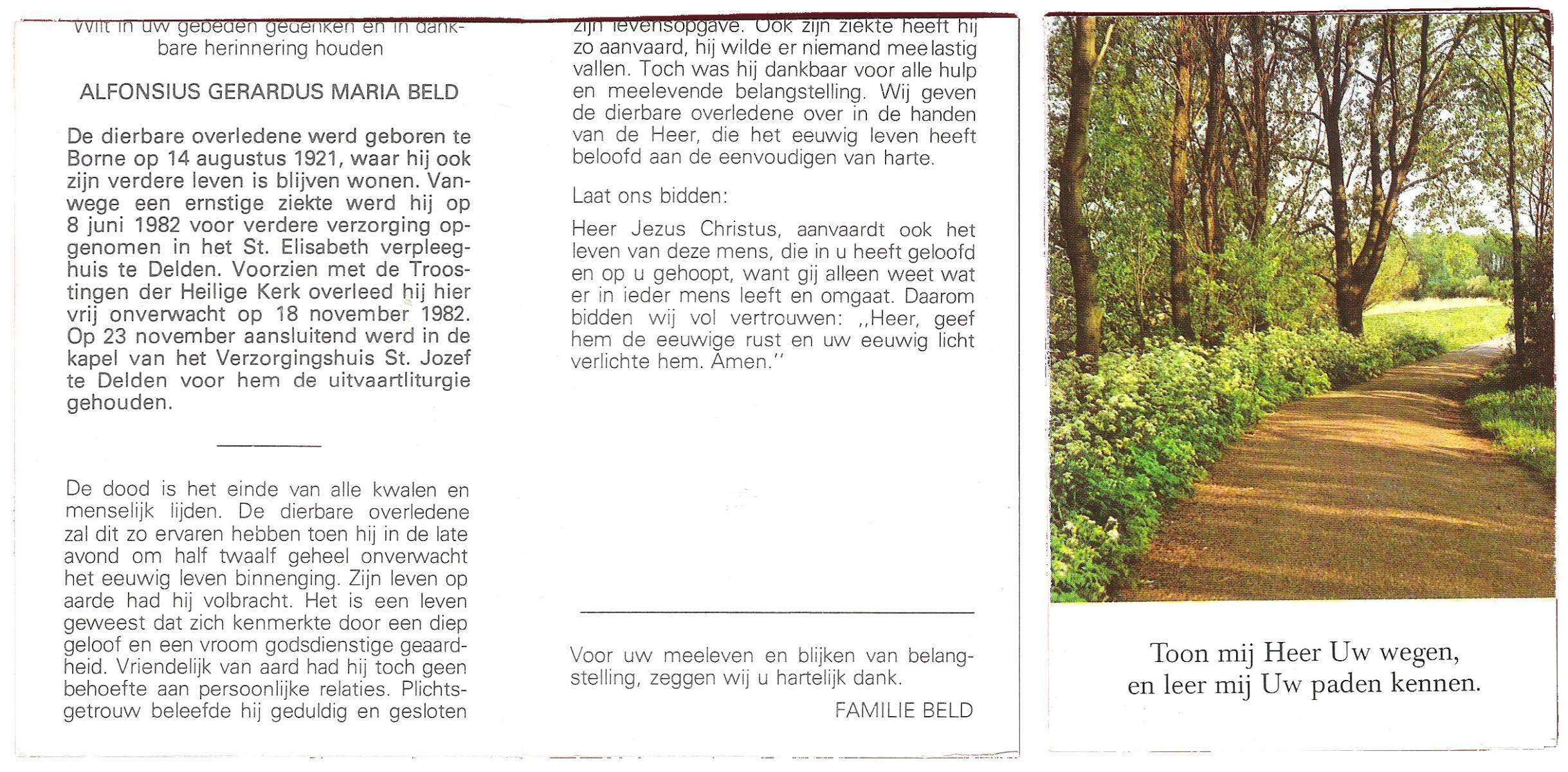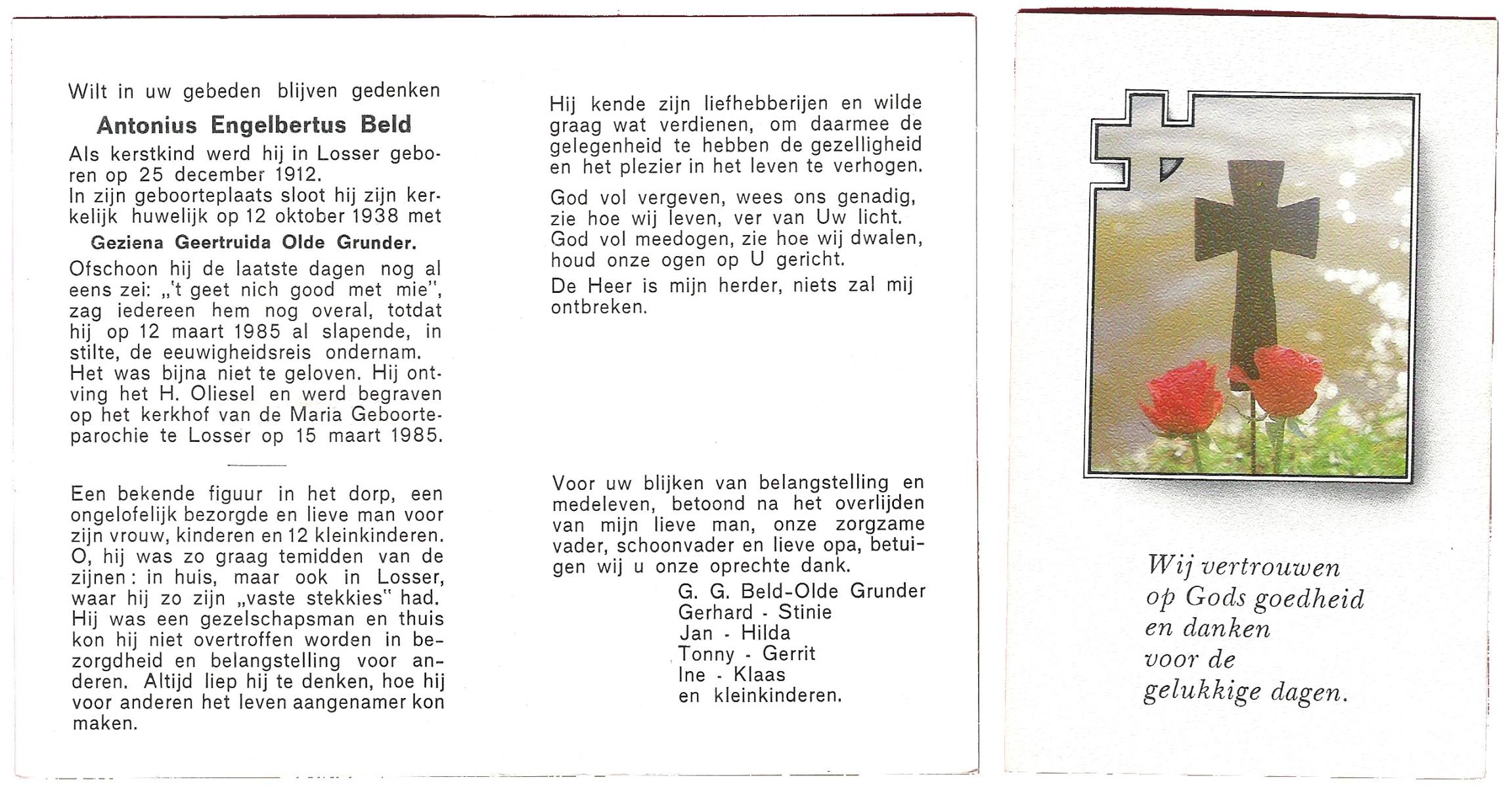 BELD, Antonius Engelbertus, geboren op 25-12-1912 te Losser, overleden op 12-3-1985 te Losser op 72-jarige leeftijd, begraven op 15-3-1985 te Losser.