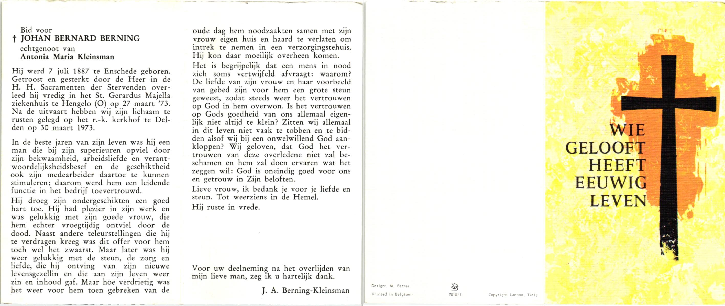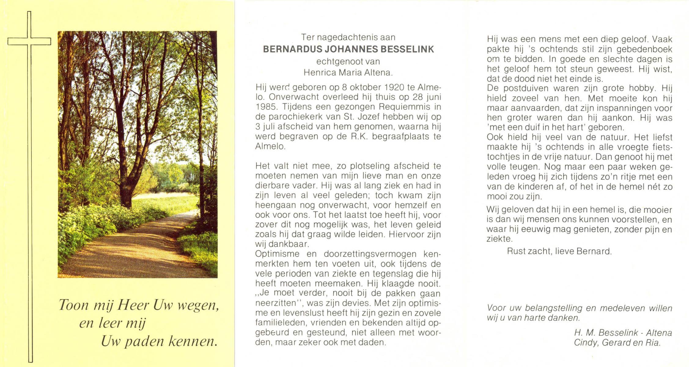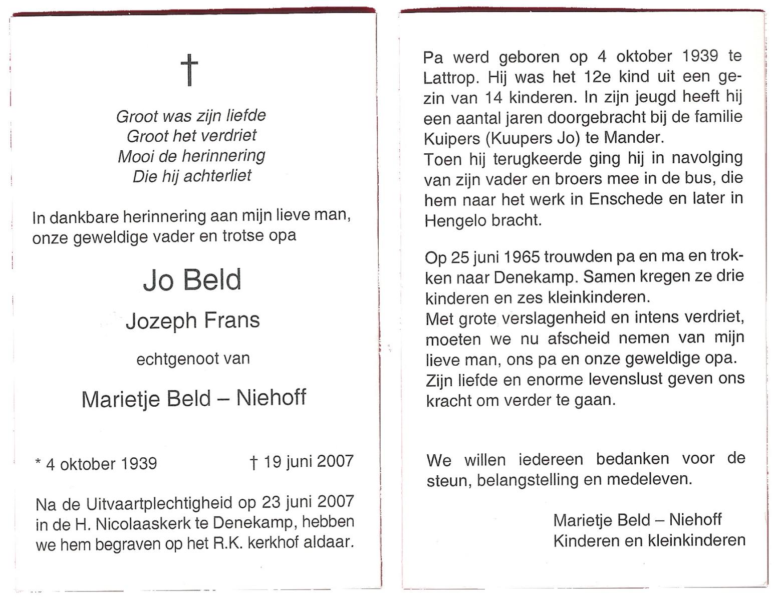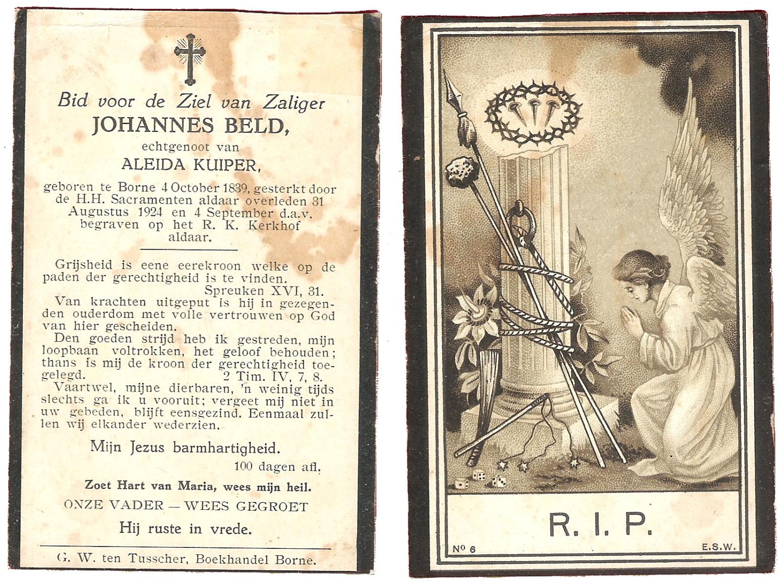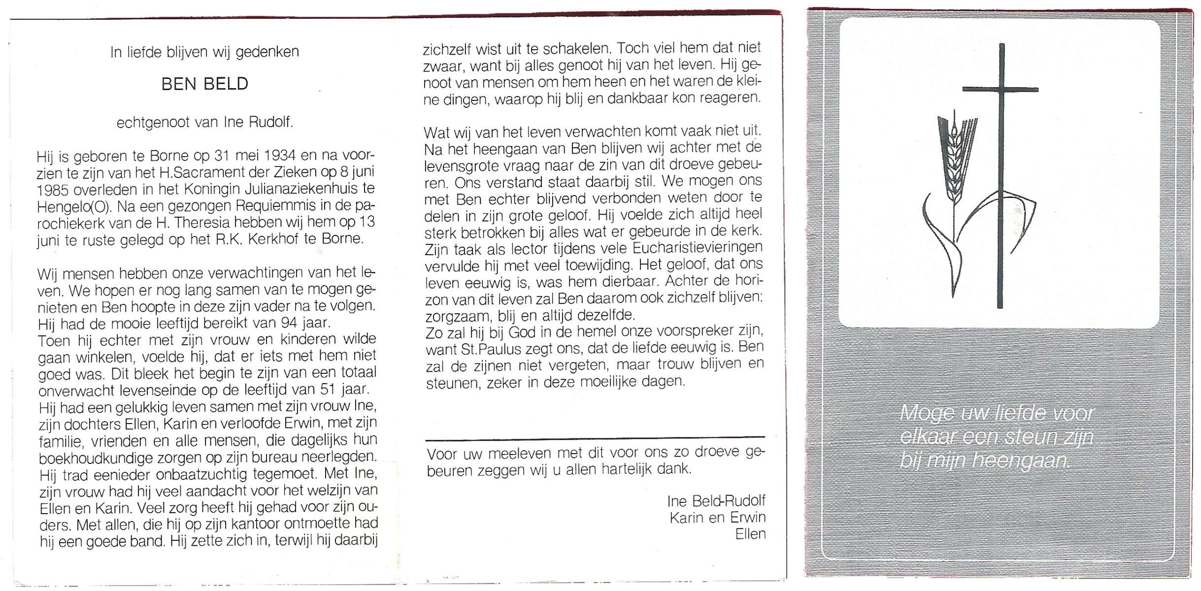 BELD, Ben, geboren op 31-5-1934 te Borne, overleden op 8-6-1985 te Hengelo (Ov.) op 51-jarige leeftijd, begraven op 13-6-1985 te Borne.