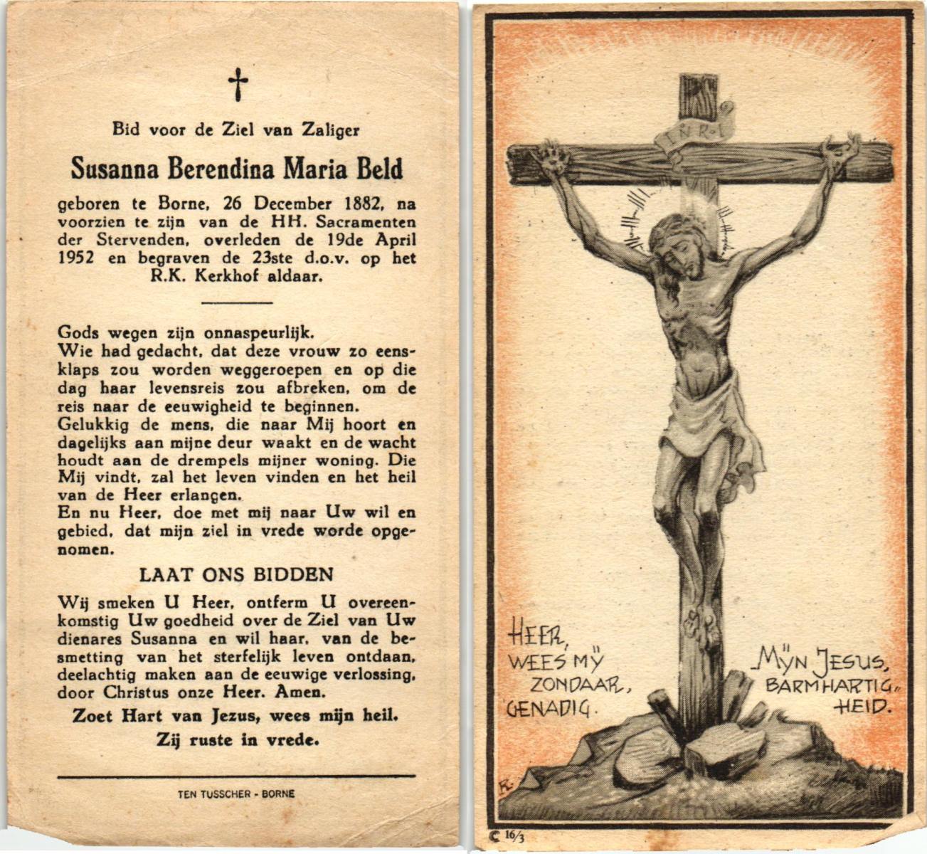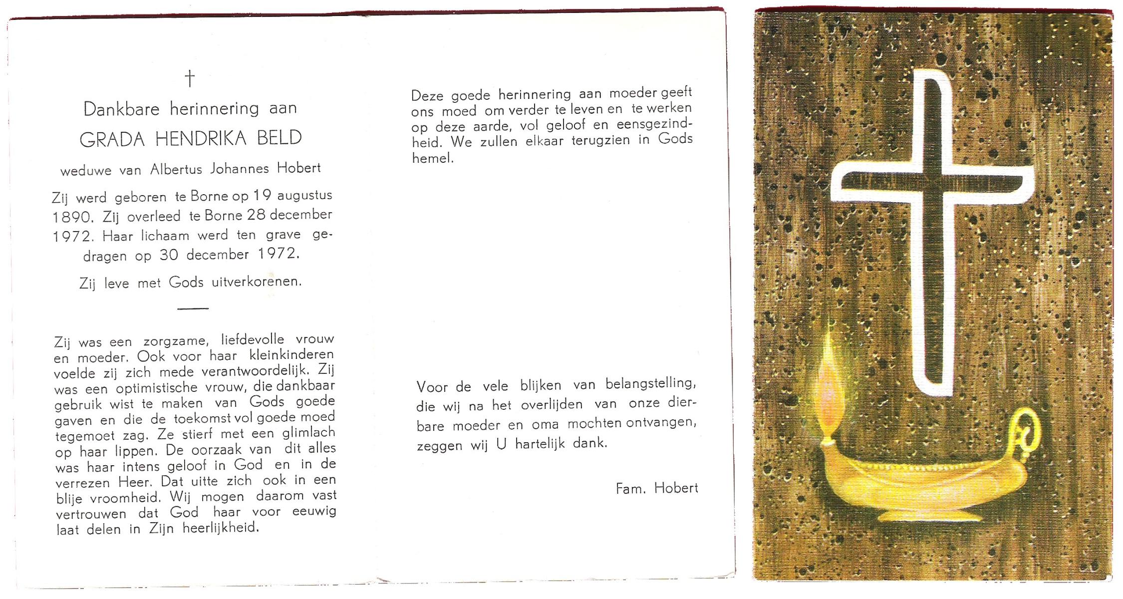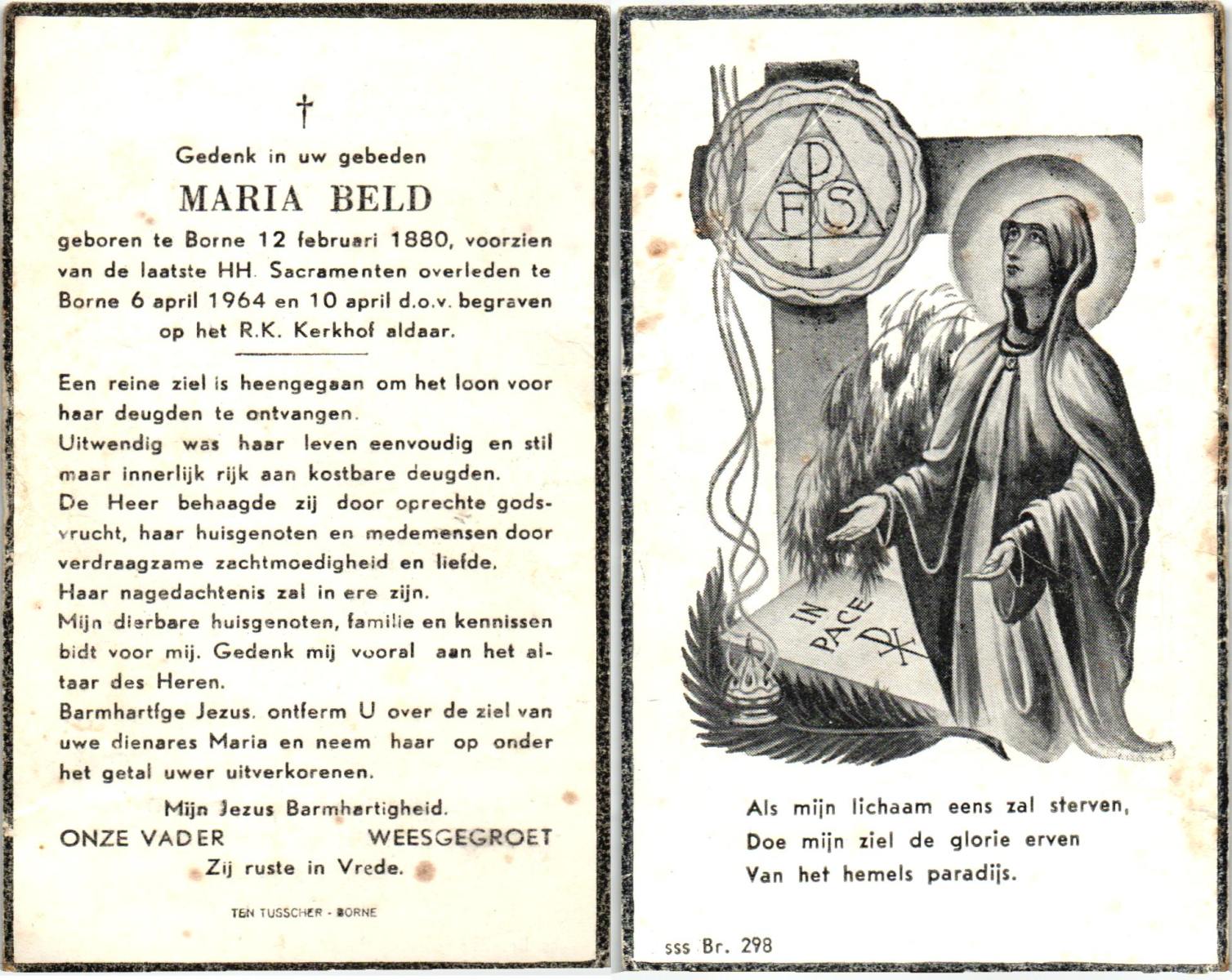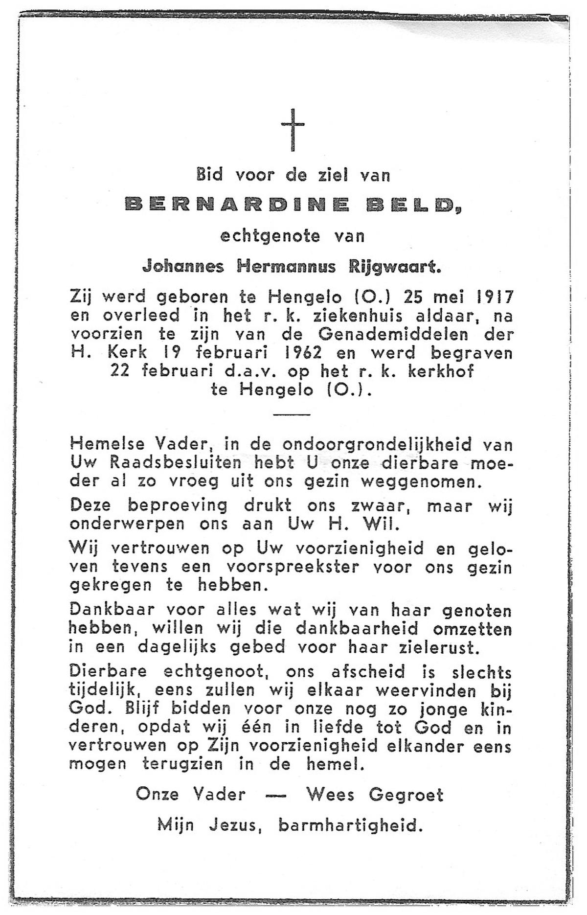 BELD, Bernardine, geboren op 25-5-1917 te Hengelo (O), overleden op 19-2-1962 te Hengelo (Ov.) op 44-jarige leeftijd, begraven op 22-2-1962 te Hengelo (Ov.).