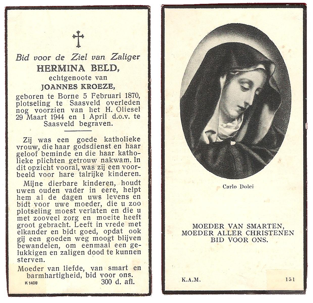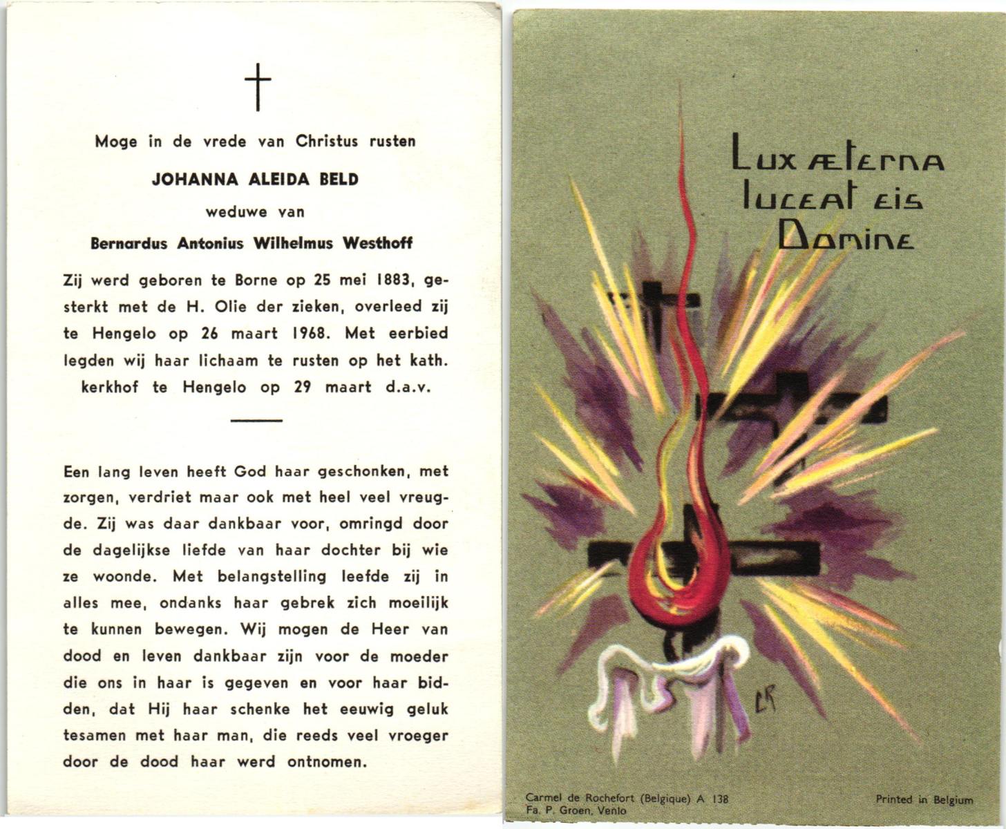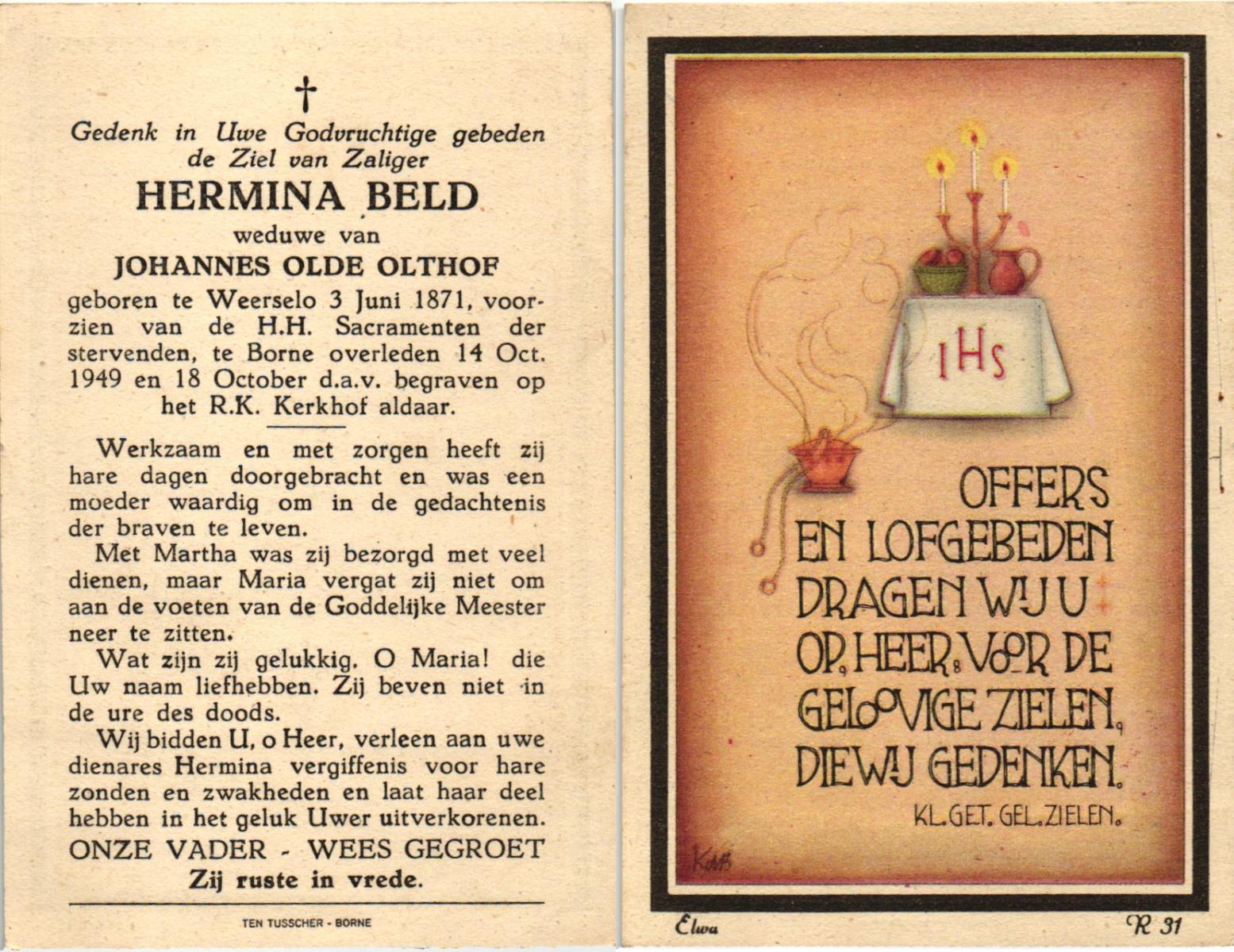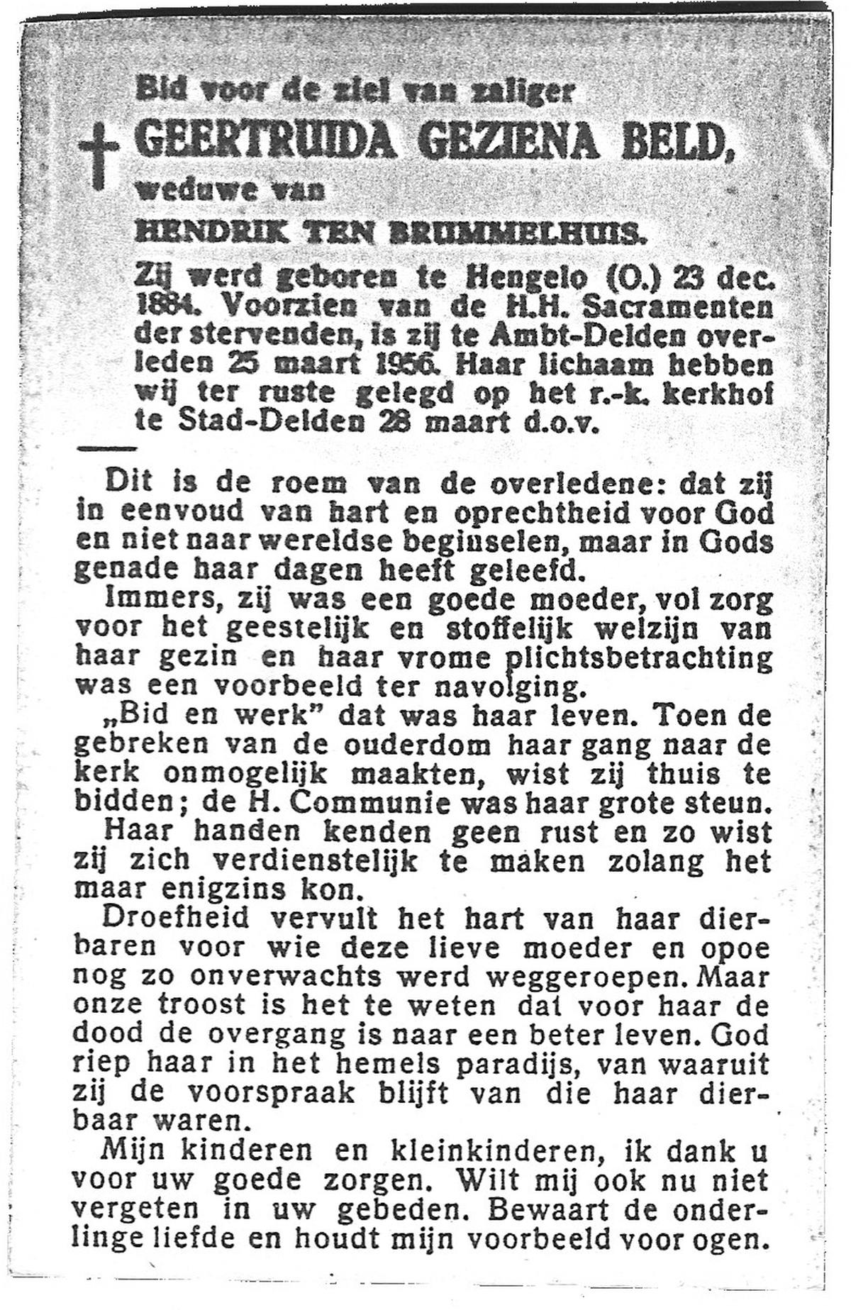 BELD, Bernardine, geboren op 25-5-1917 te Hengelo (O), overleden op 19-2-1962 te Hengelo (Ov.) op 44-jarige leeftijd, begraven op 22-2-1962 te Hengelo (Ov.).