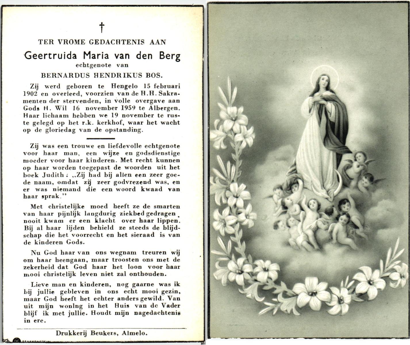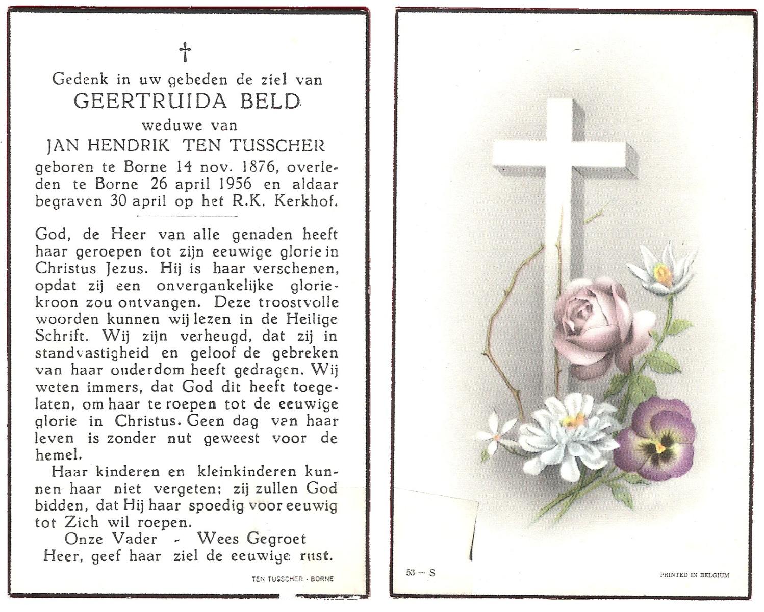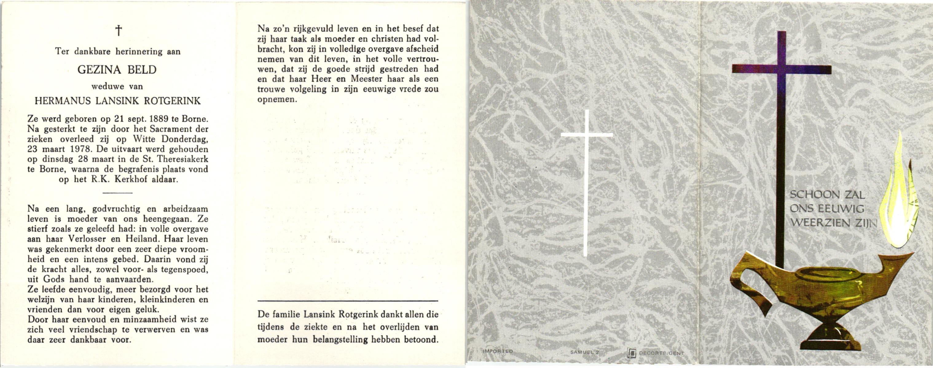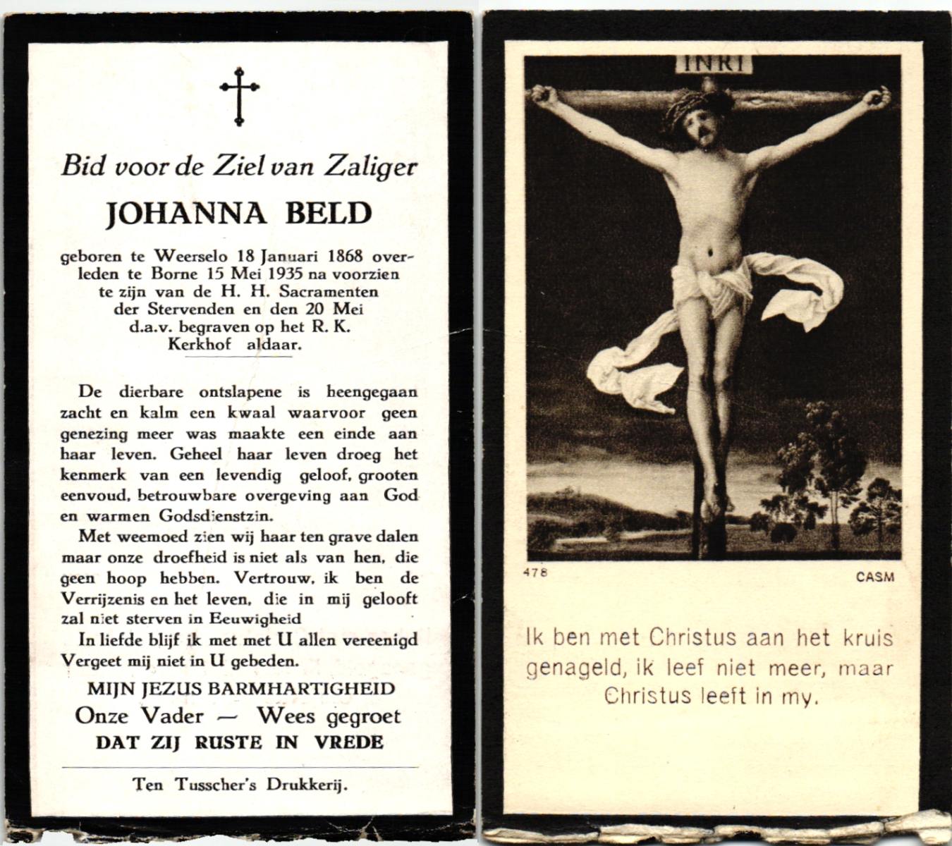 BELD, Bernardine, geboren op 25-5-1917 te Hengelo (O), overleden op 19-2-1962 te Hengelo (Ov.) op 44-jarige leeftijd, begraven op 22-2-1962 te Hengelo (Ov.).