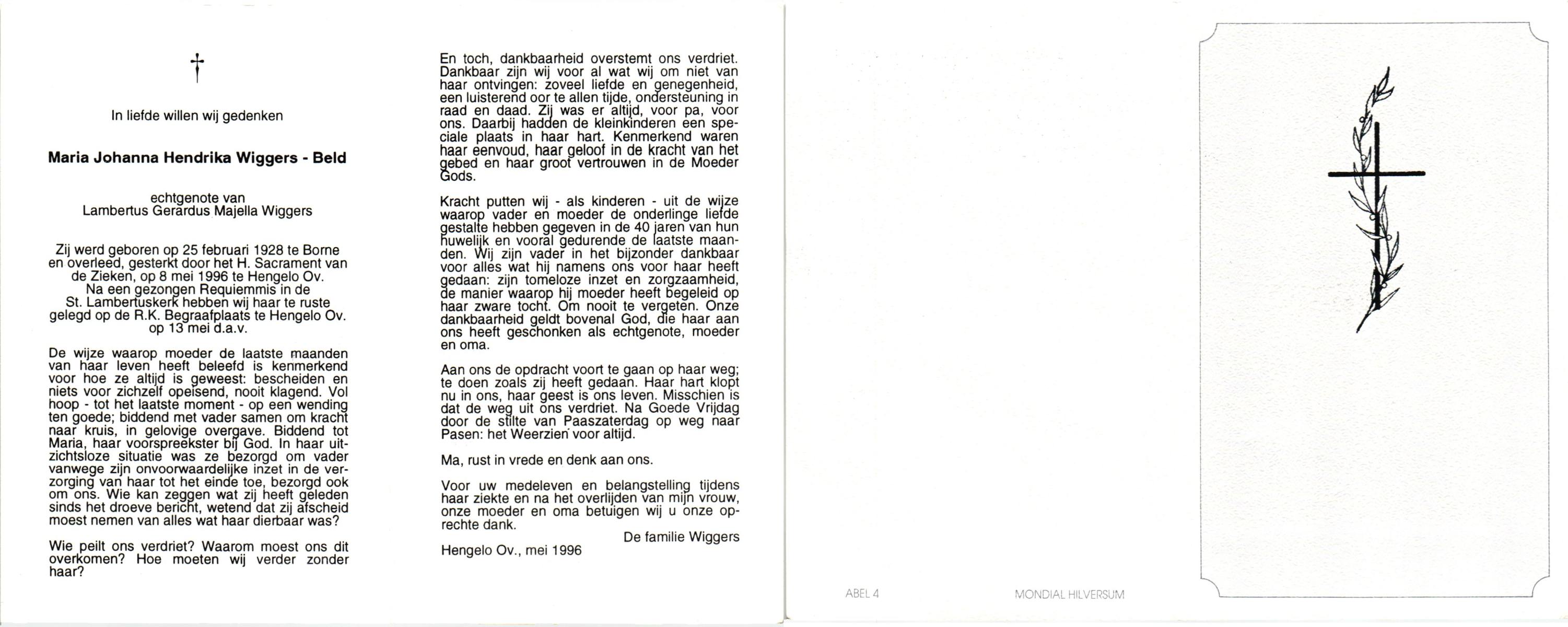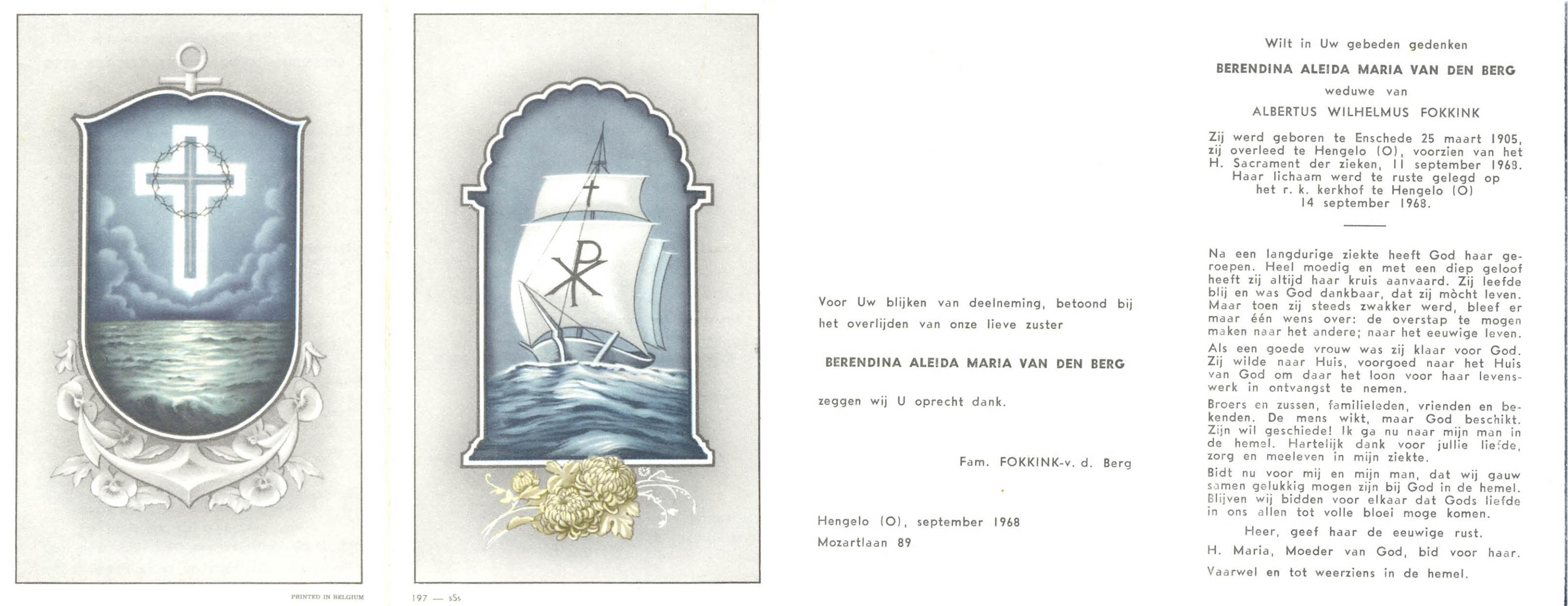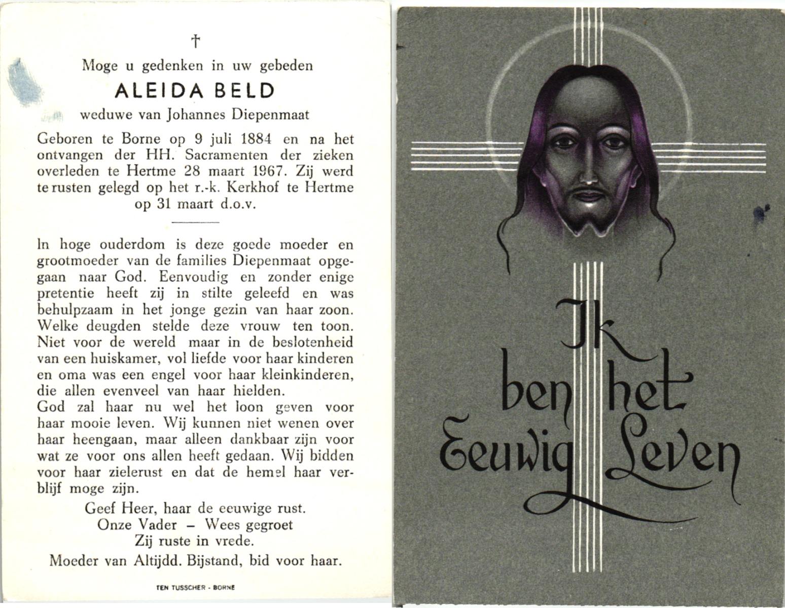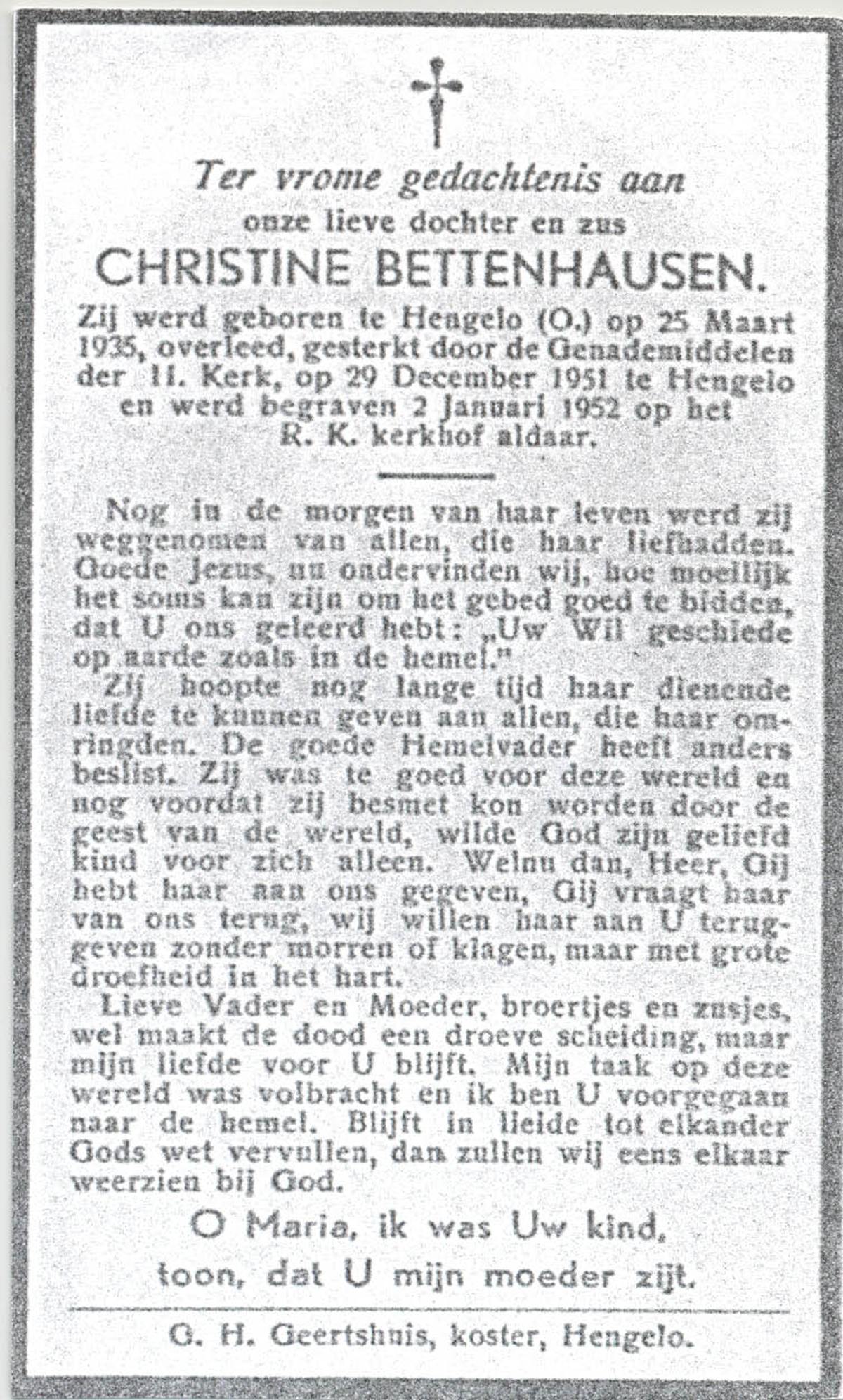 BELD, Bernardine, geboren op 25-5-1917 te Hengelo (O), overleden op 19-2-1962 te Hengelo (Ov.) op 44-jarige leeftijd, begraven op 22-2-1962 te Hengelo (Ov.).