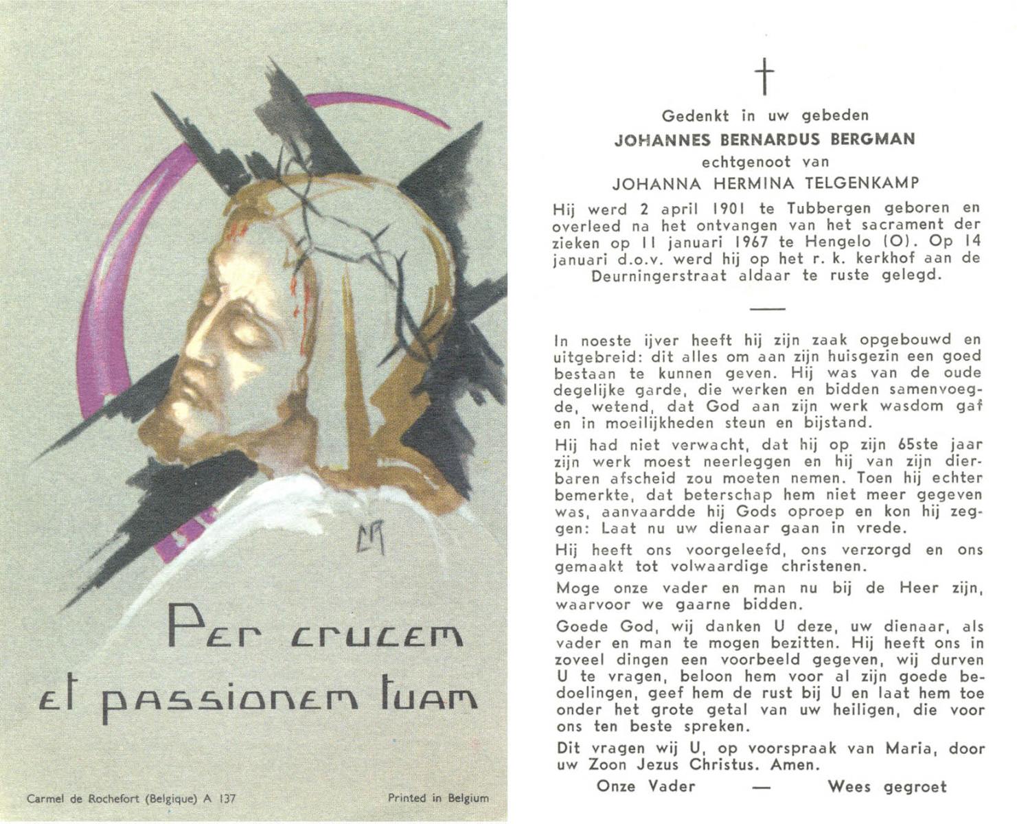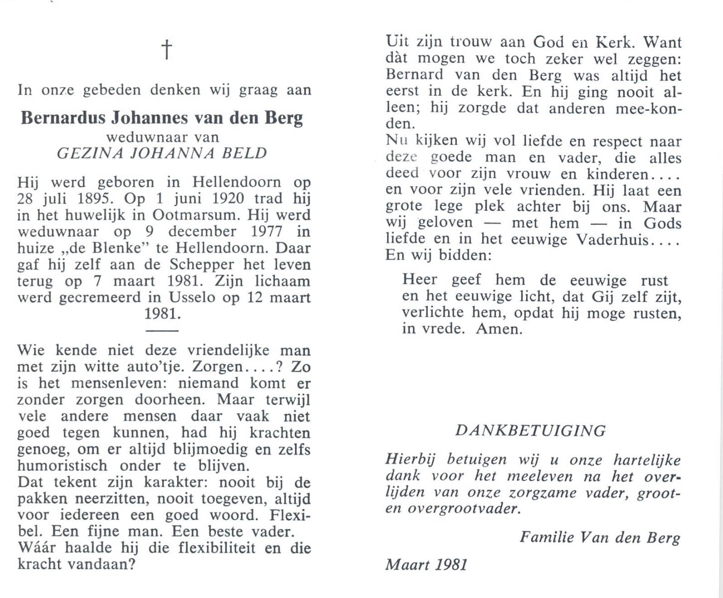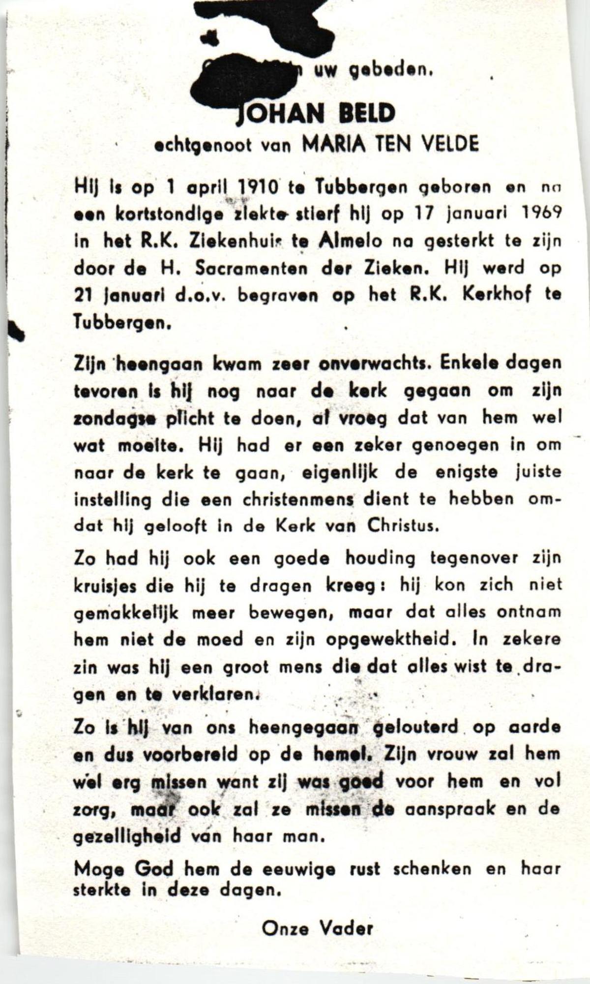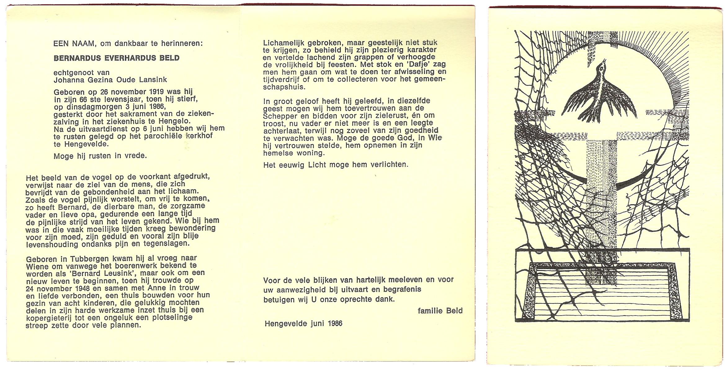 BELD, Bernardus Everhardus, geboren op 26-11-1919 te Tubbergen, overleden op 3-6-1986 te Hengelo (Ov.) op 66-jarige leeftijd, begraven op 6-6-1986 te Hengevelde.