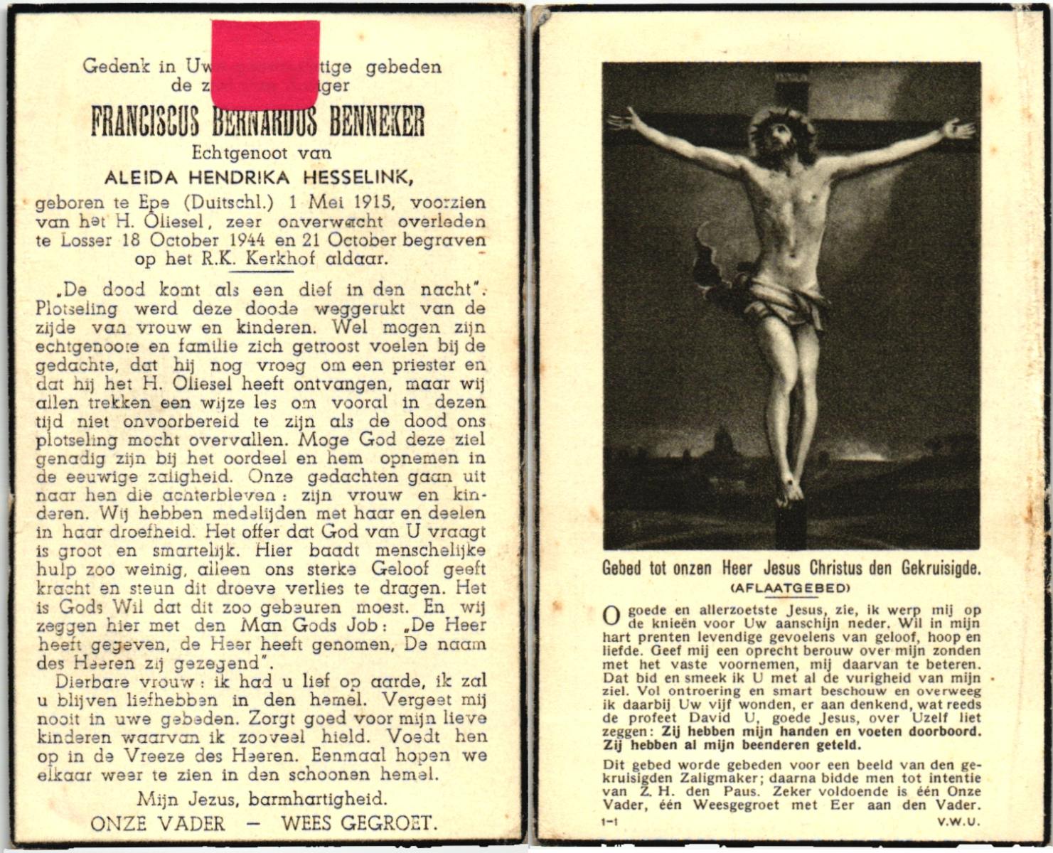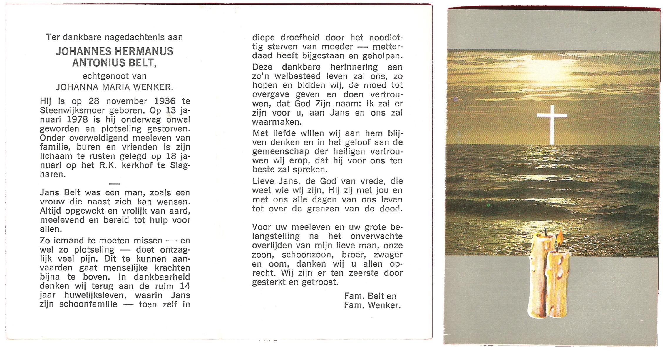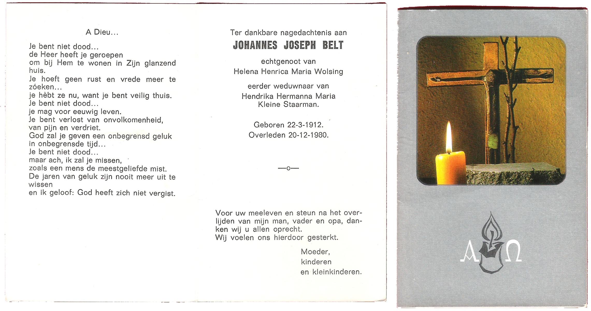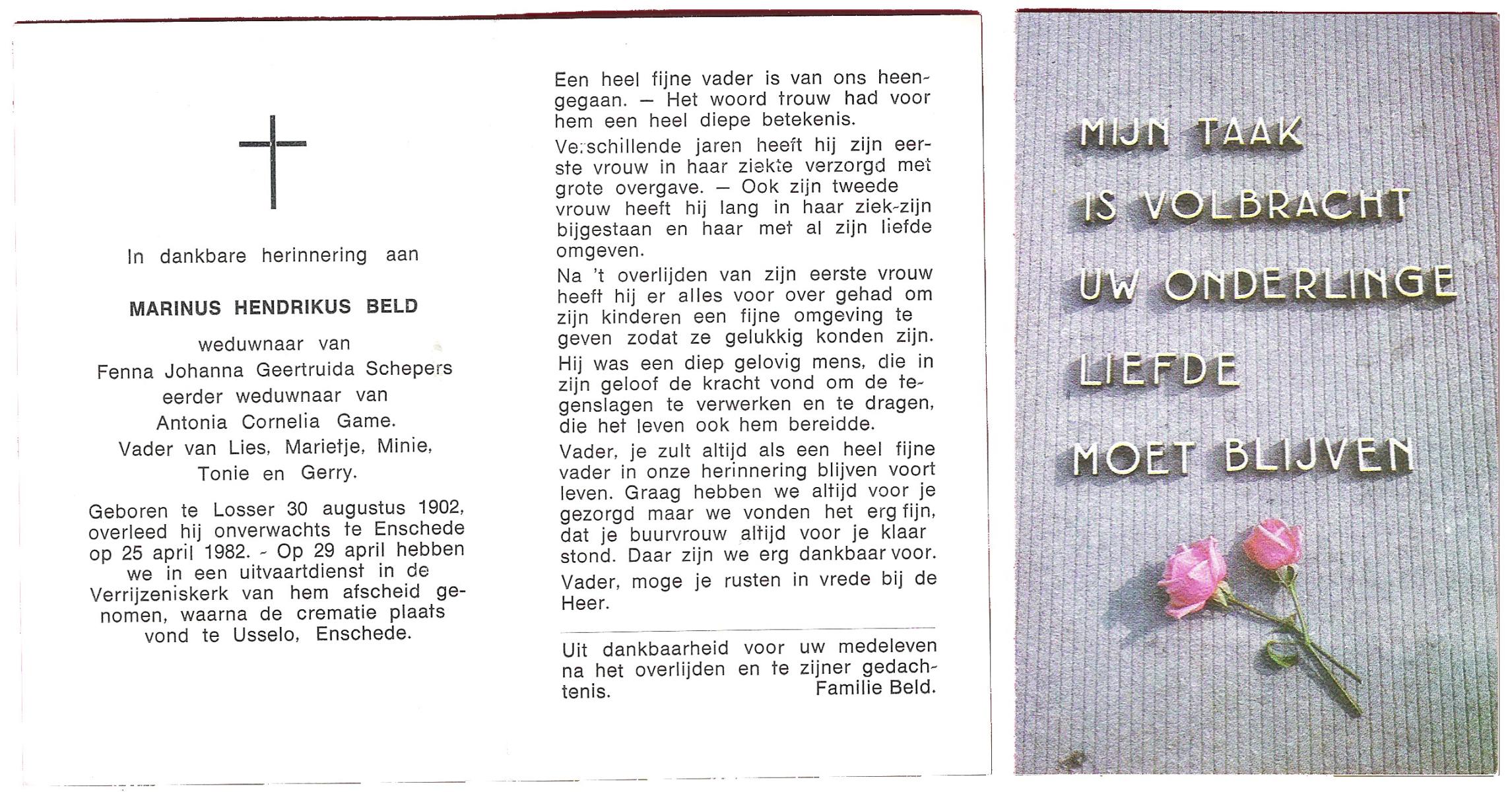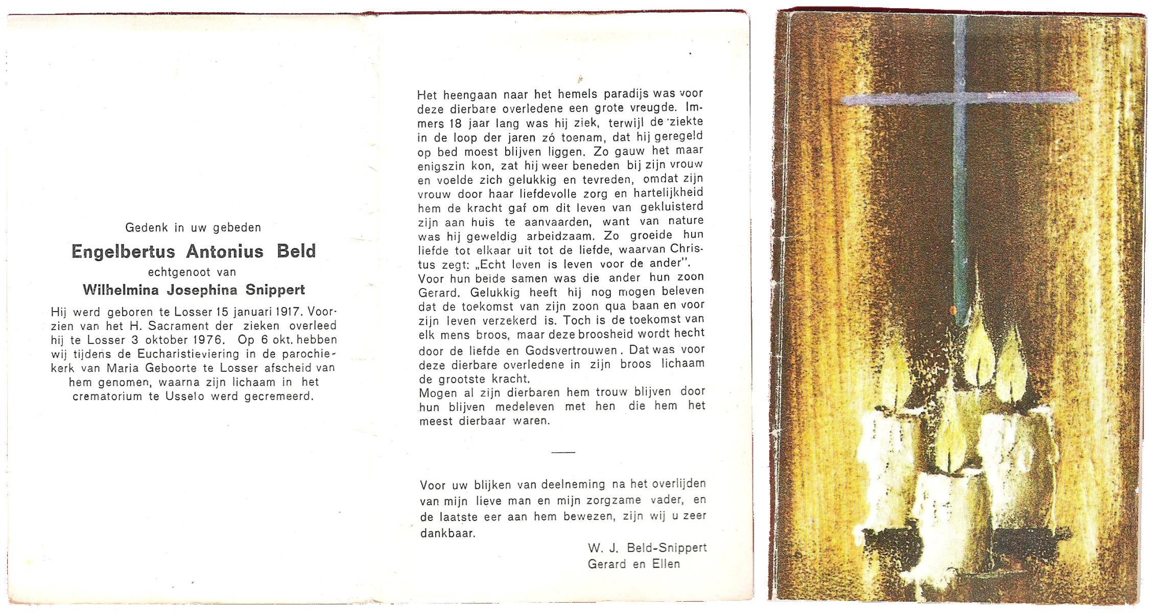 BELD, Engelbertus Antonius, geboren op 15-1-1917 te Losser, overleden op 3-10-1976 te Losser op 59-jarige leeftijd, gecremeerd op 6-10-1976 te Usselo.
