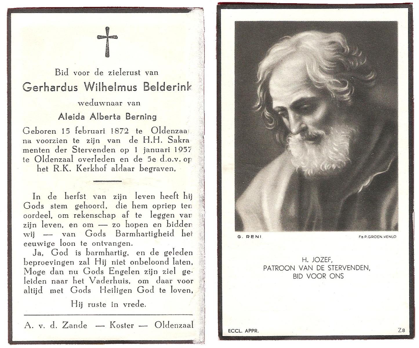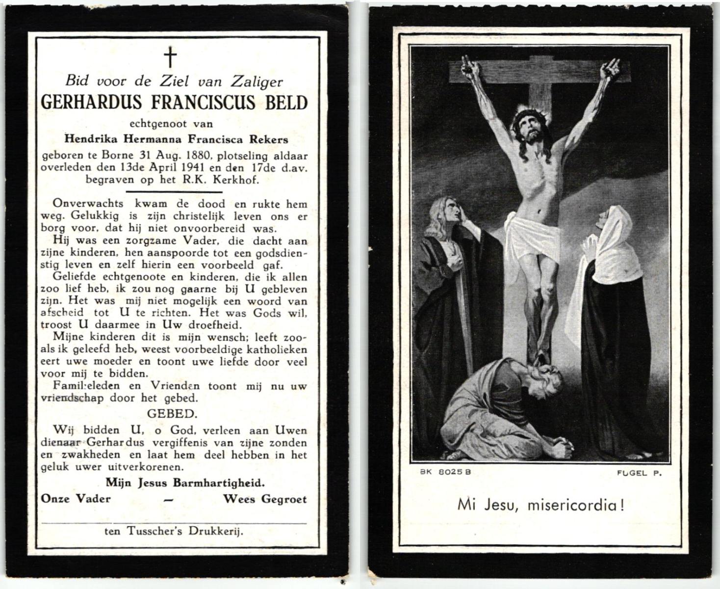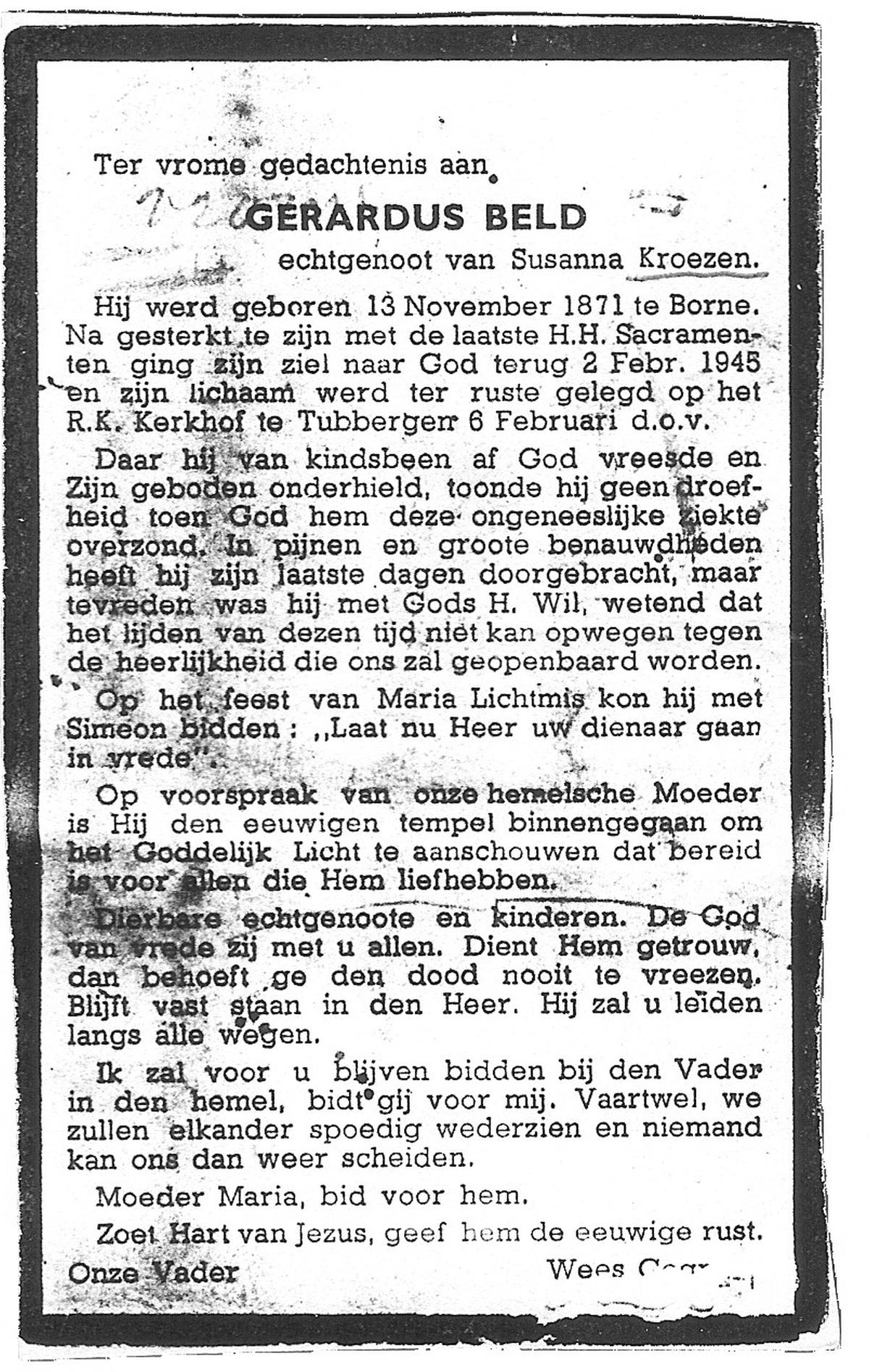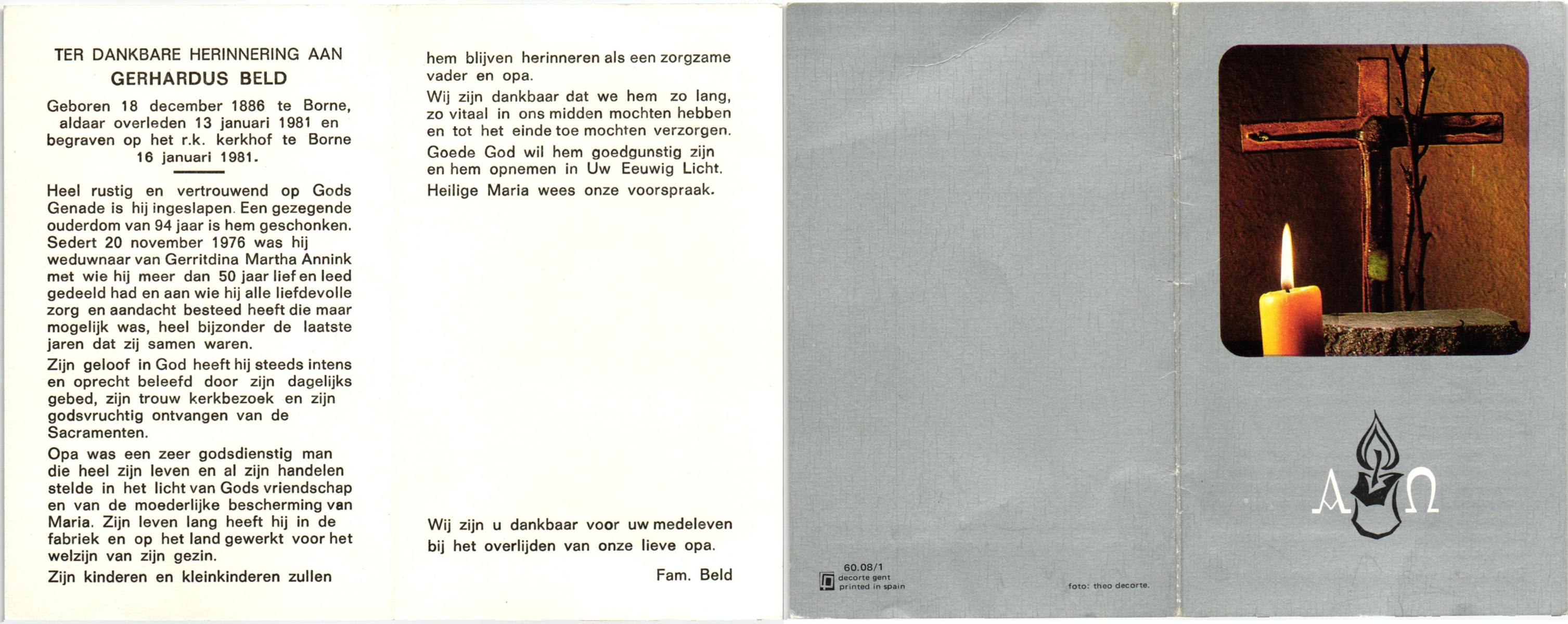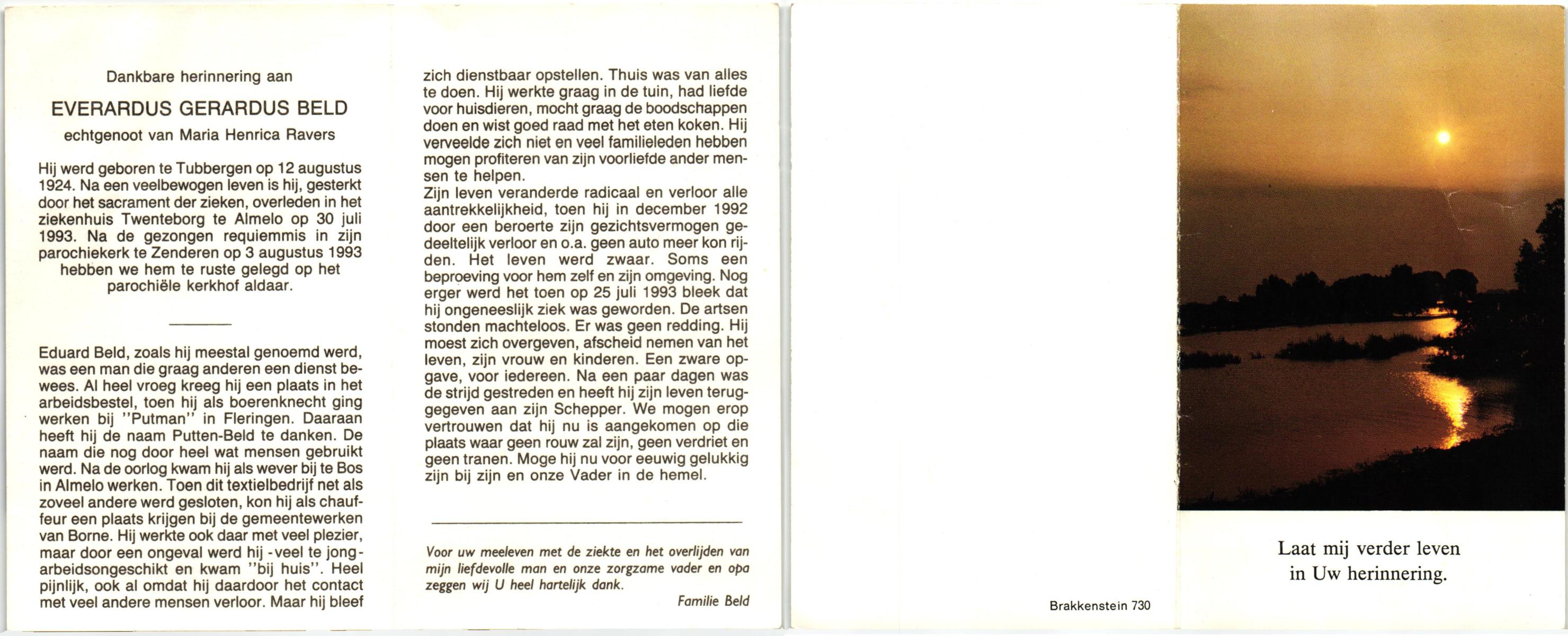 BELD, Everardus Gerardus, geboren op 12-8-1924 te Tubbergen, overleden op 30-7-1993 te Almelo, ziekenhuis op 68-jarige leeftijd, begraven op 3-8-1993 te Zenderen.