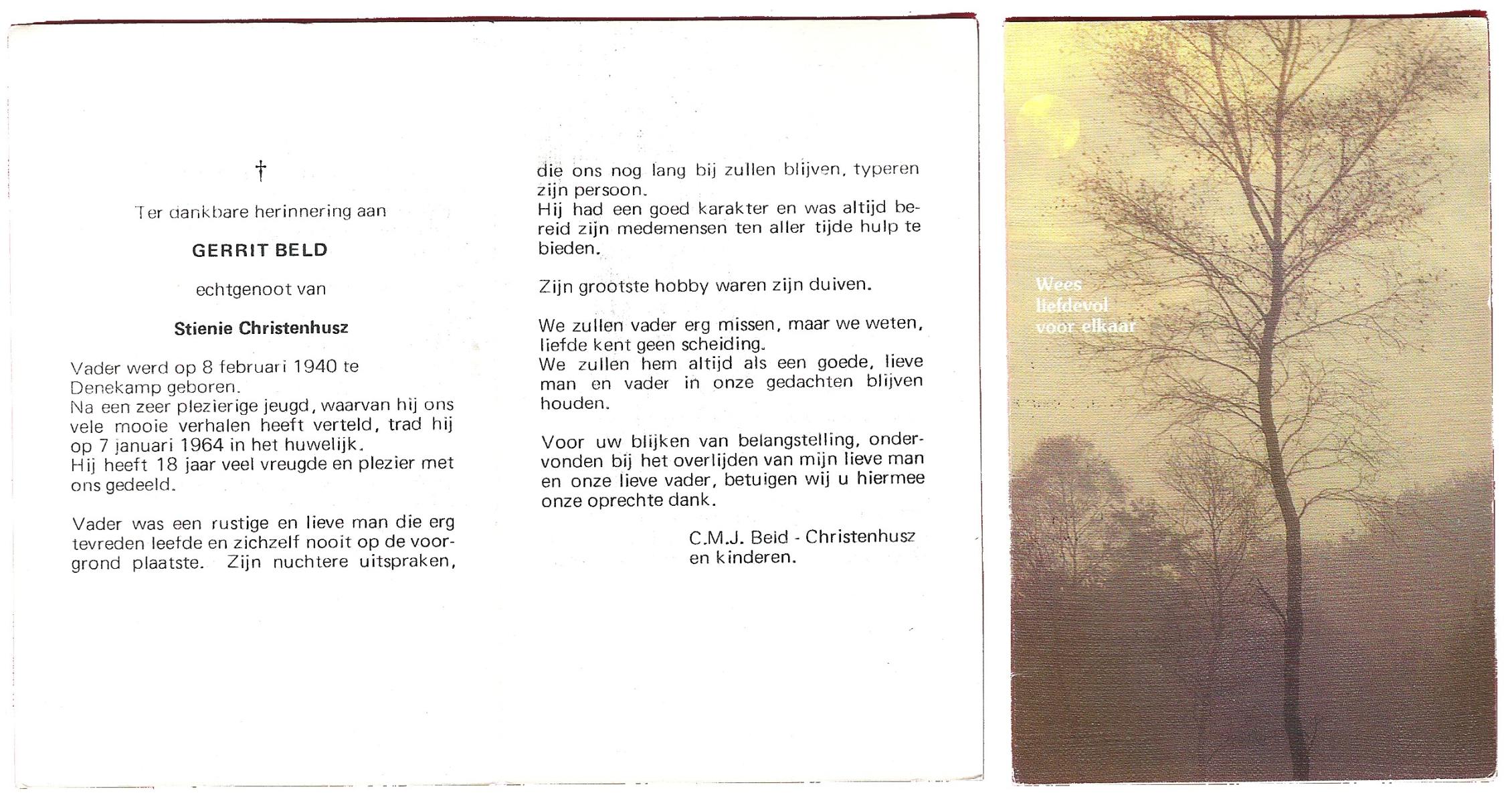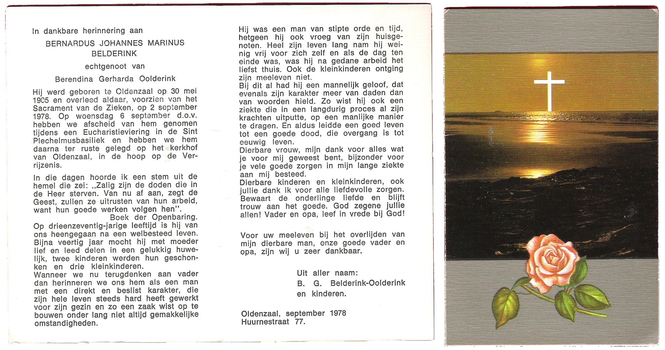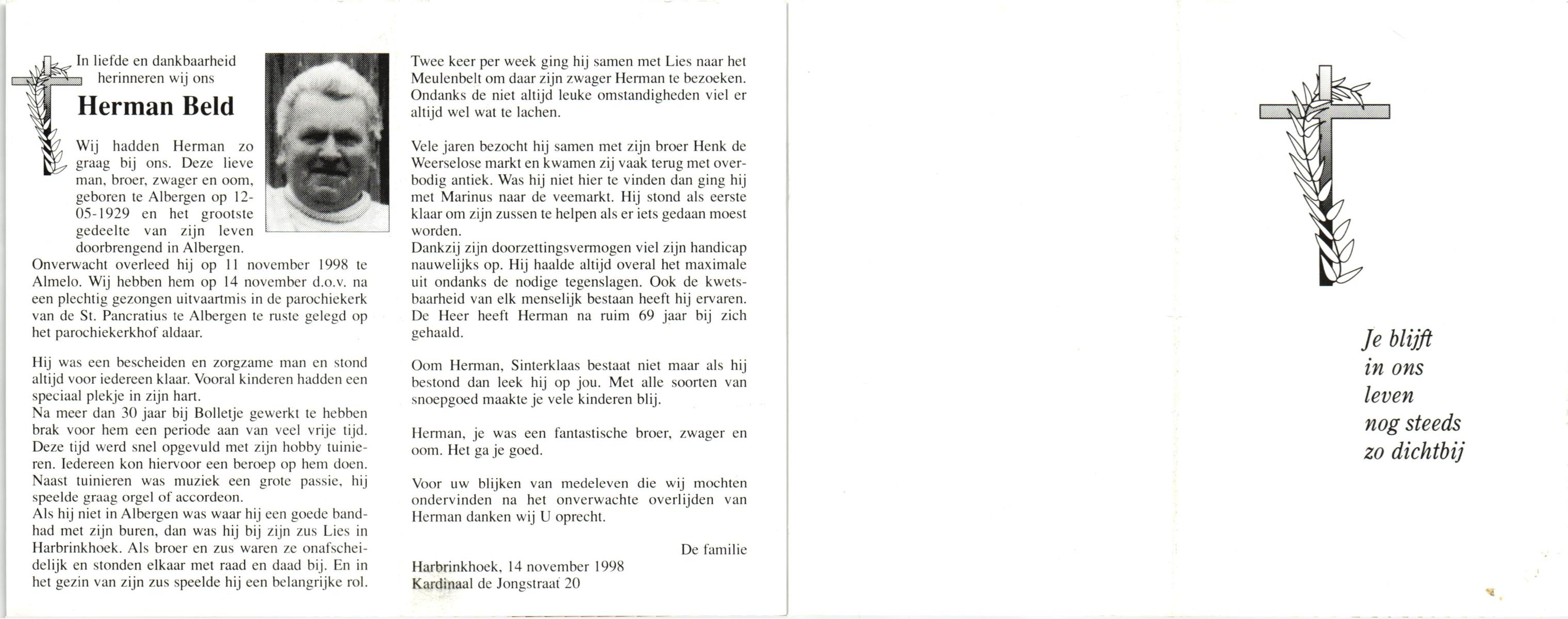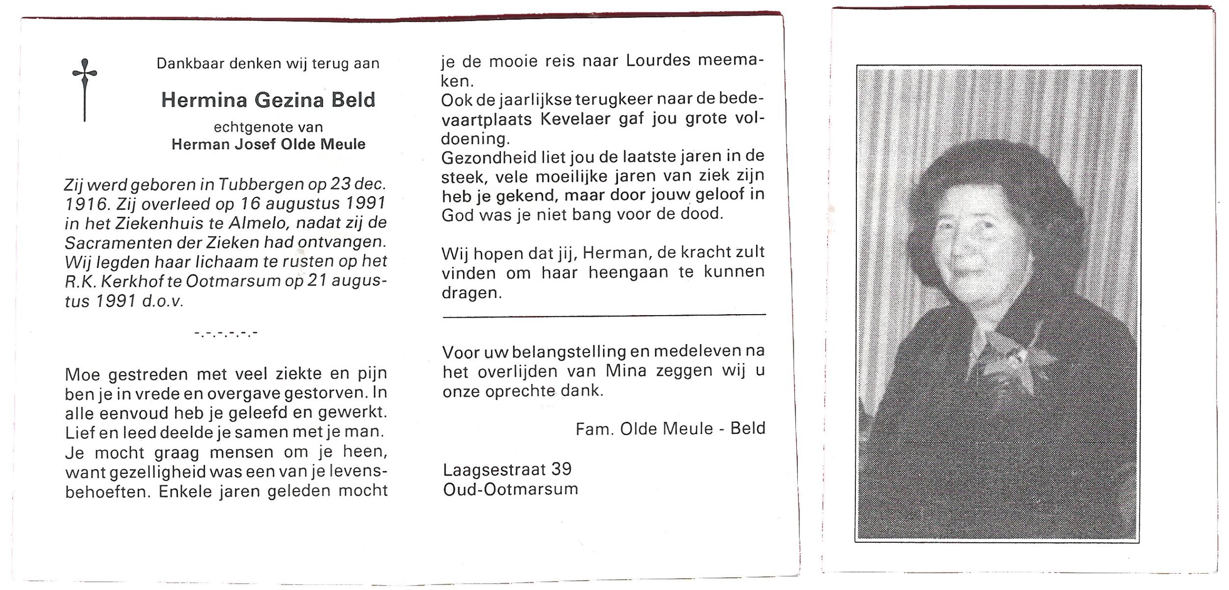 BELD, Everardus Gerardus, geboren op 12-8-1924 te Tubbergen, overleden op 30-7-1993 te Almelo, ziekenhuis op 68-jarige leeftijd, begraven op 3-8-1993 te Zenderen.