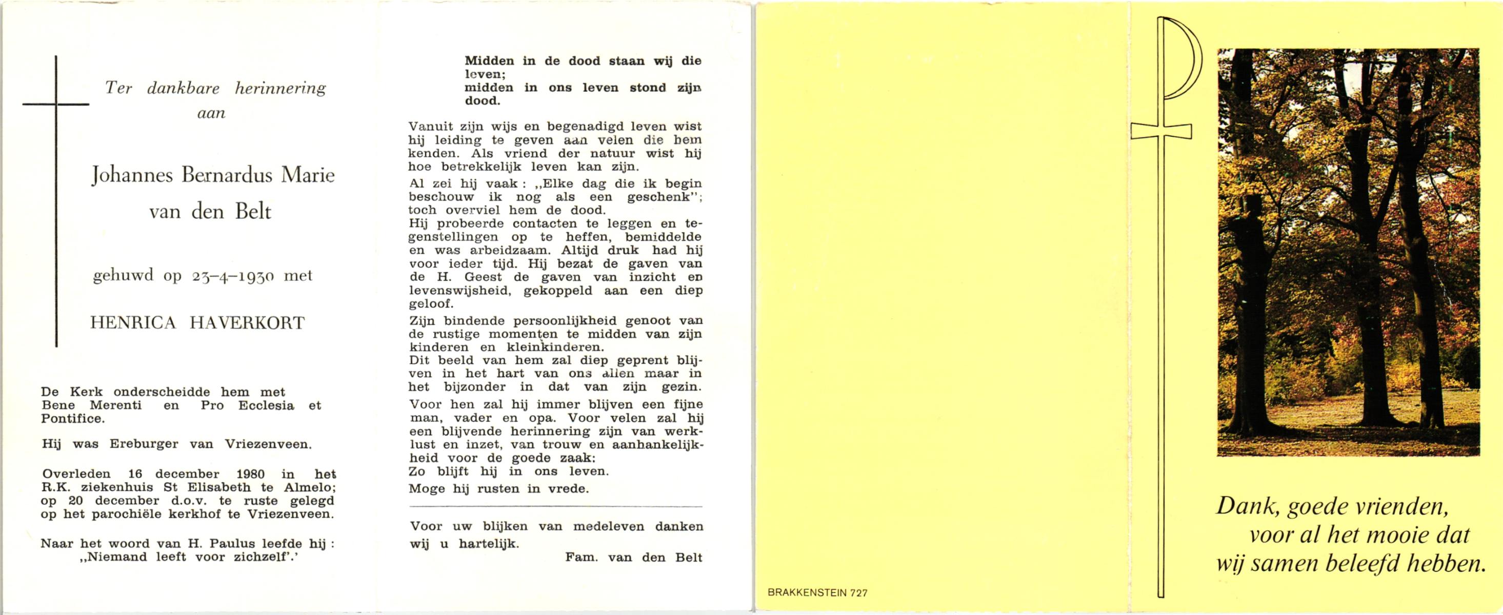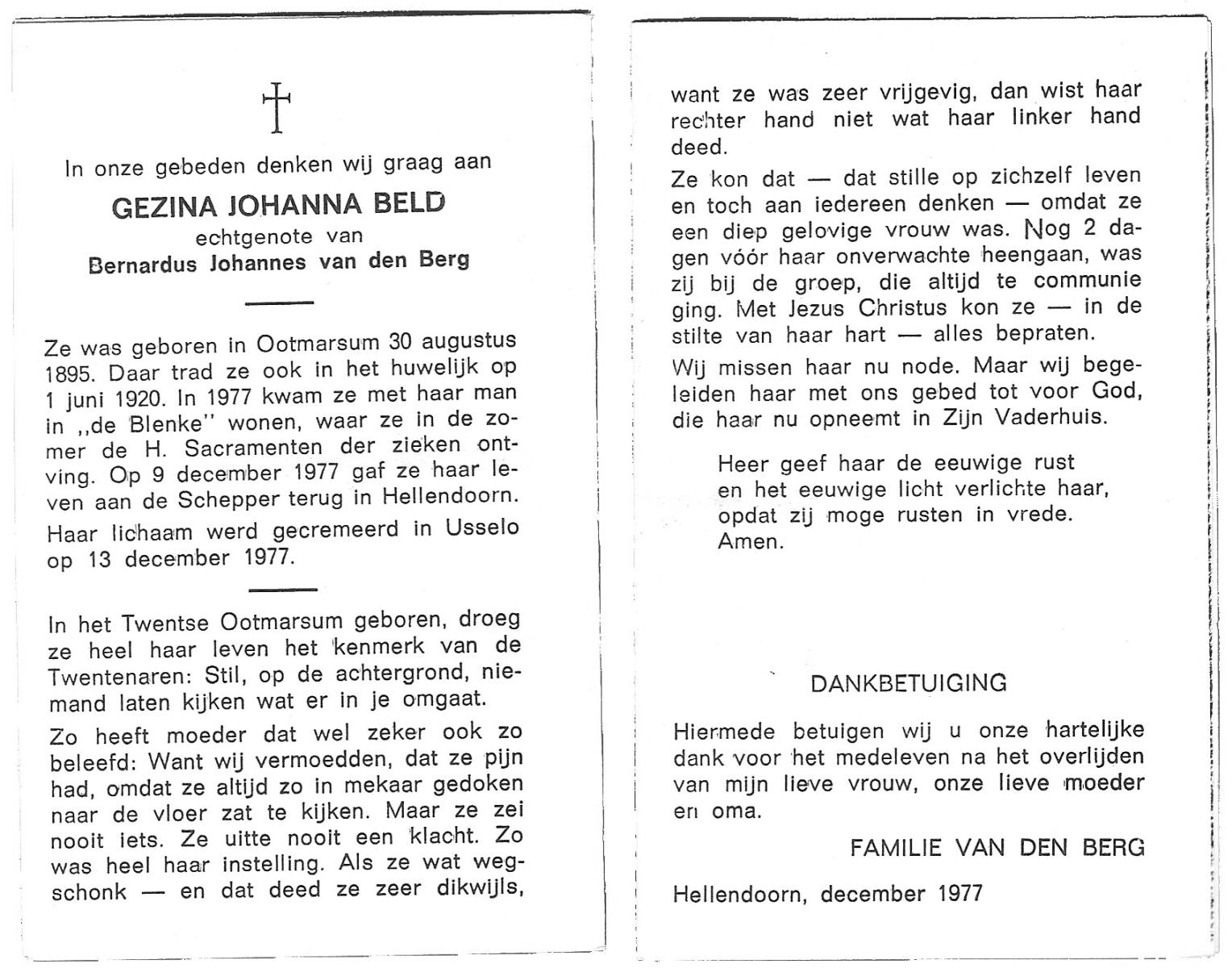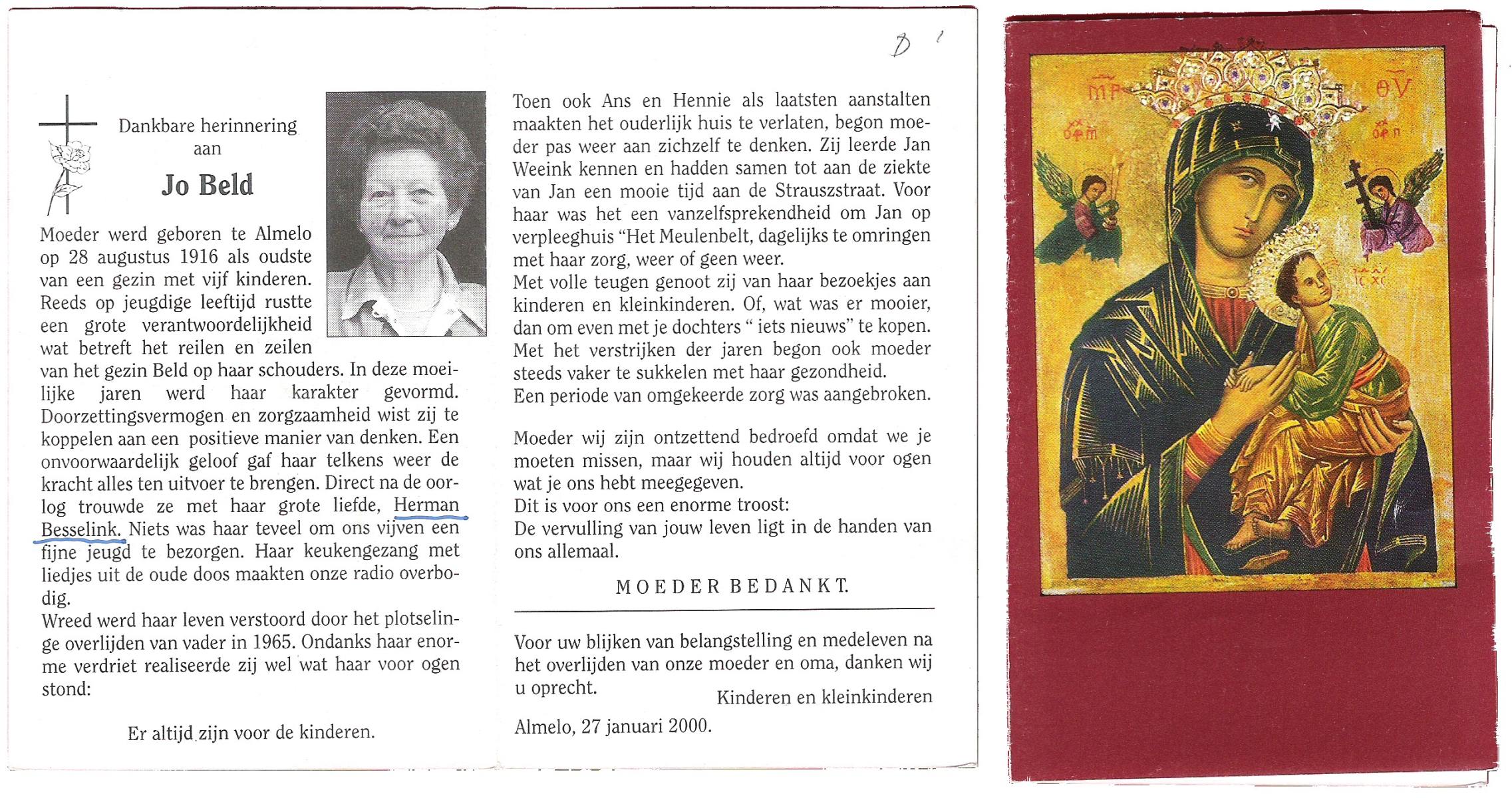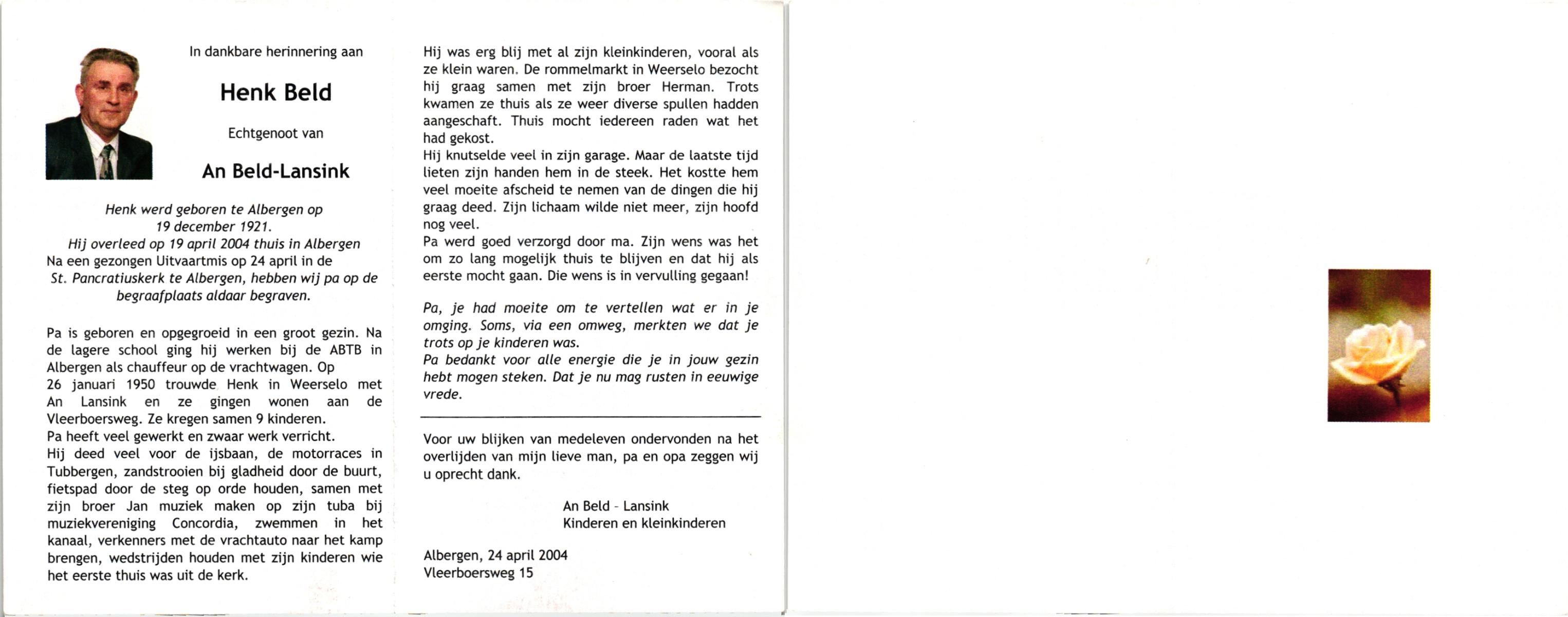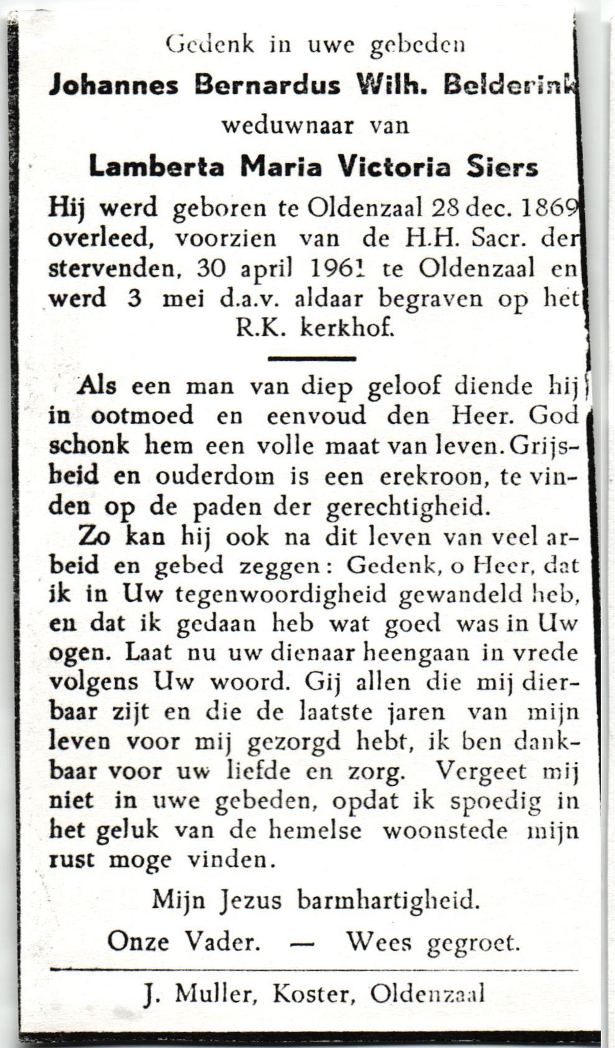 BELD, Everardus Gerardus, geboren op 12-8-1924 te Tubbergen, overleden op 30-7-1993 te Almelo, ziekenhuis op 68-jarige leeftijd, begraven op 3-8-1993 te Zenderen.
