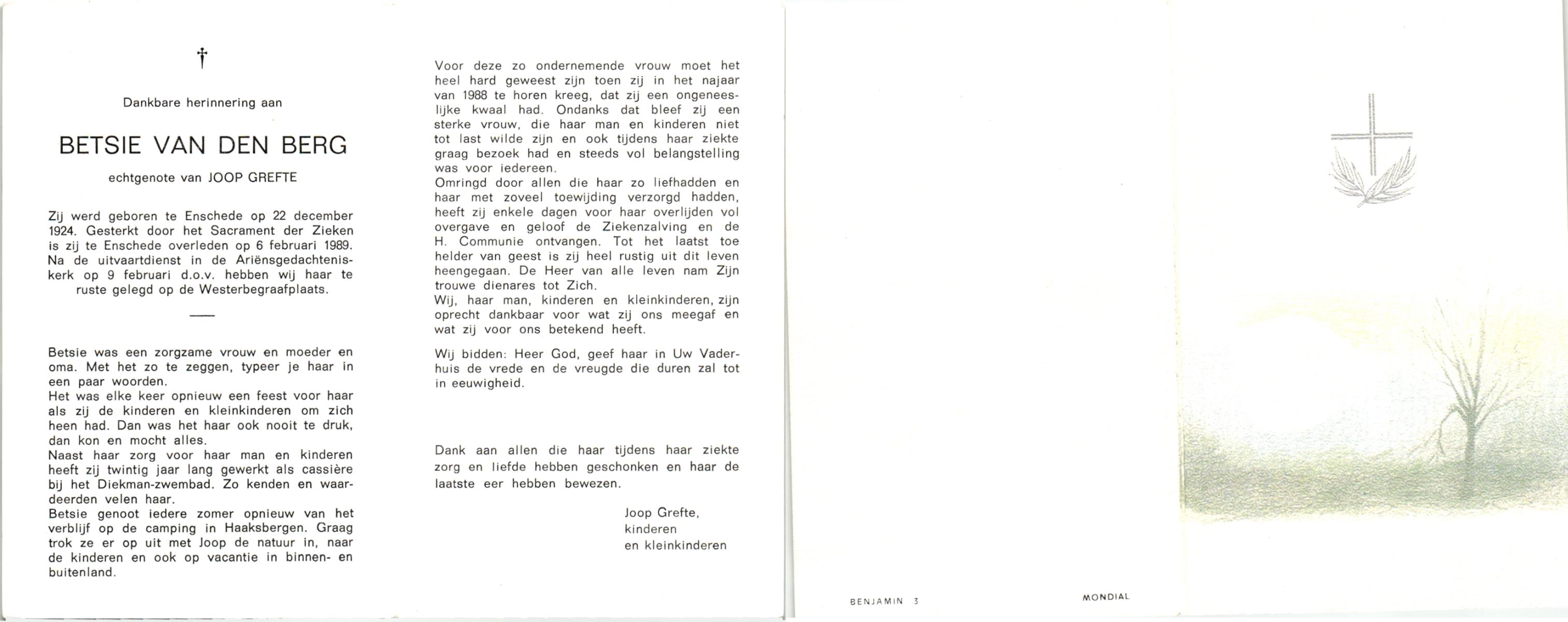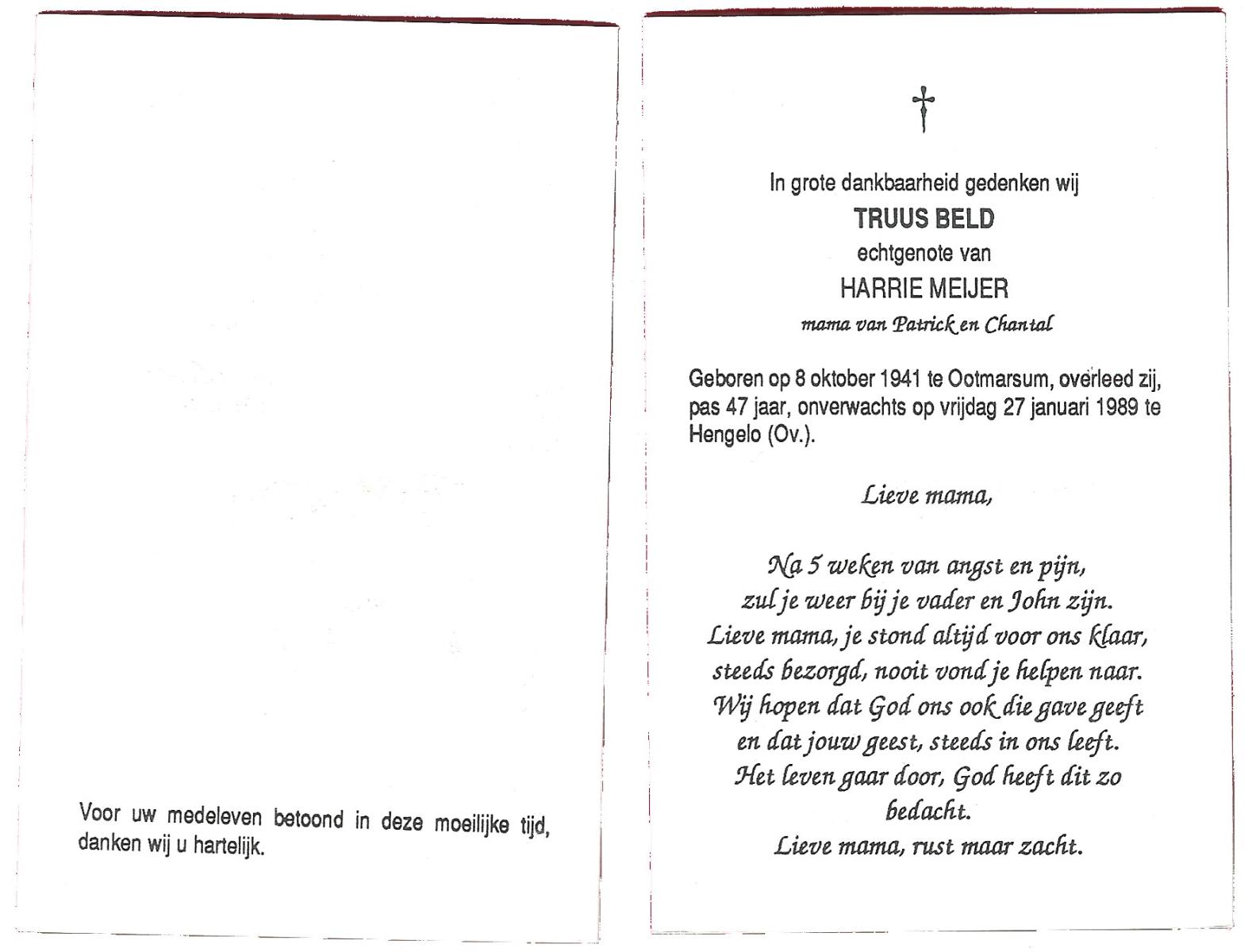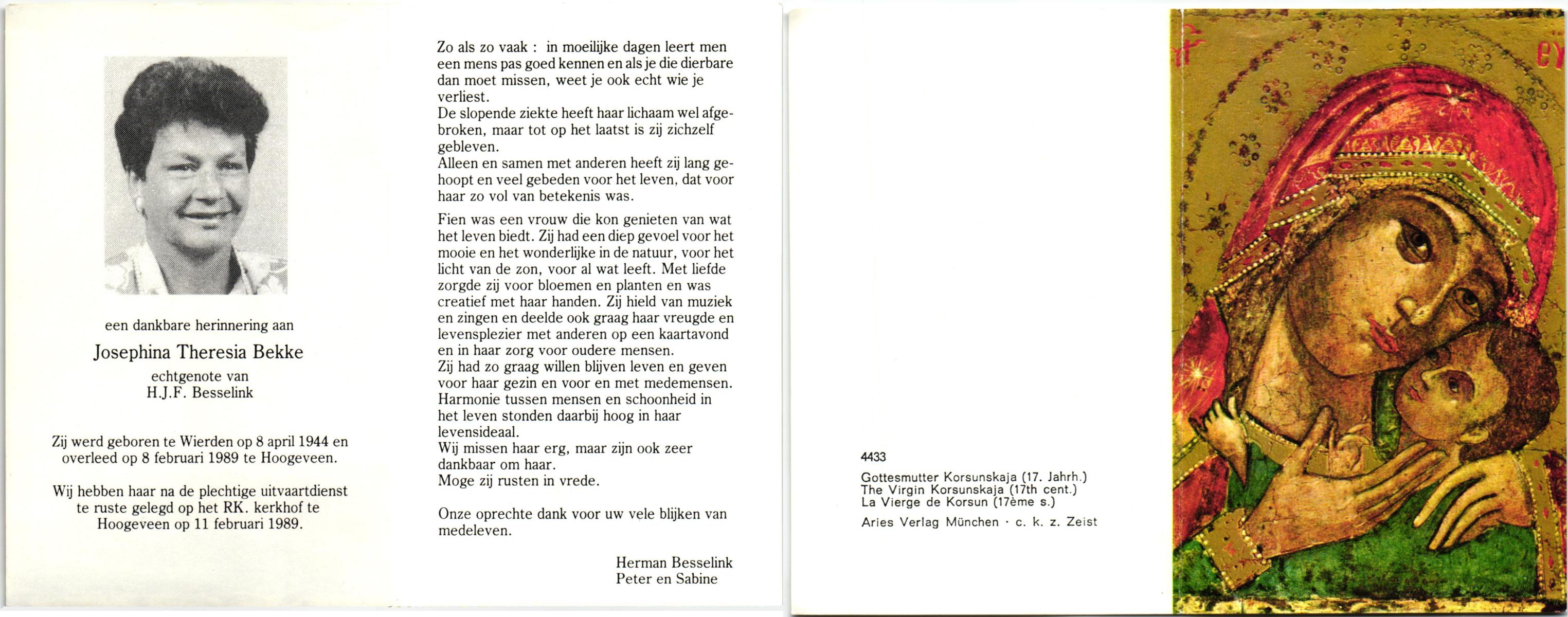 BEKKE, Josephina Theresia, geboren op 8-4-1944 te Wierden, overleden op 8-2-1989 te Hoogeveen op 44-jarige leeftijd, begraven op 11-2-1989 te Hoogeveen.