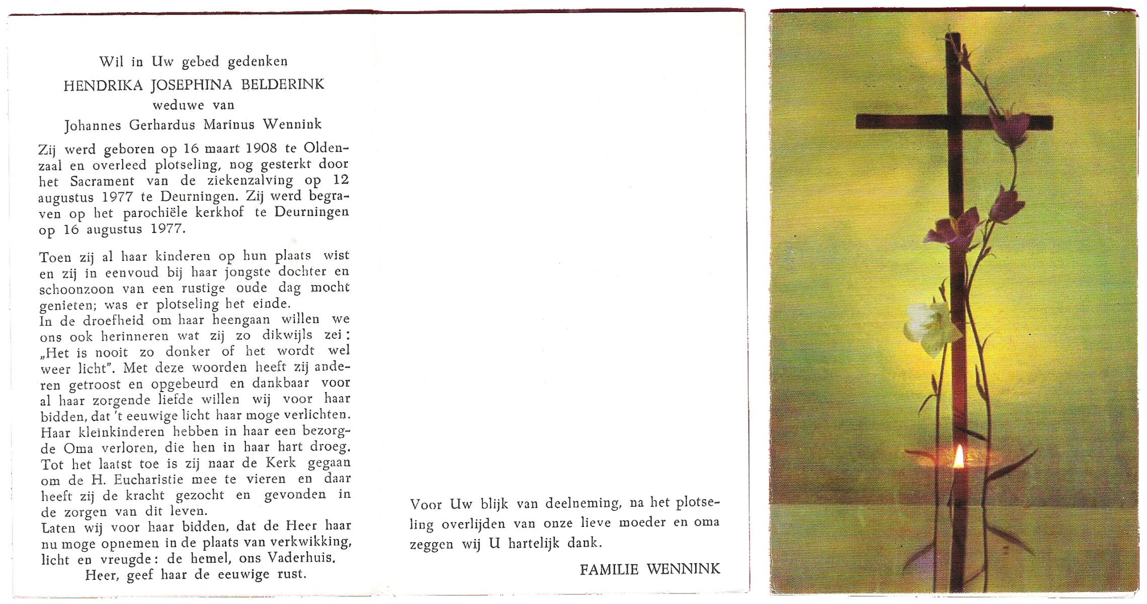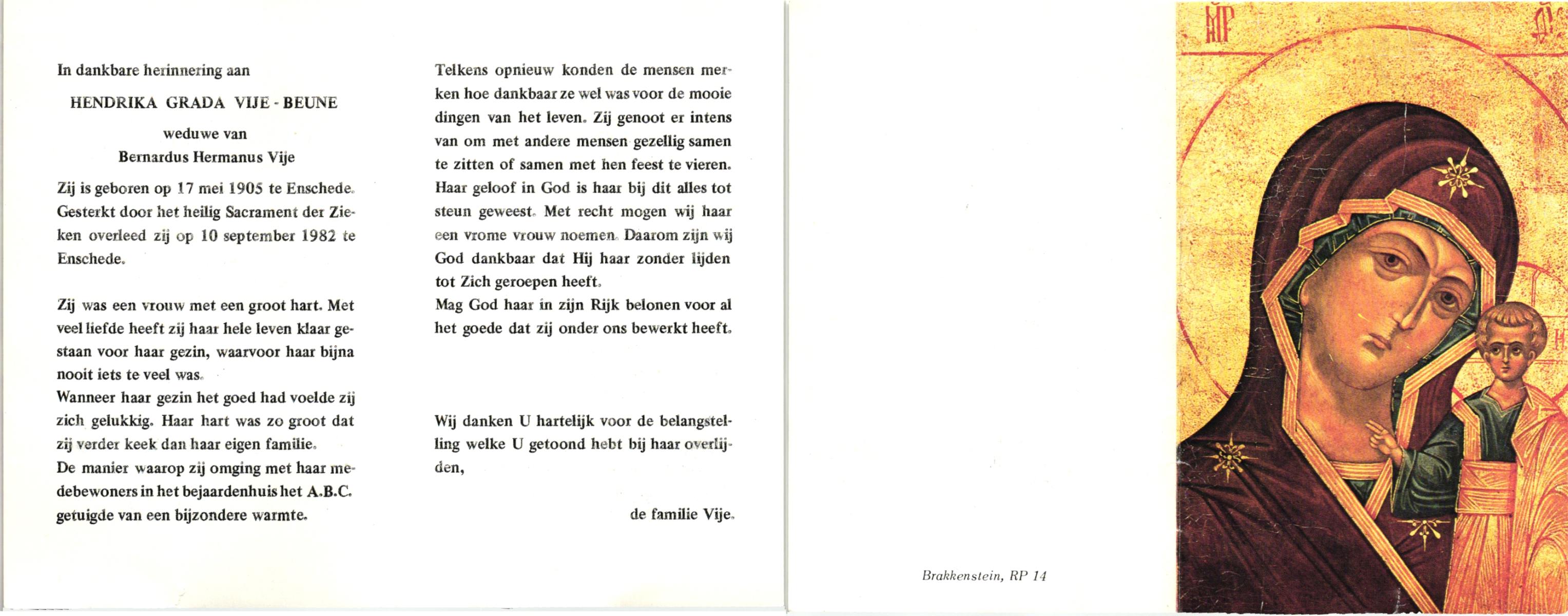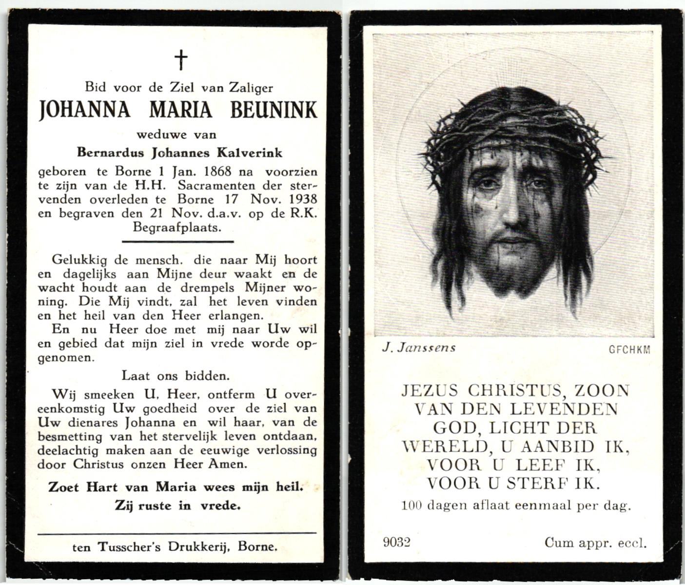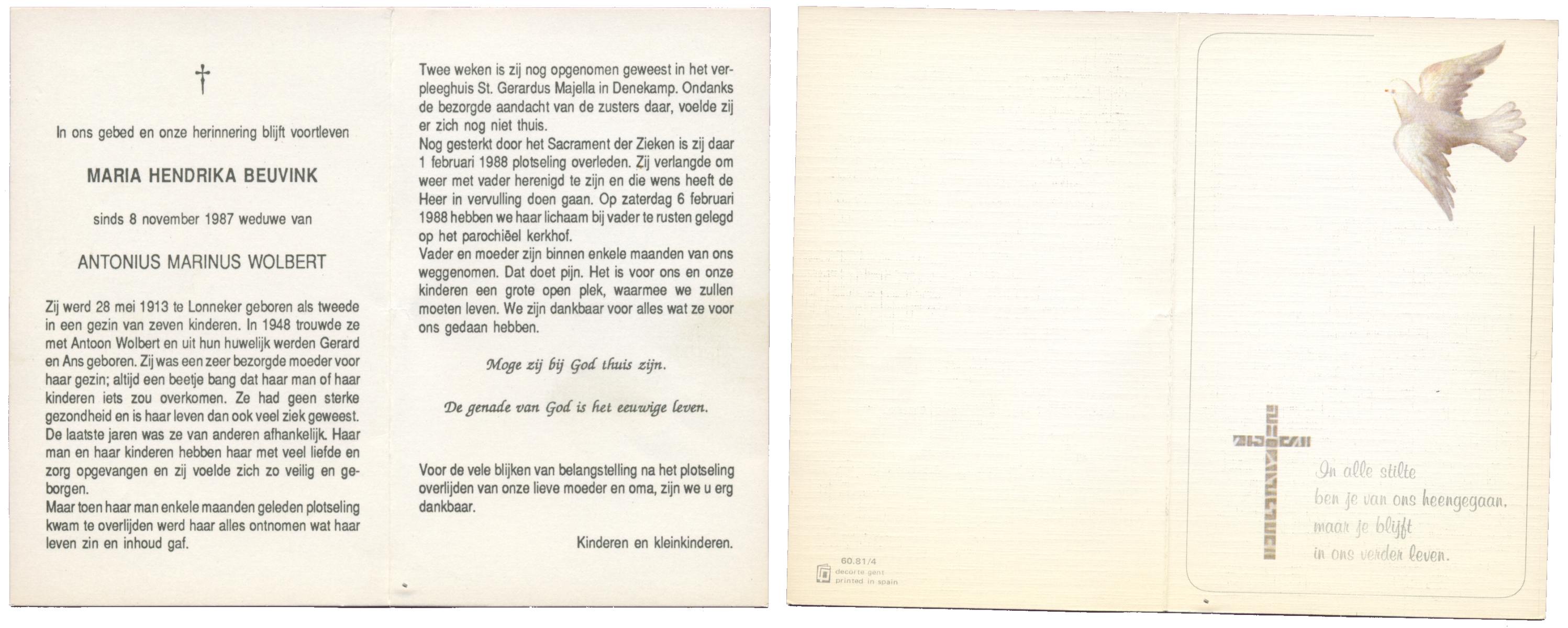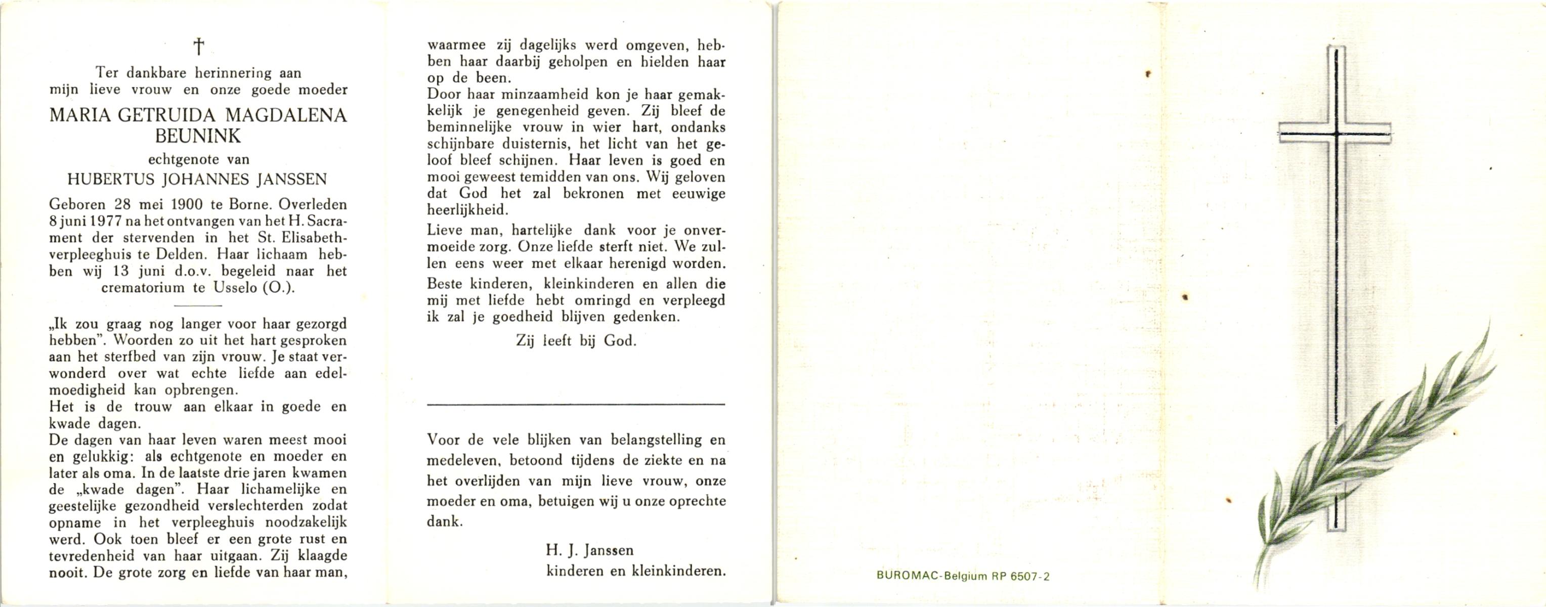 BEUVINK, Maria Hendrika, geboren op 28-5-1913 te Lonneker, overleden op 1-2-1988 te Denekamp op 74-jarige leeftijd, begraven op 6-2-1988.