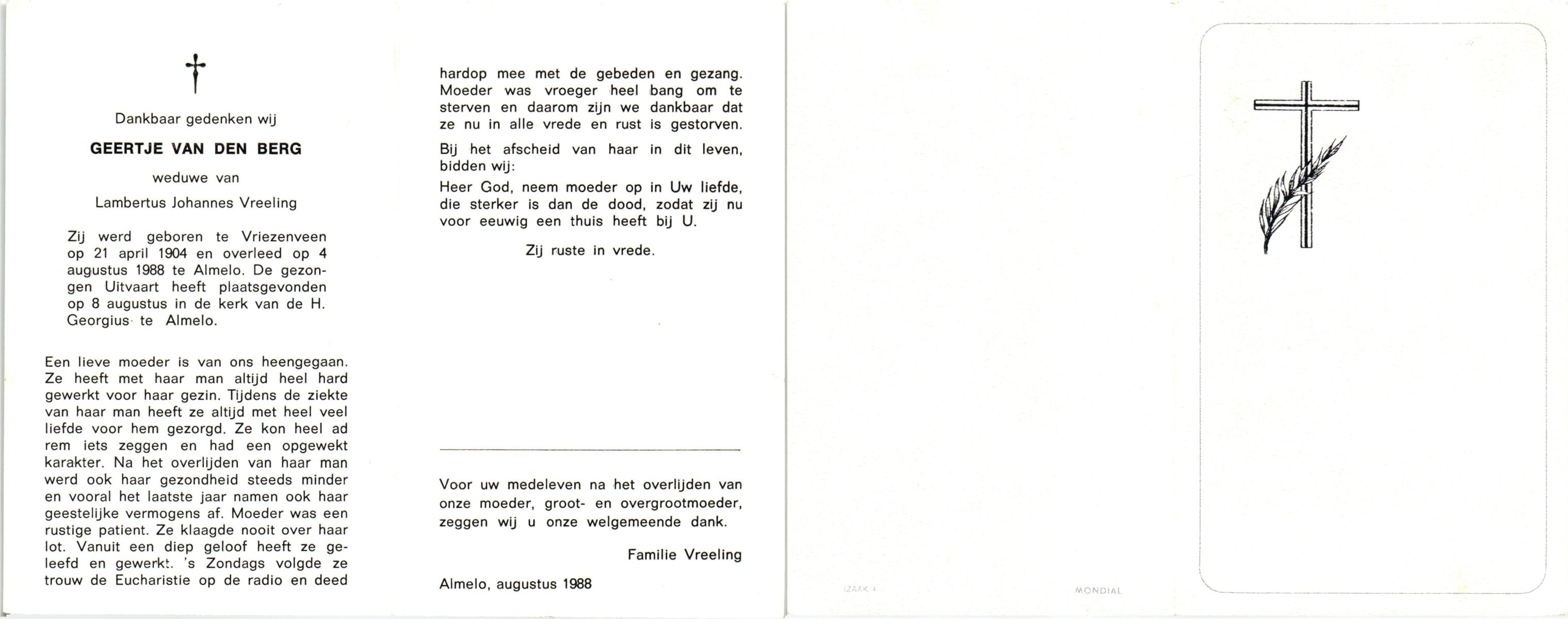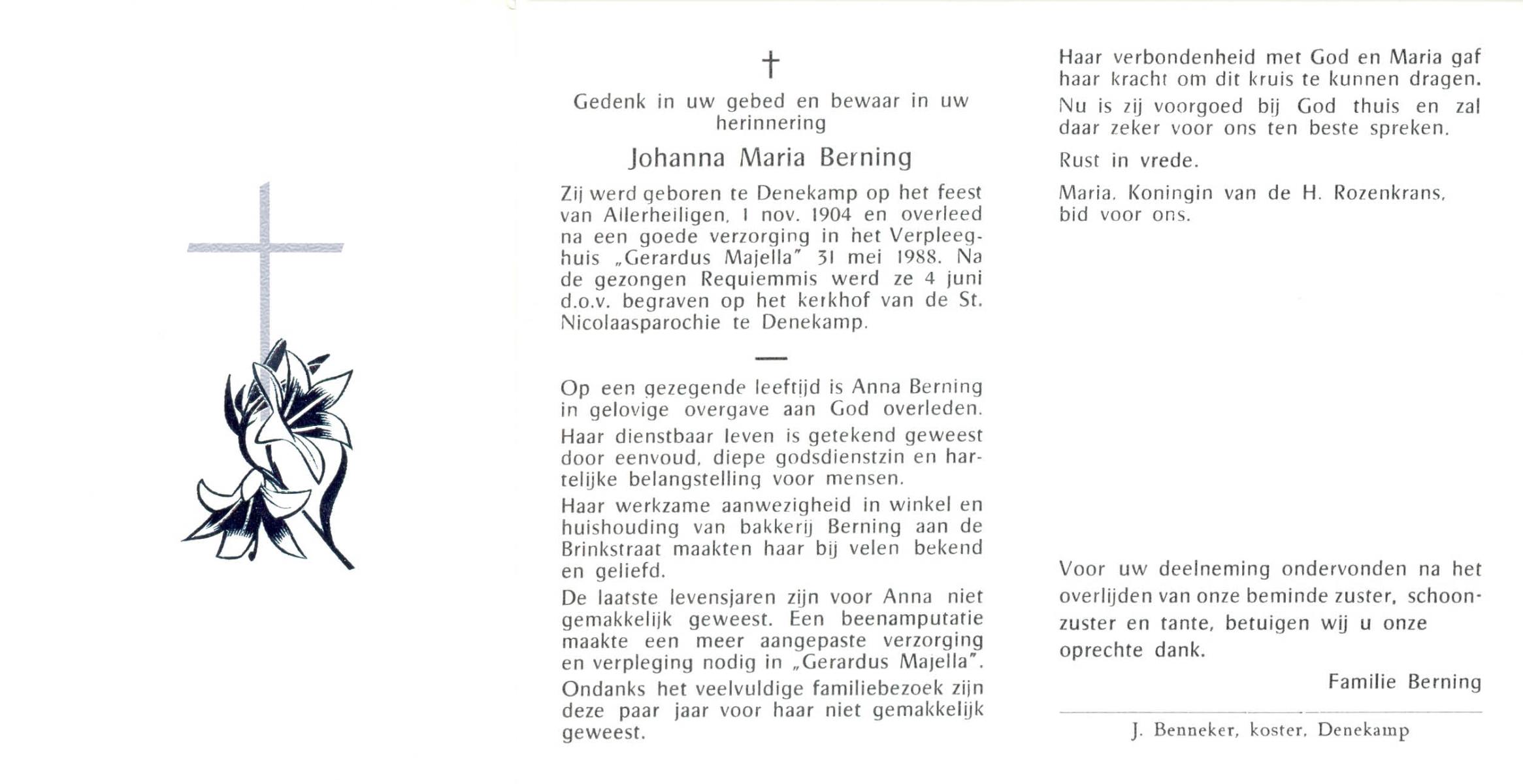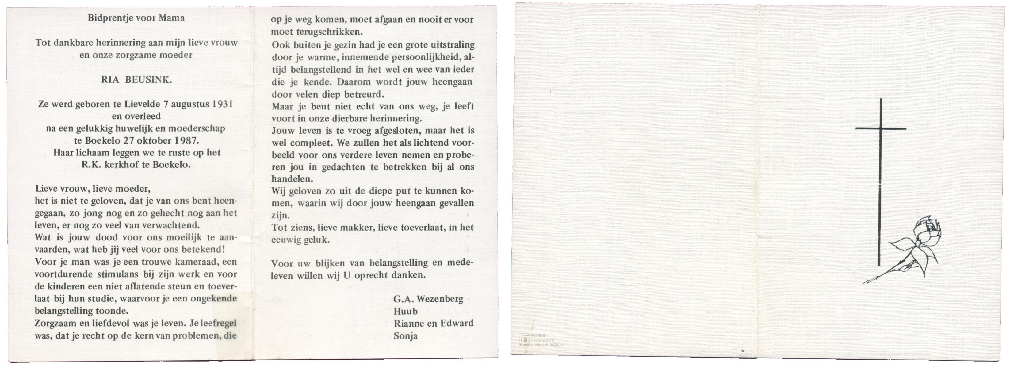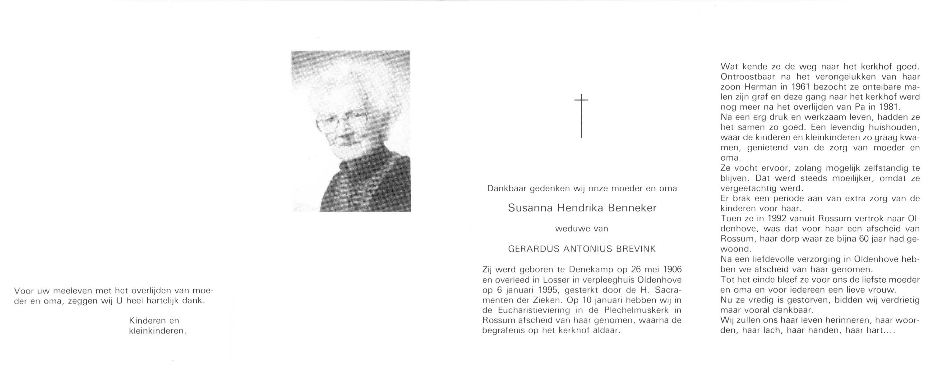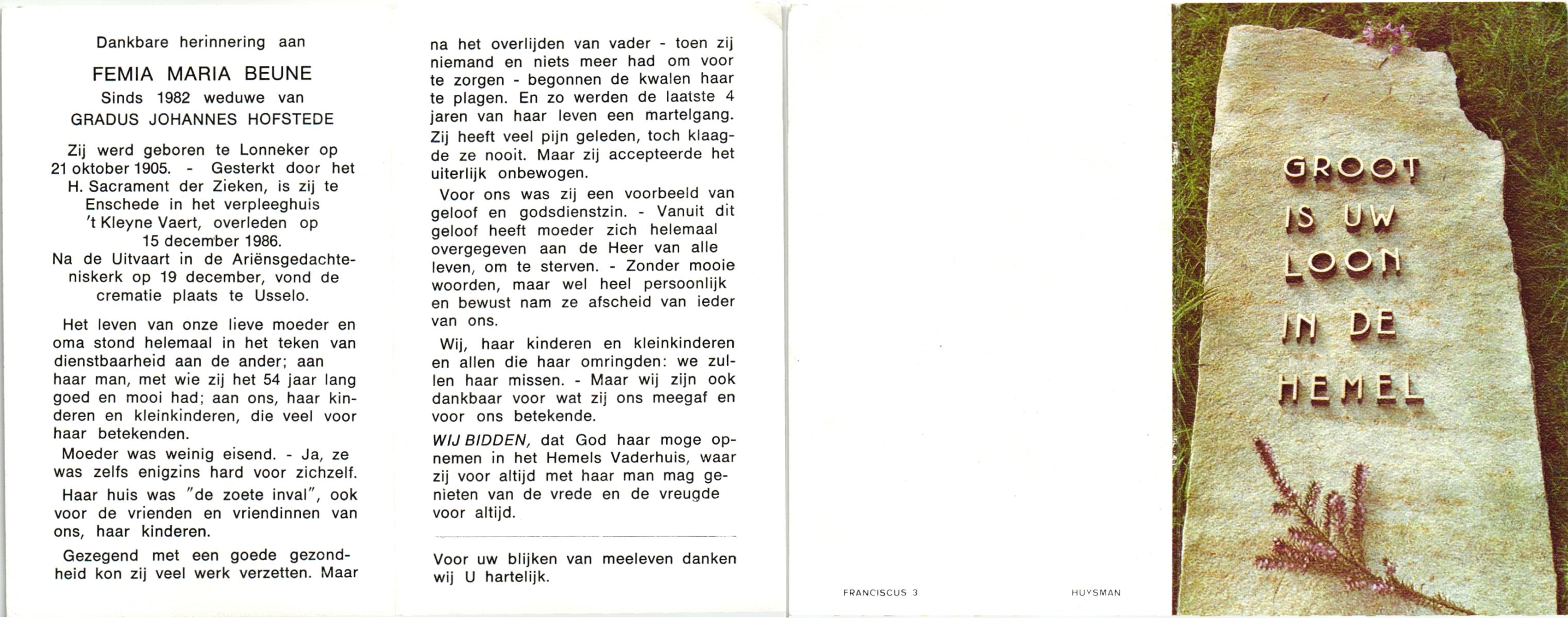 BEUVINK, Maria Hendrika, geboren op 28-5-1913 te Lonneker, overleden op 1-2-1988 te Denekamp op 74-jarige leeftijd, begraven op 6-2-1988.