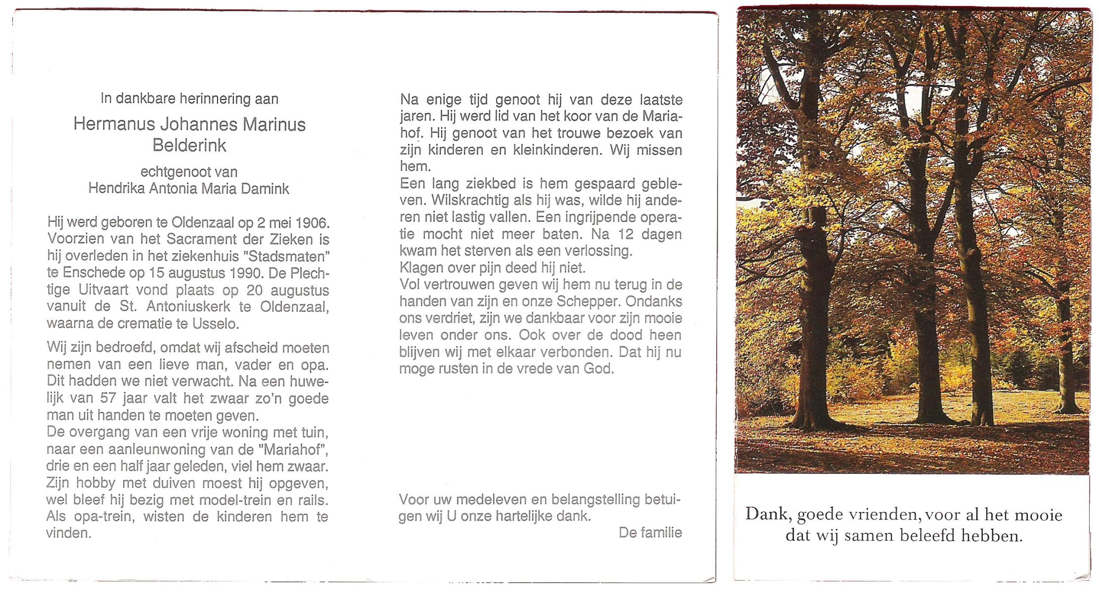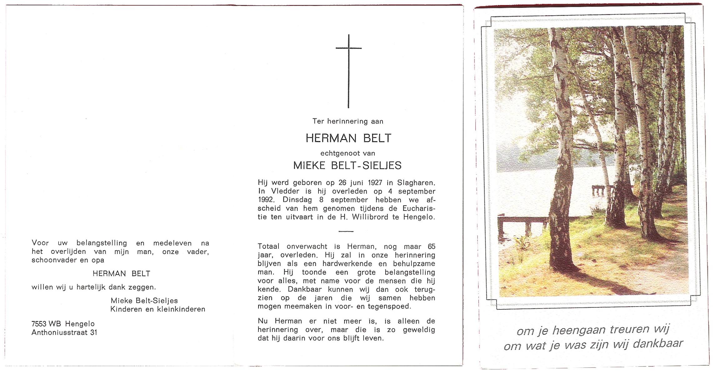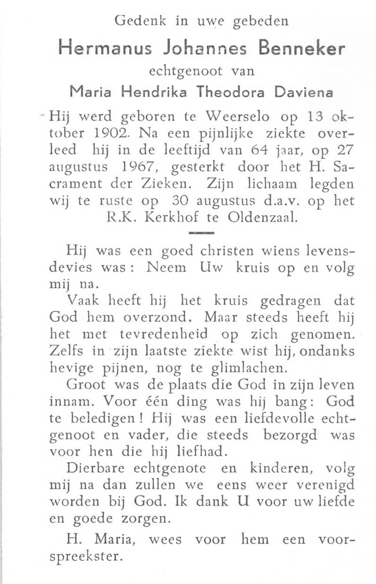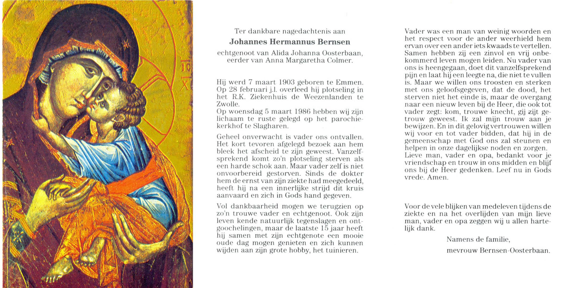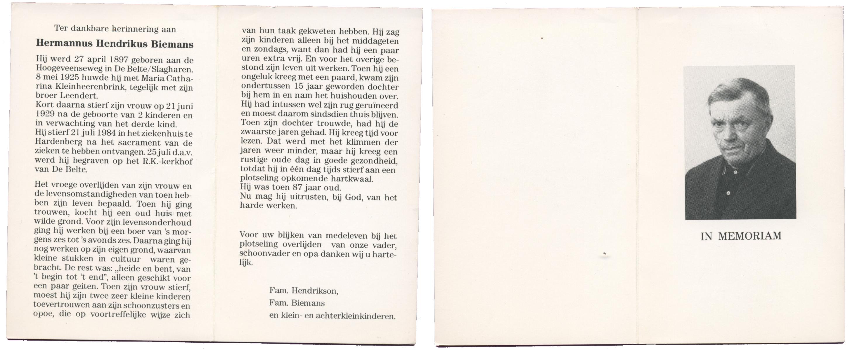 BIEMANS, Hermannus Hendrikus, geboren op 27-04-1897 te De Belte/Slagharen, overleden op 21-7-1984 te Hardenberg op 87-jarige leeftijd, begraven op 25-7-1984 te Slagharen, R.K.Kerhof de Belte.