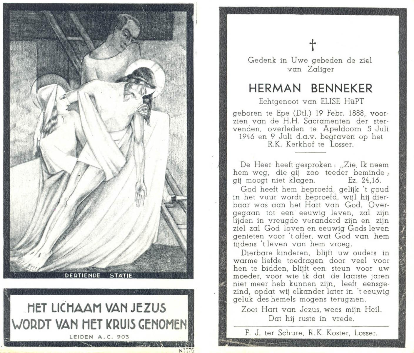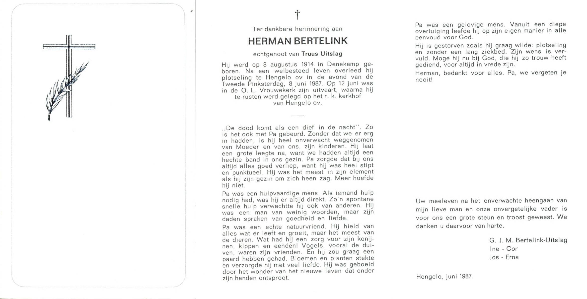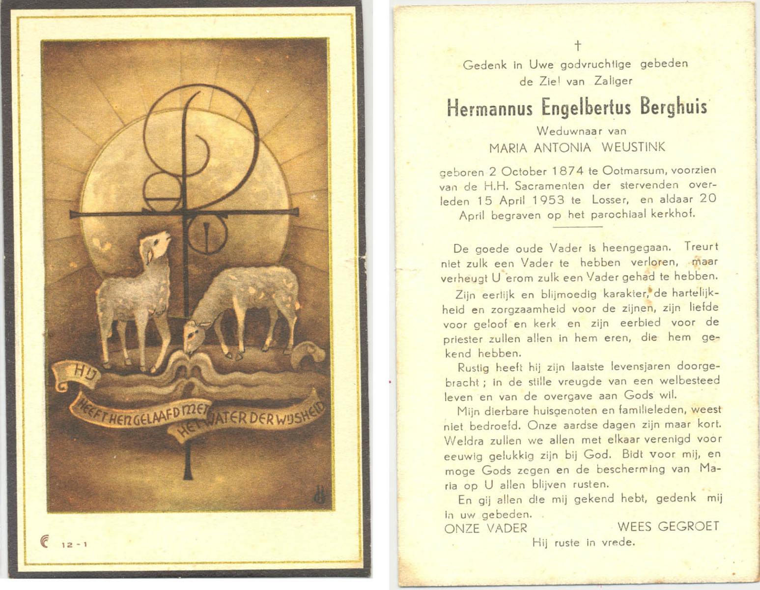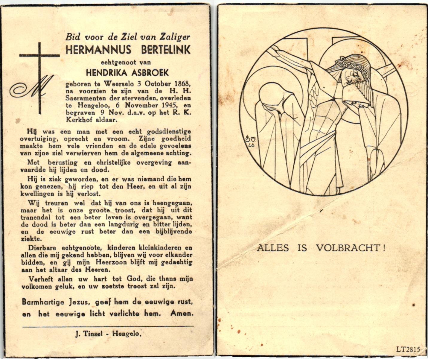 BIEMANS, Hermannus Hendrikus, geboren op 27-04-1897 te De Belte/Slagharen, overleden op 21-7-1984 te Hardenberg op 87-jarige leeftijd, begraven op 25-7-1984 te Slagharen, R.K.Kerhof de Belte.