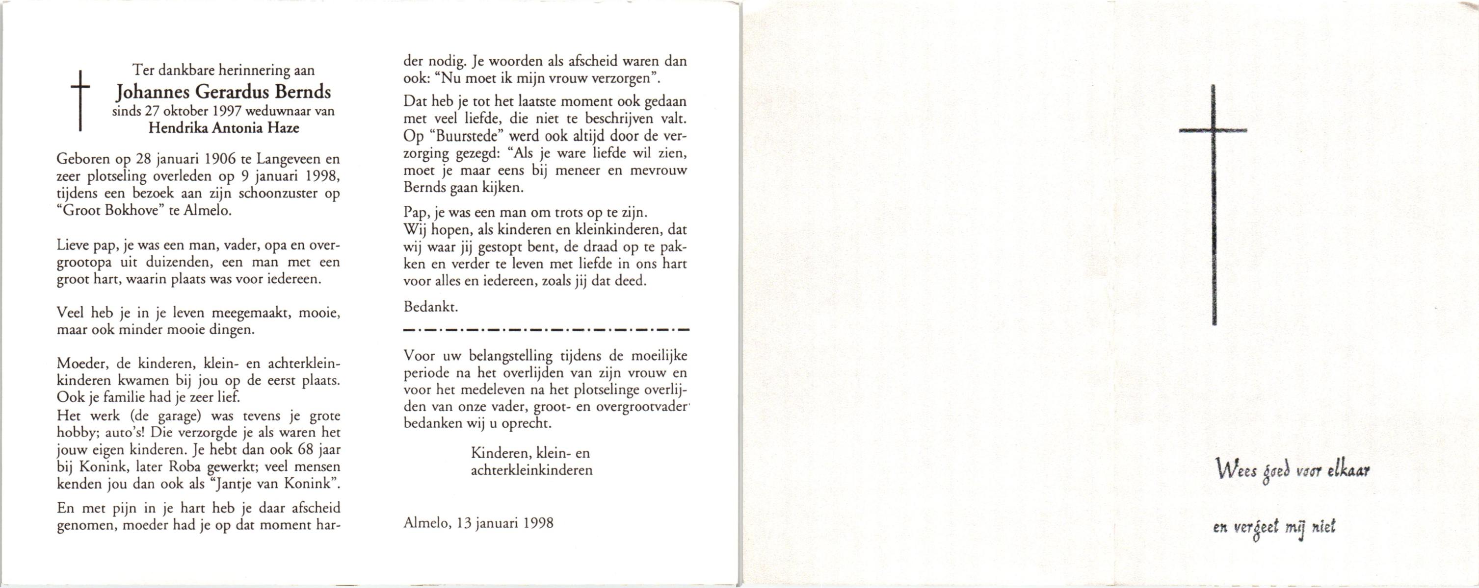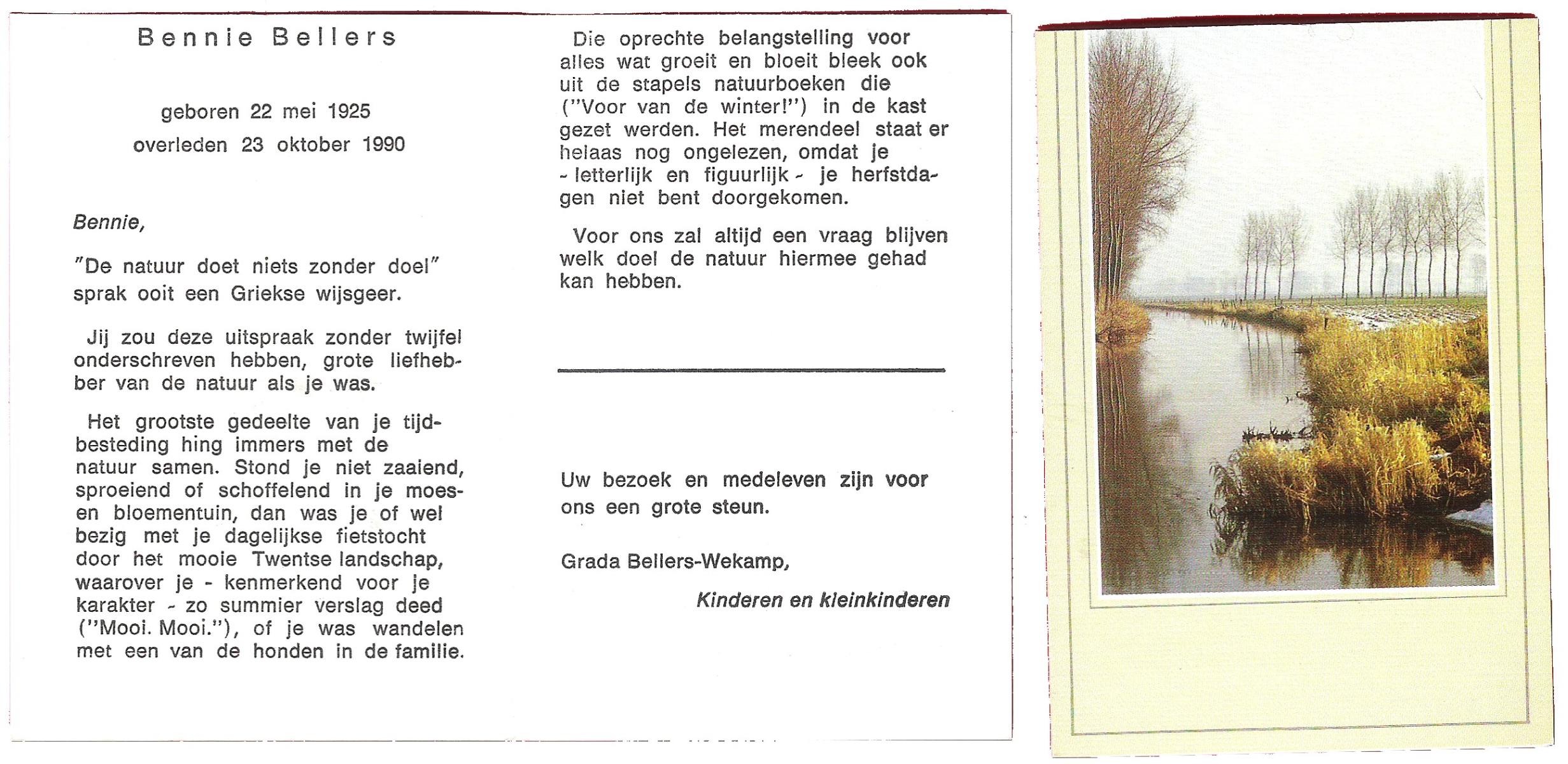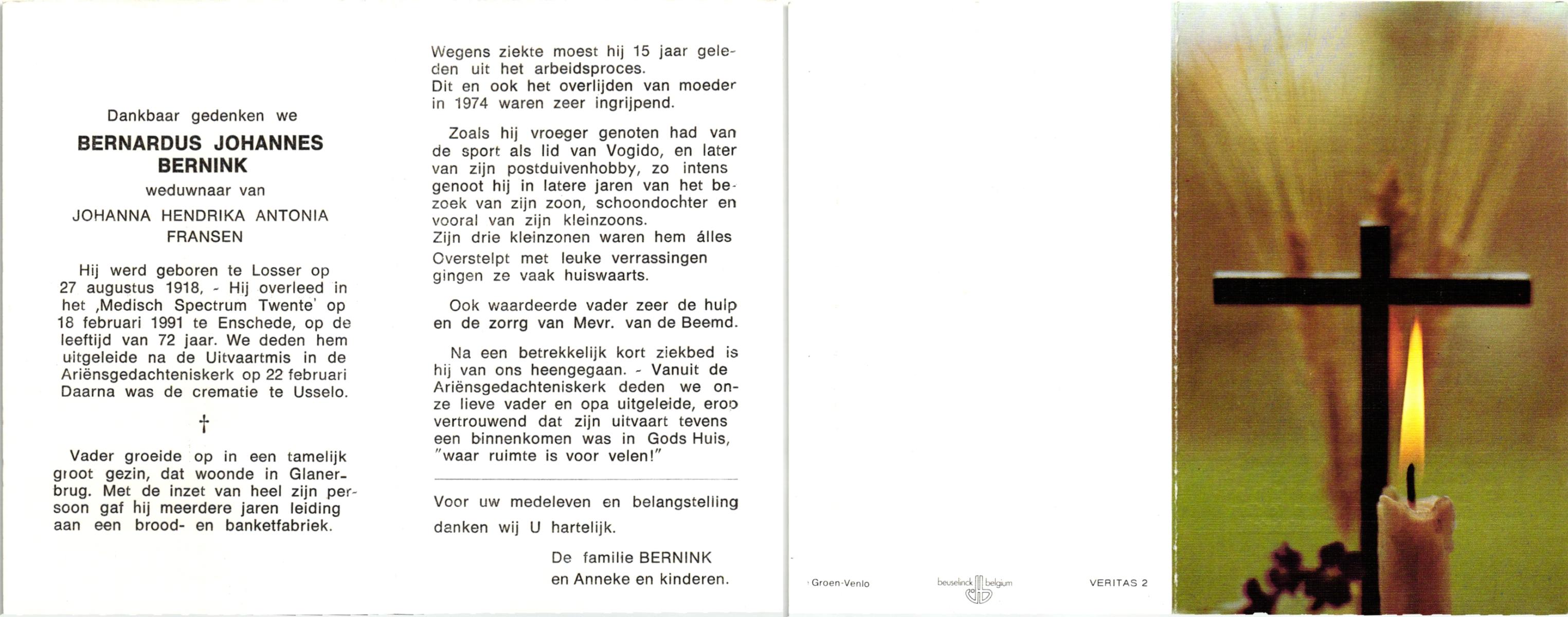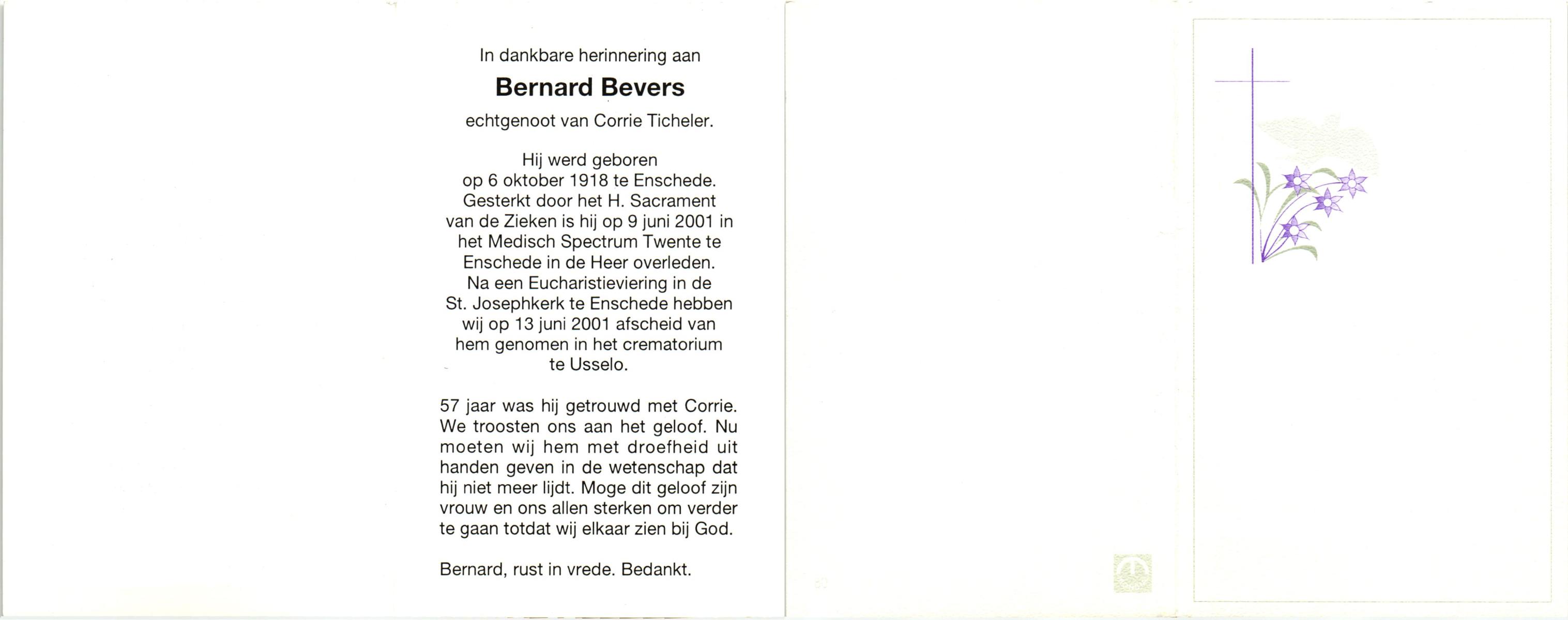 BEVERS, Bernard, geboren op 6-10-1918 te Enschede, overleden op 9-6-2001 te Enschede, ziekenhuis op 82-jarige leeftijd, gecremeerd op 13-6-2001 te Usselo.