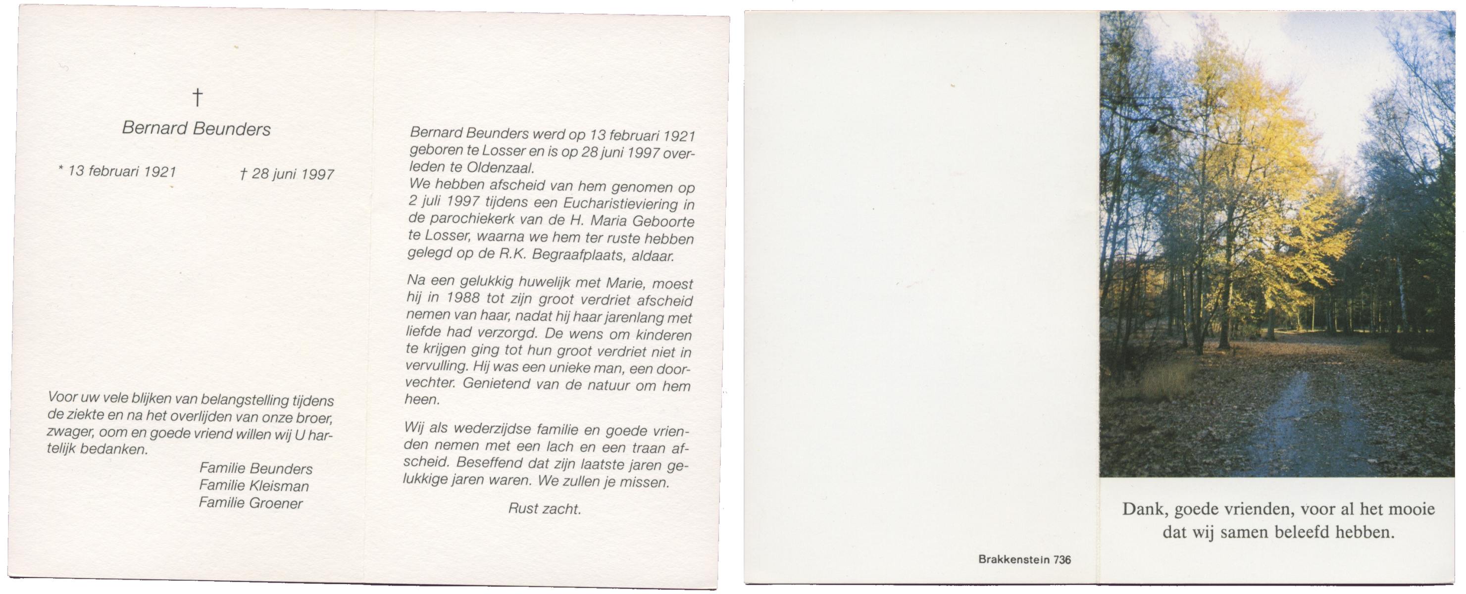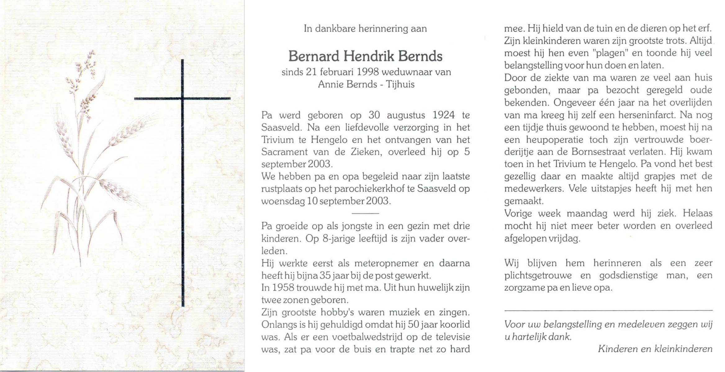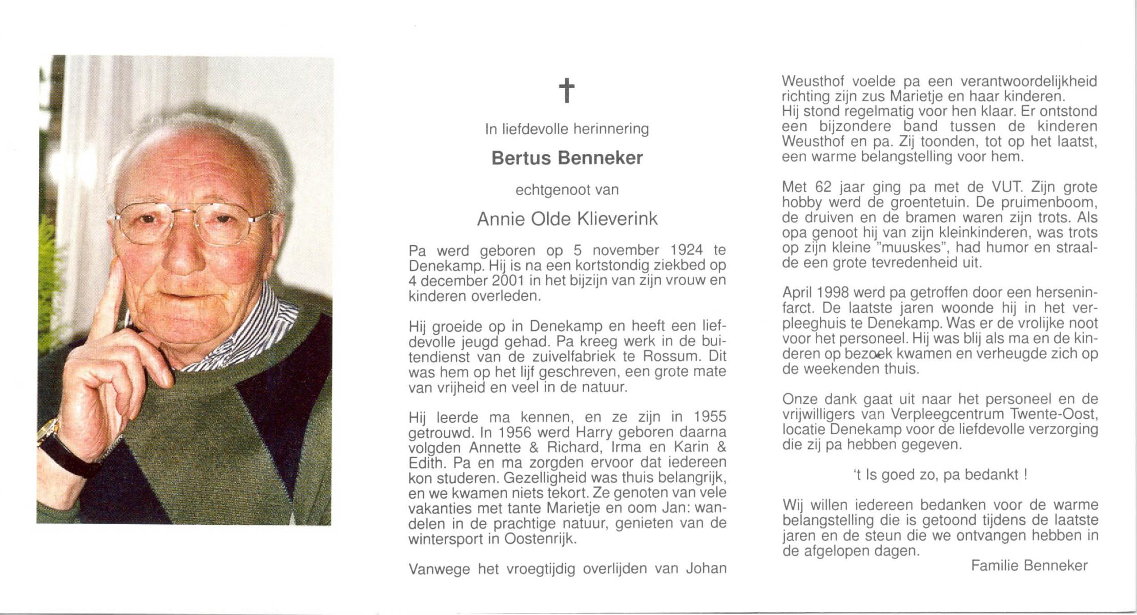 BEVERS, Bernard, geboren op 6-10-1918 te Enschede, overleden op 9-6-2001 te Enschede, ziekenhuis op 82-jarige leeftijd, gecremeerd op 13-6-2001 te Usselo.