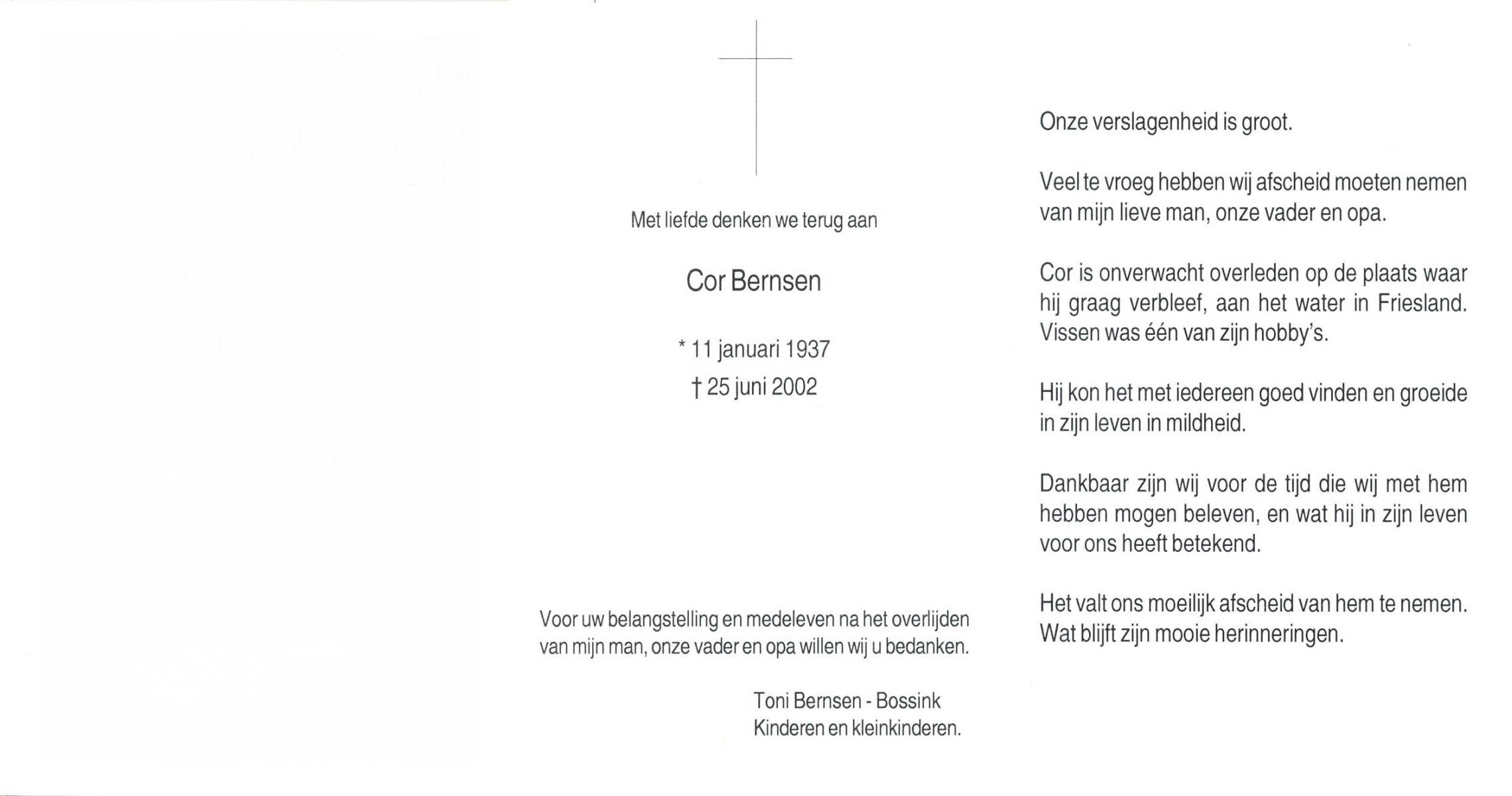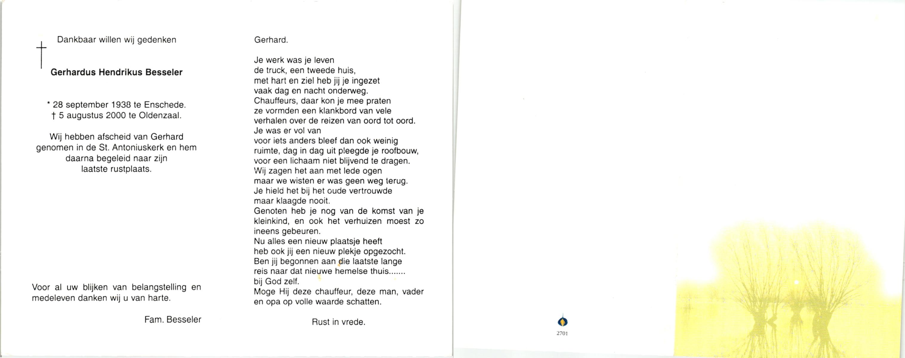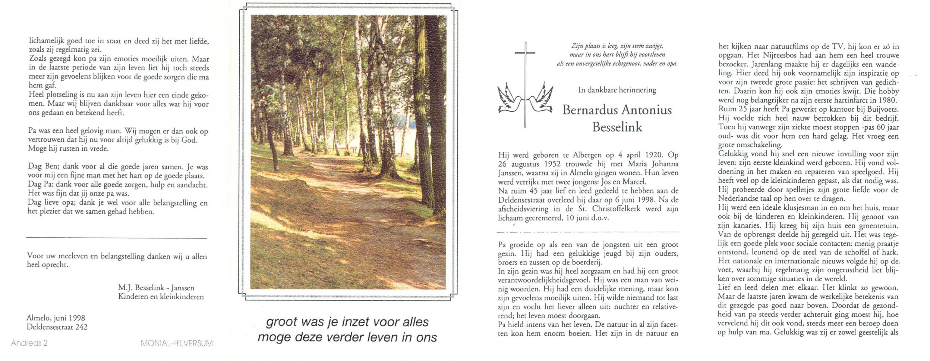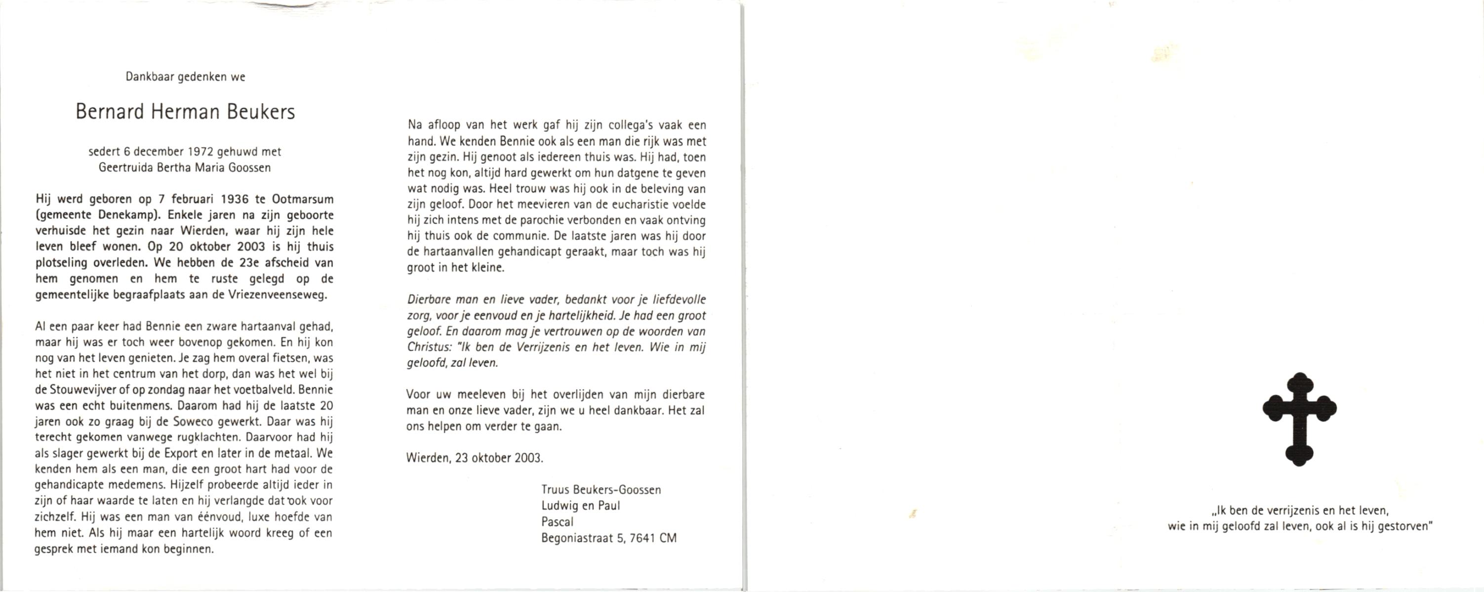 BEVERS, Bernard, geboren op 6-10-1918 te Enschede, overleden op 9-6-2001 te Enschede, ziekenhuis op 82-jarige leeftijd, gecremeerd op 13-6-2001 te Usselo.
