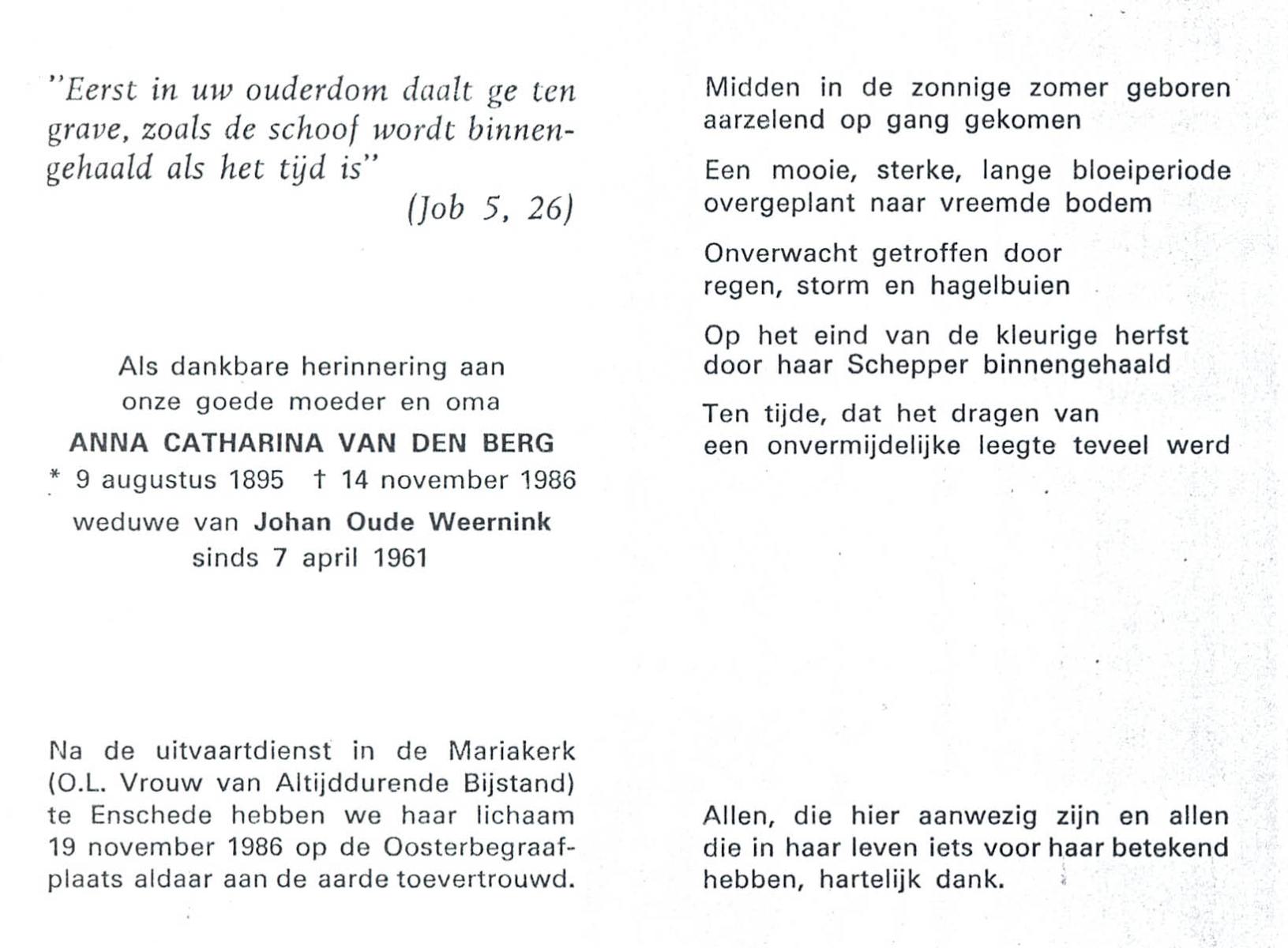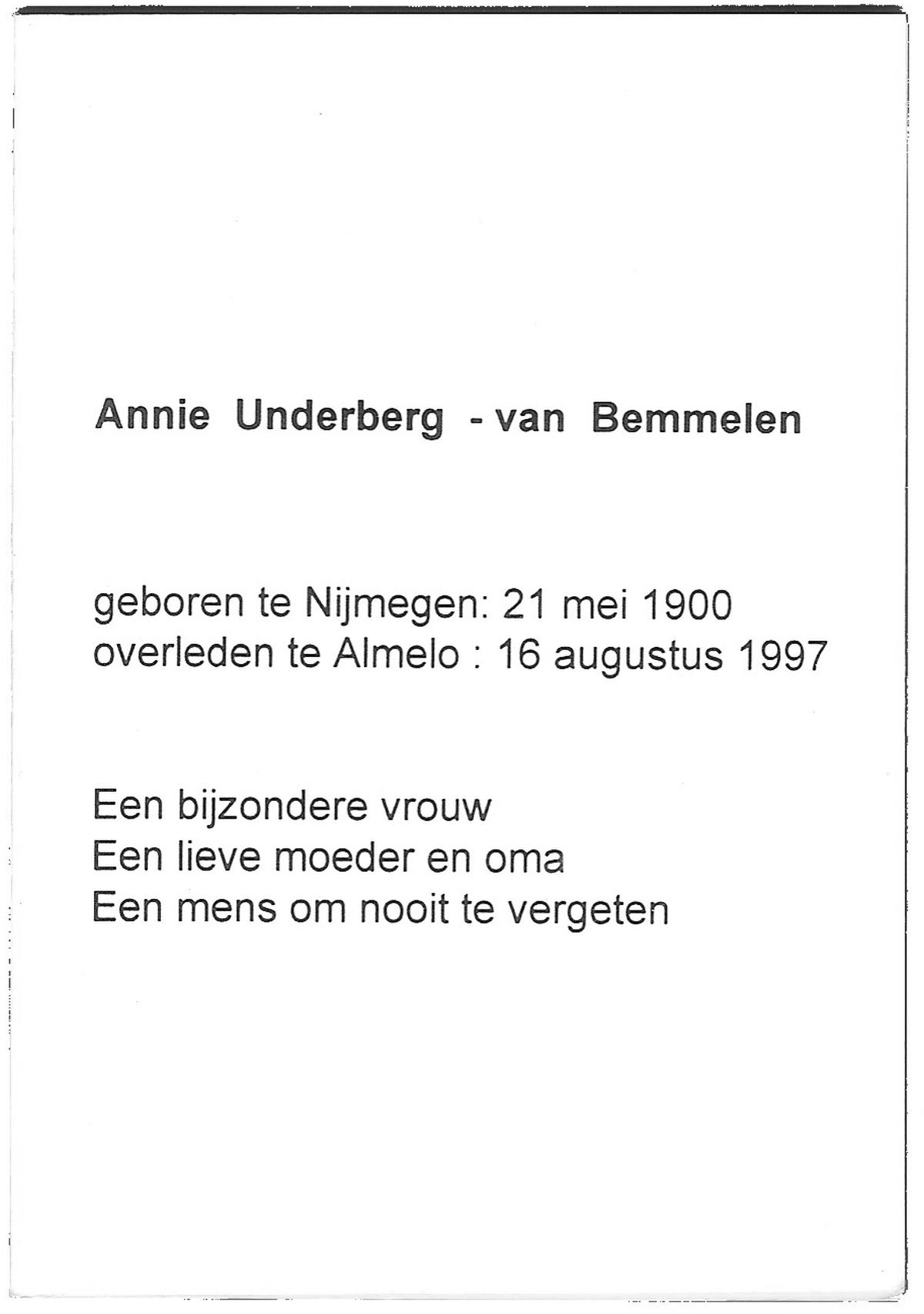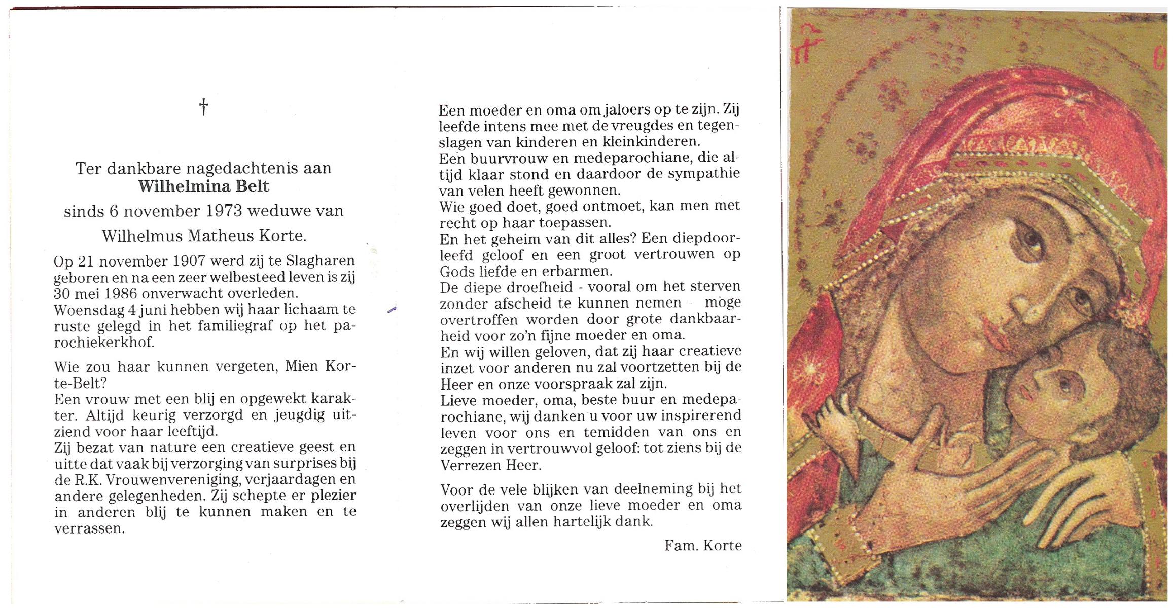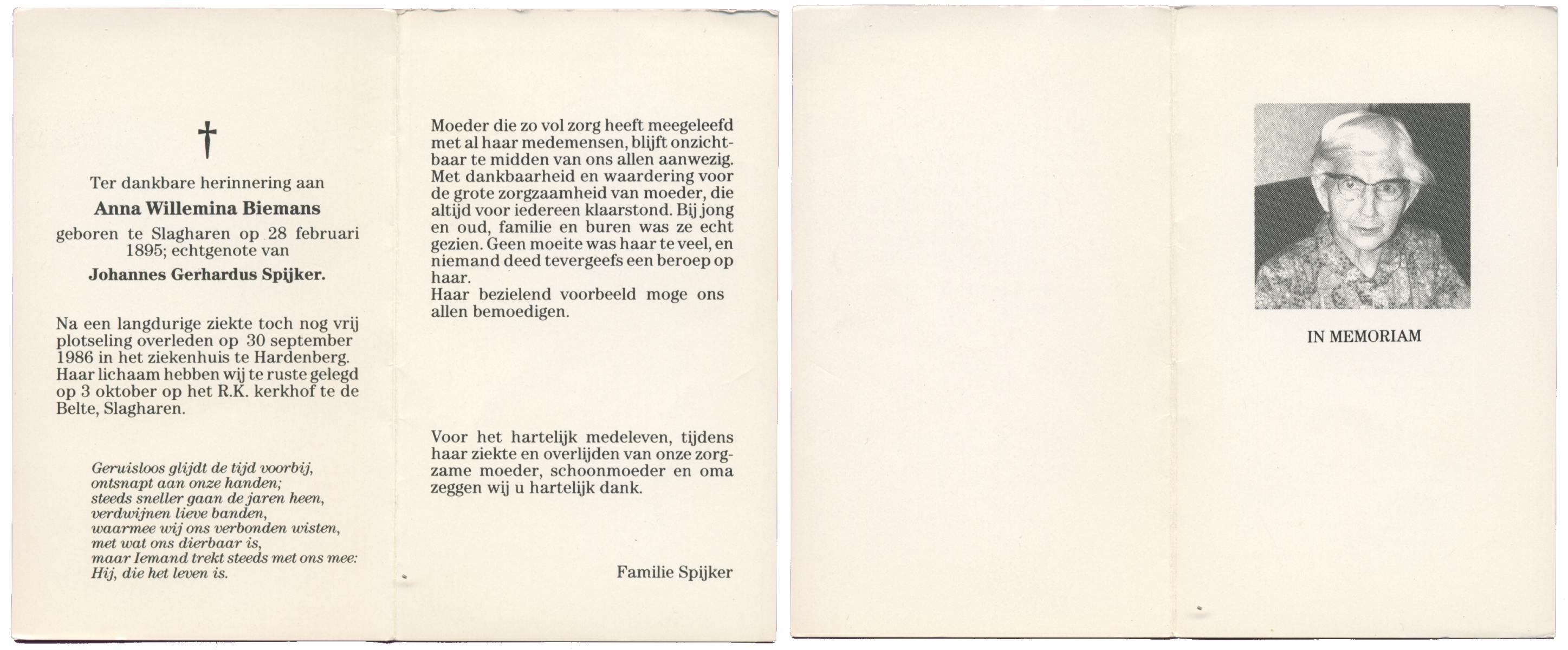 BIEMANS, Anna Willemina, geboren op 28-02-1895 te Slagharen, overleden op 30-9-1986 te Hardenberg op 91-jarige leeftijd, begraven op 3-10-1986 te Slagharen kerkhof de Belte.