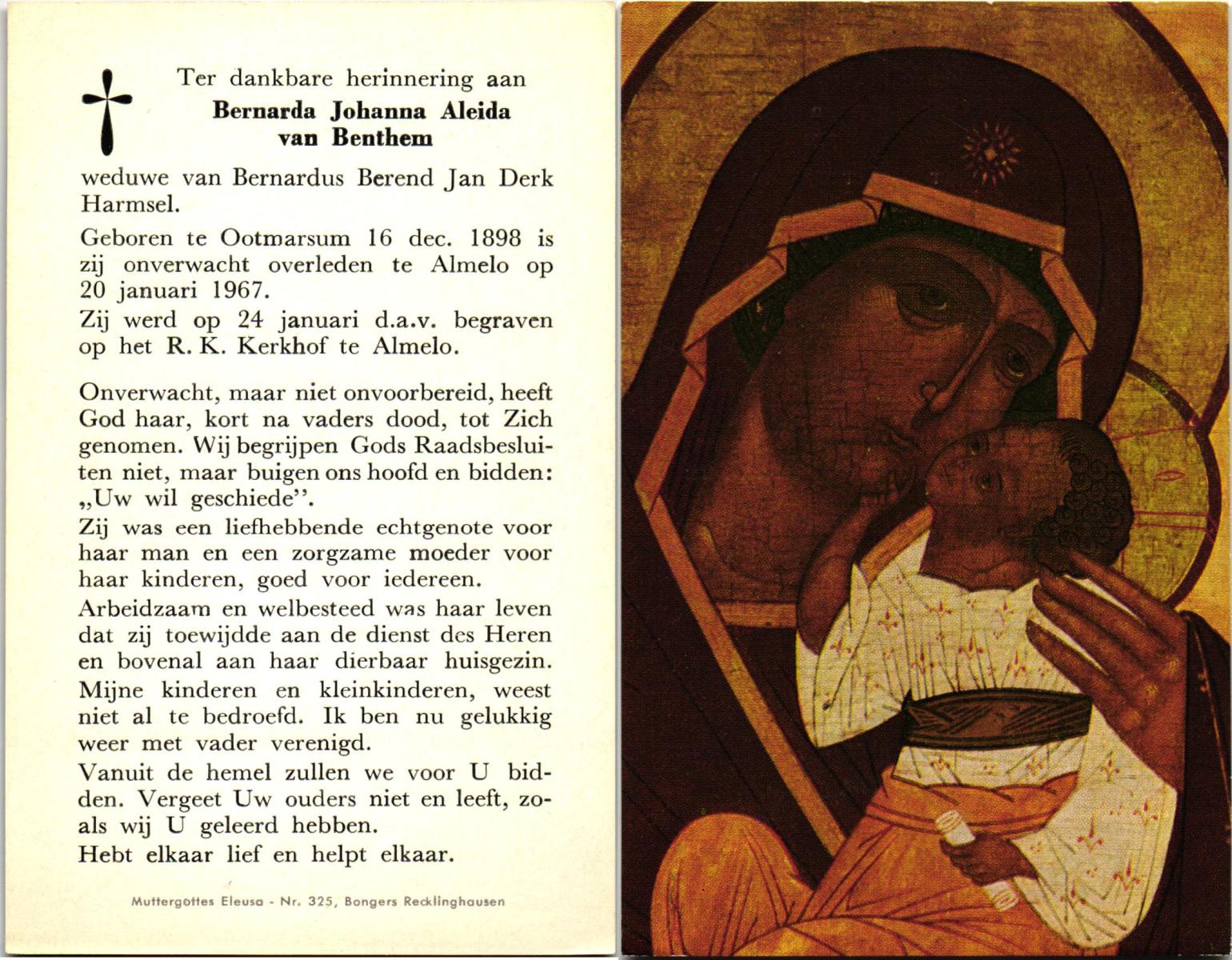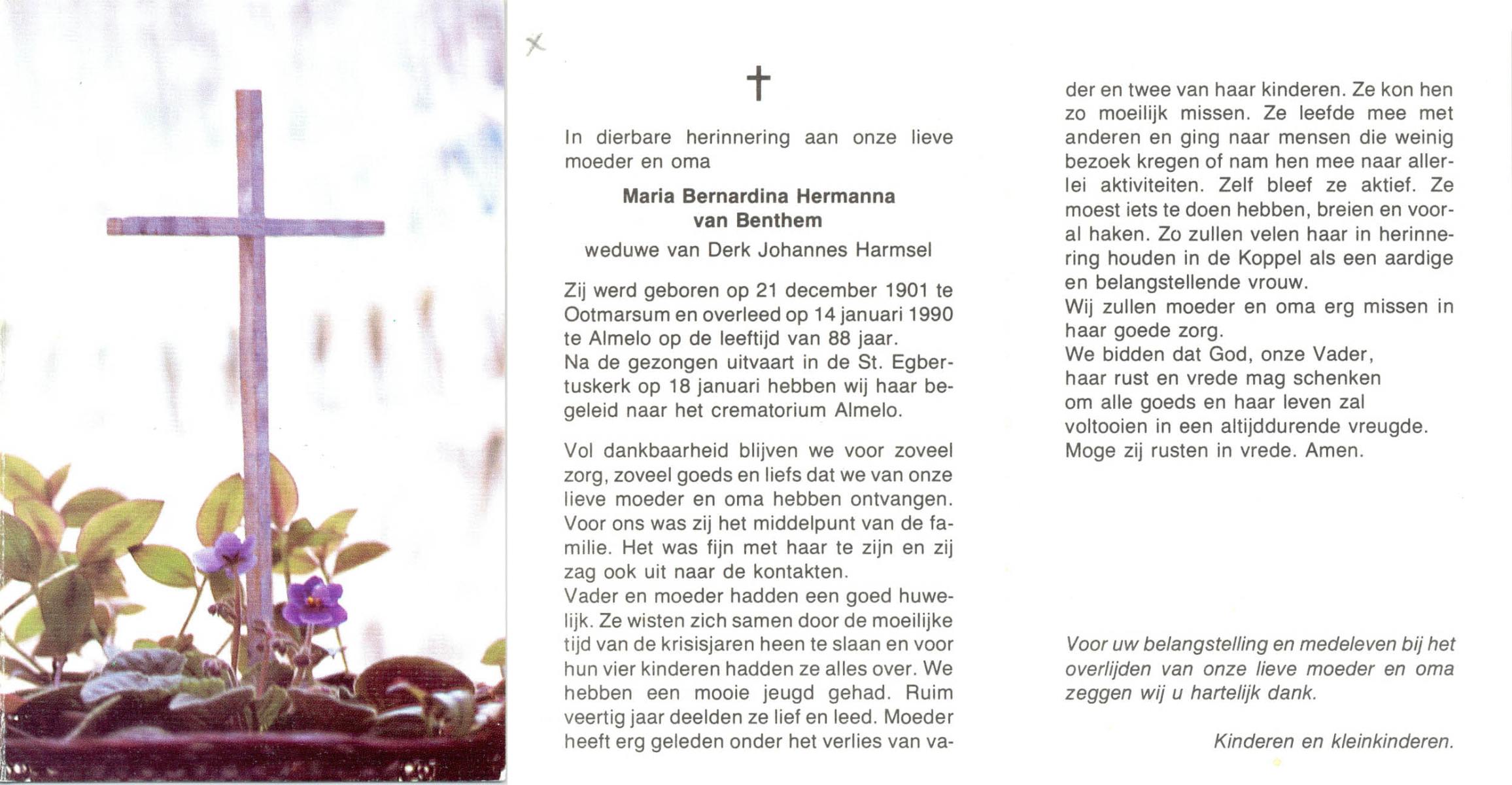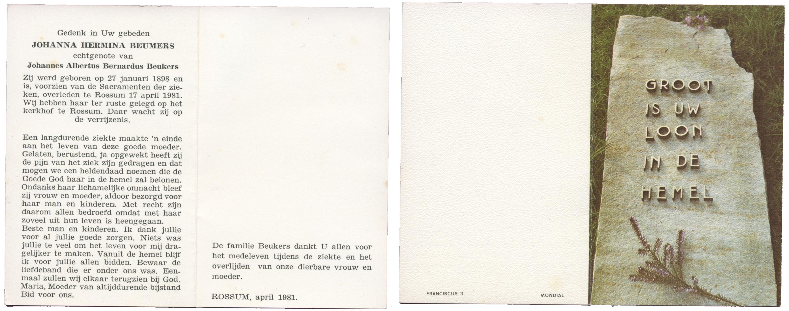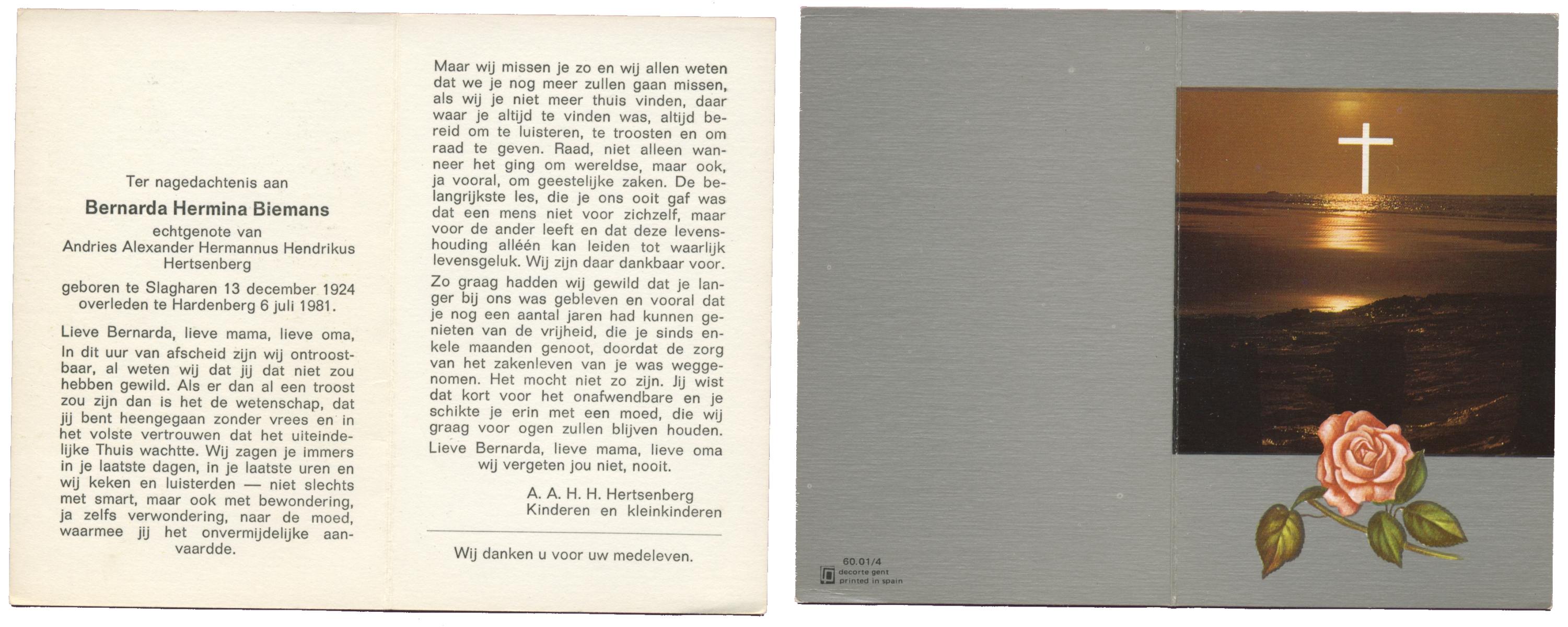 BIEMANS, Bernarda Hermina, geboren op 13-12-1924 te Slagharen, overleden op 6-7-1981 te Hardenberg op 56-jarige leeftijd.