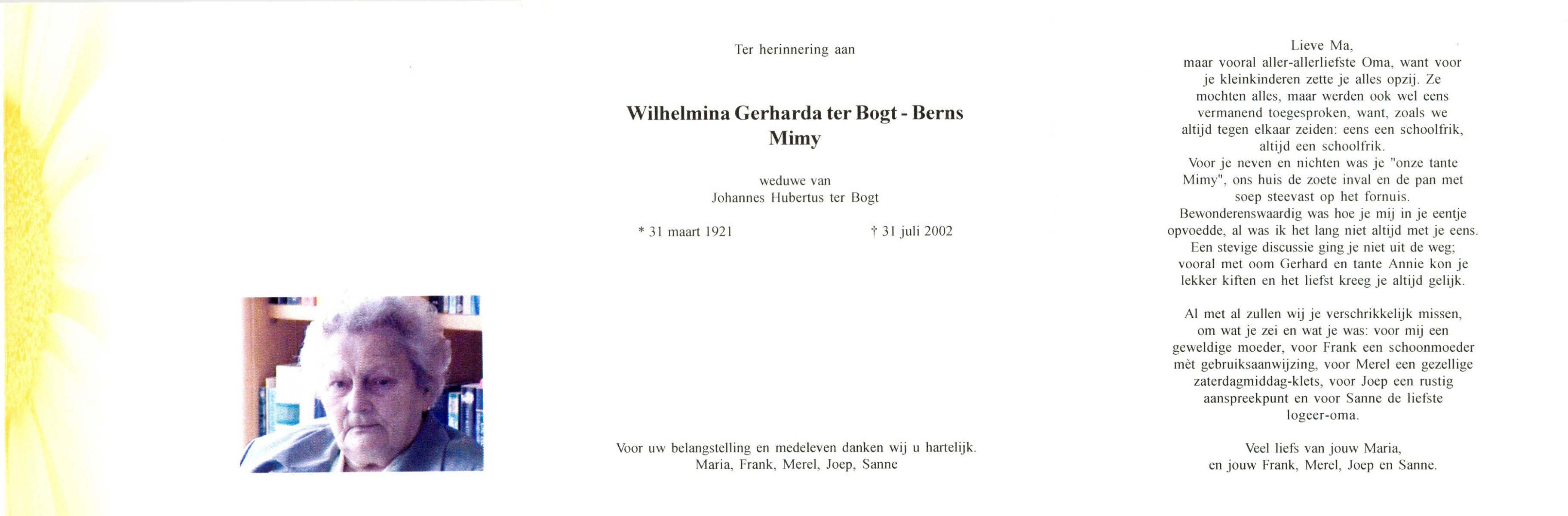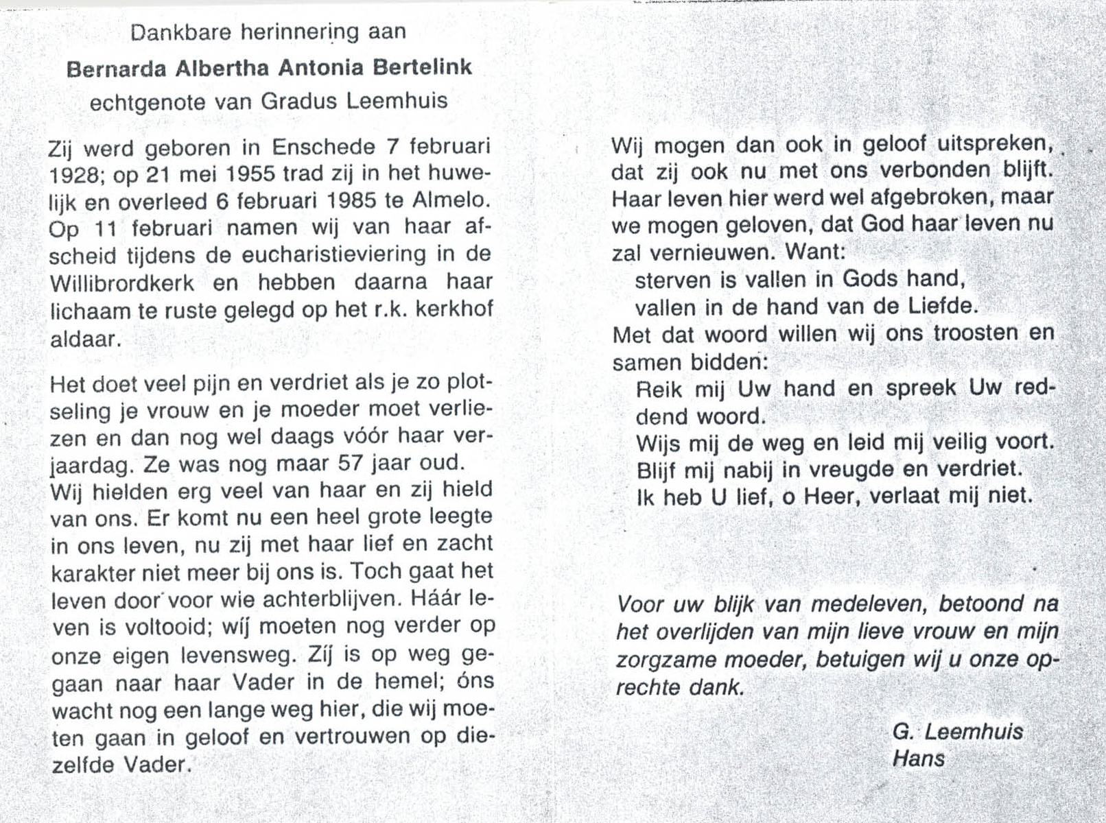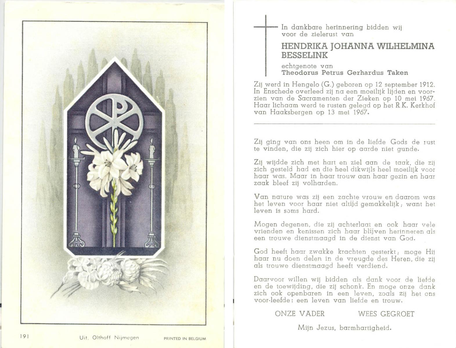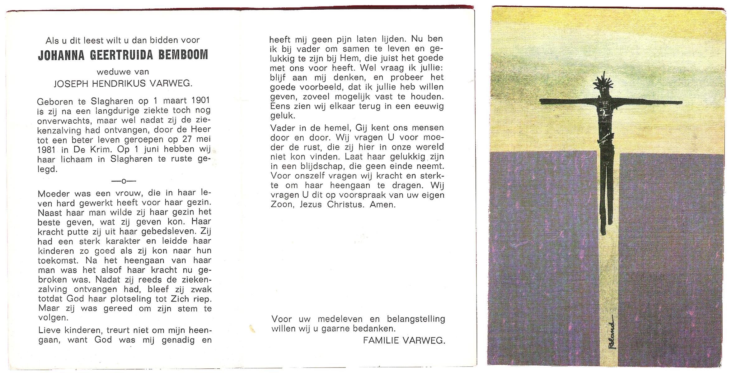 BIEMANS, Bernarda Hermina, geboren op 13-12-1924 te Slagharen, overleden op 6-7-1981 te Hardenberg op 56-jarige leeftijd.