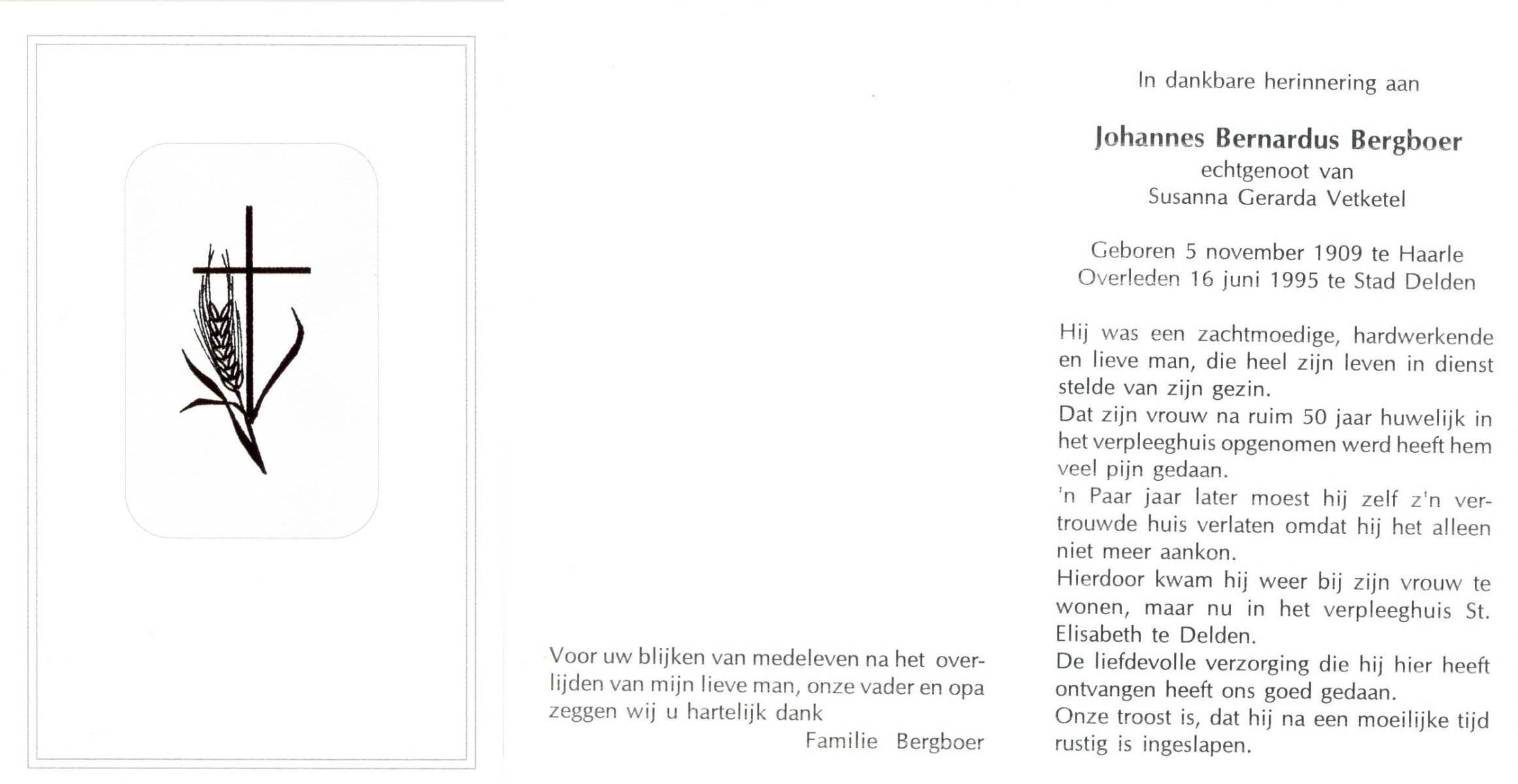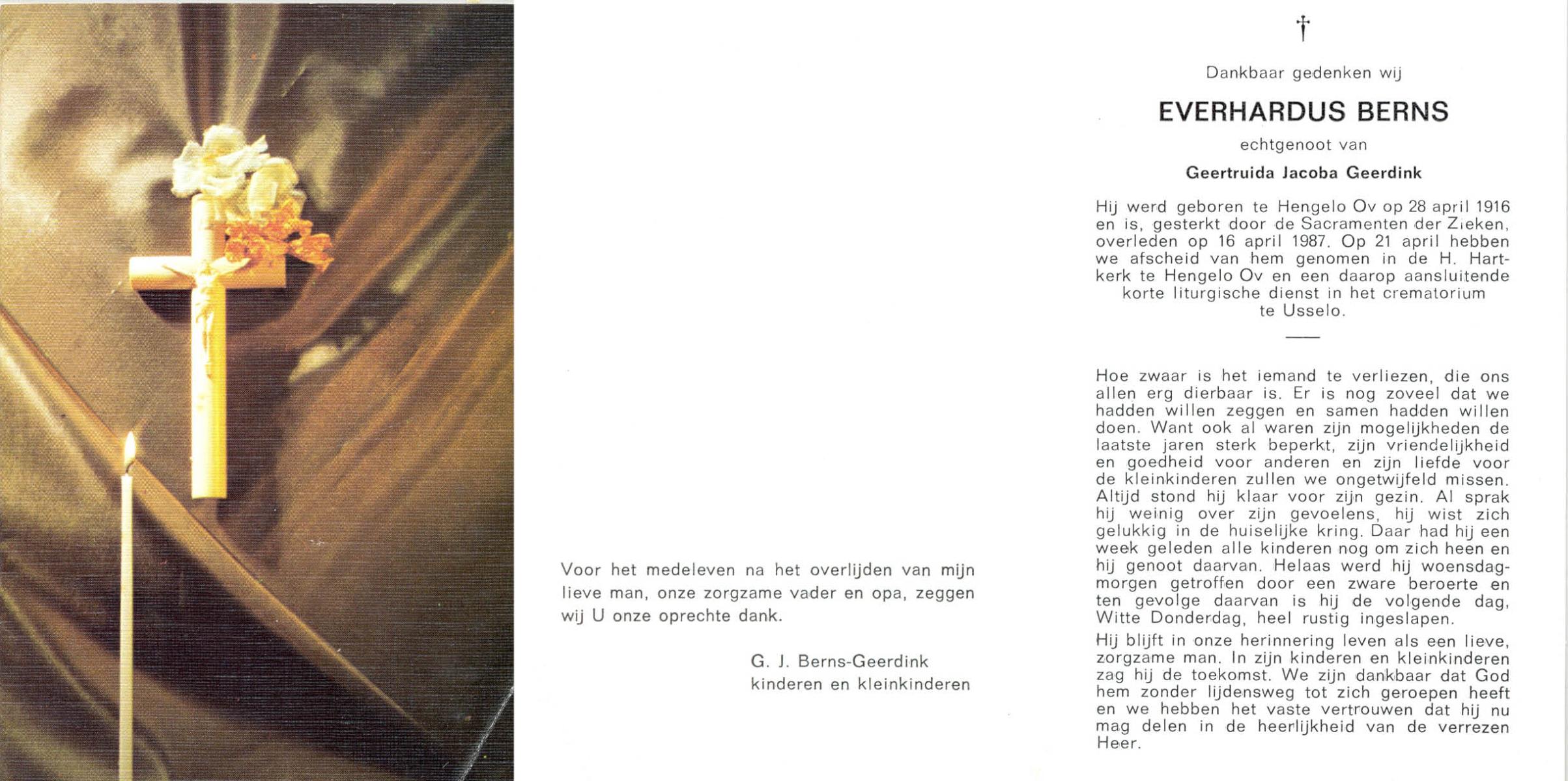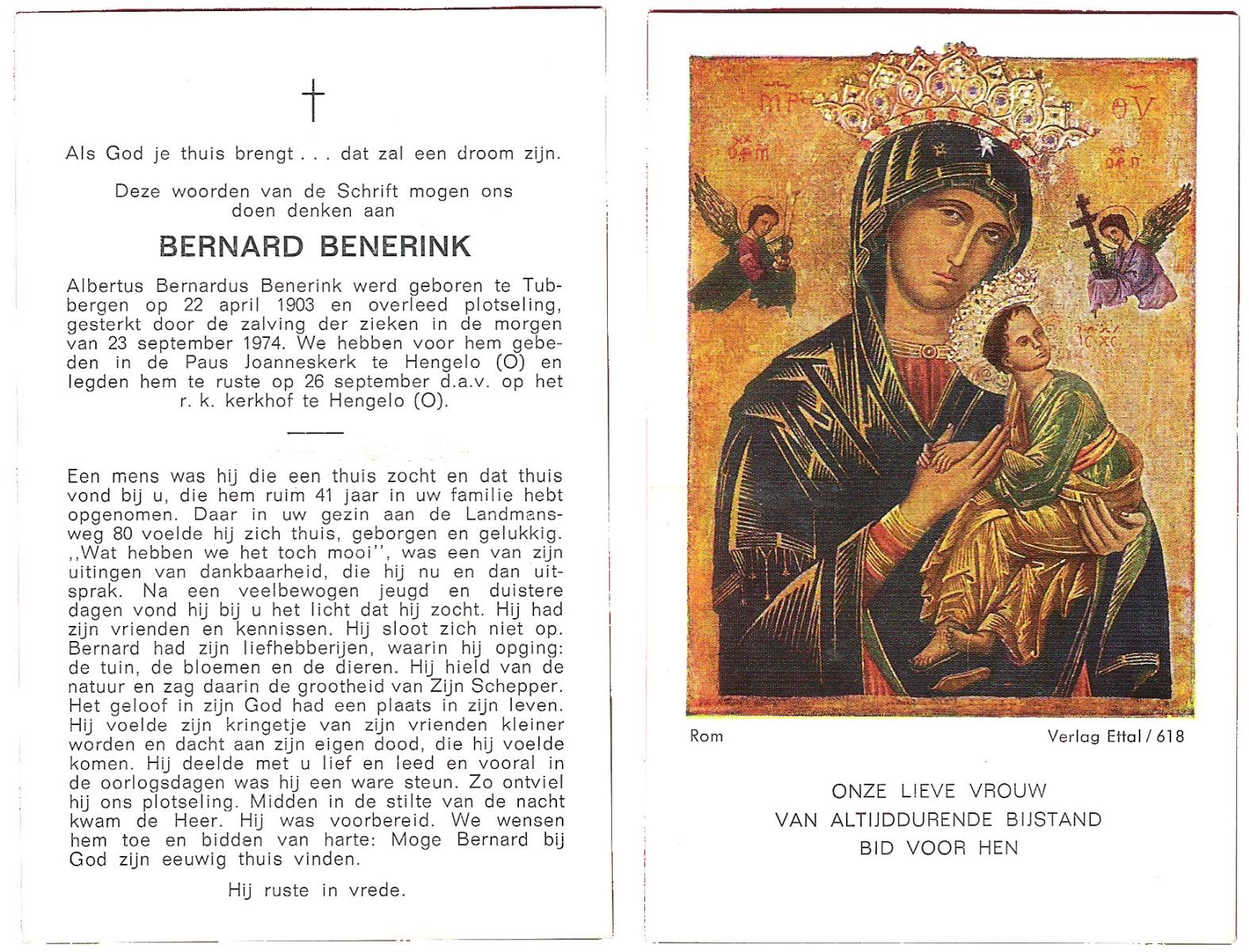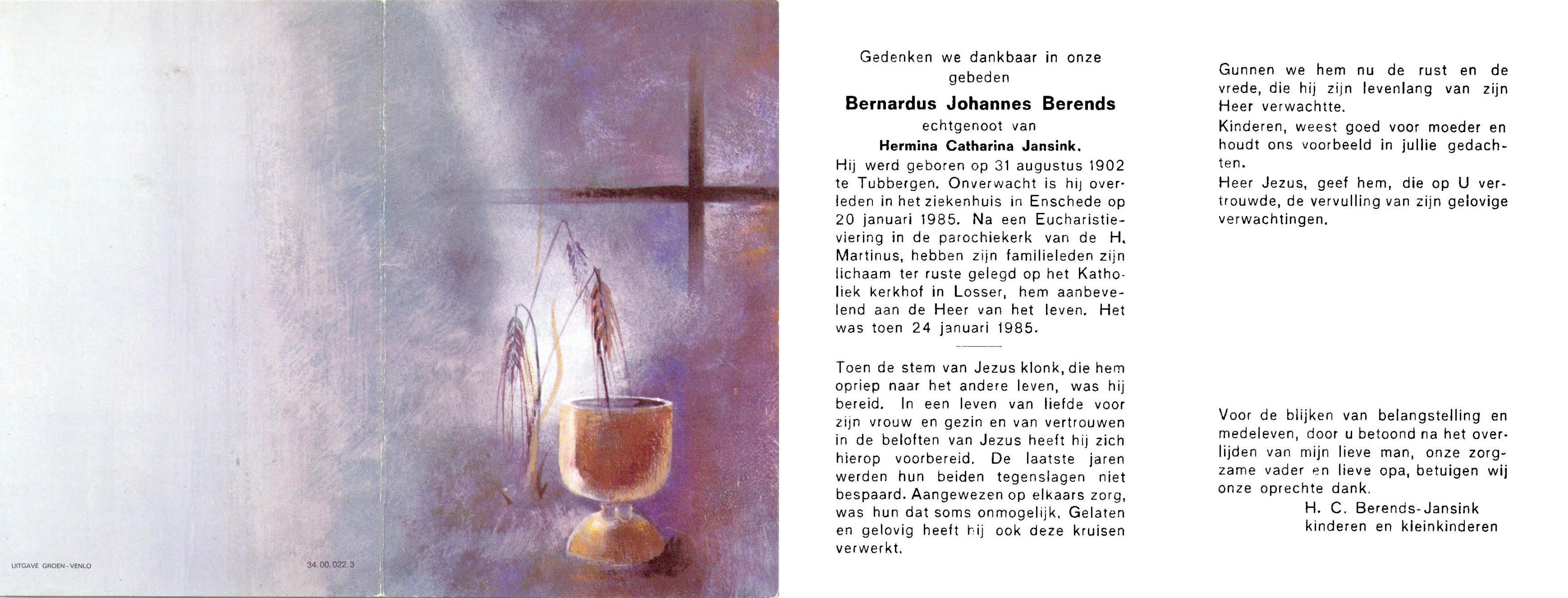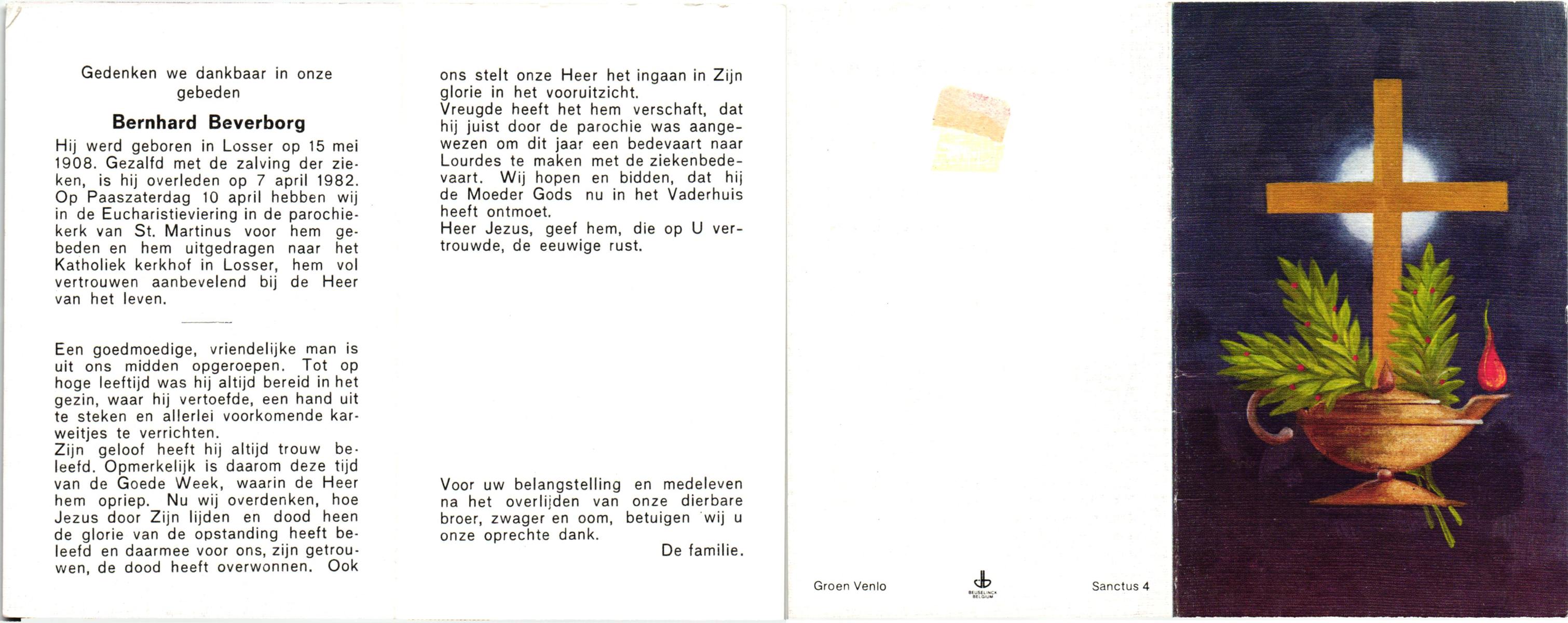 BEVERBORG, Bernard, geboren op 15-5-1908 te Losser, overleden op 7-4-1982 op 73-jarige leeftijd, begraven op 10-4-1982 te Losser.