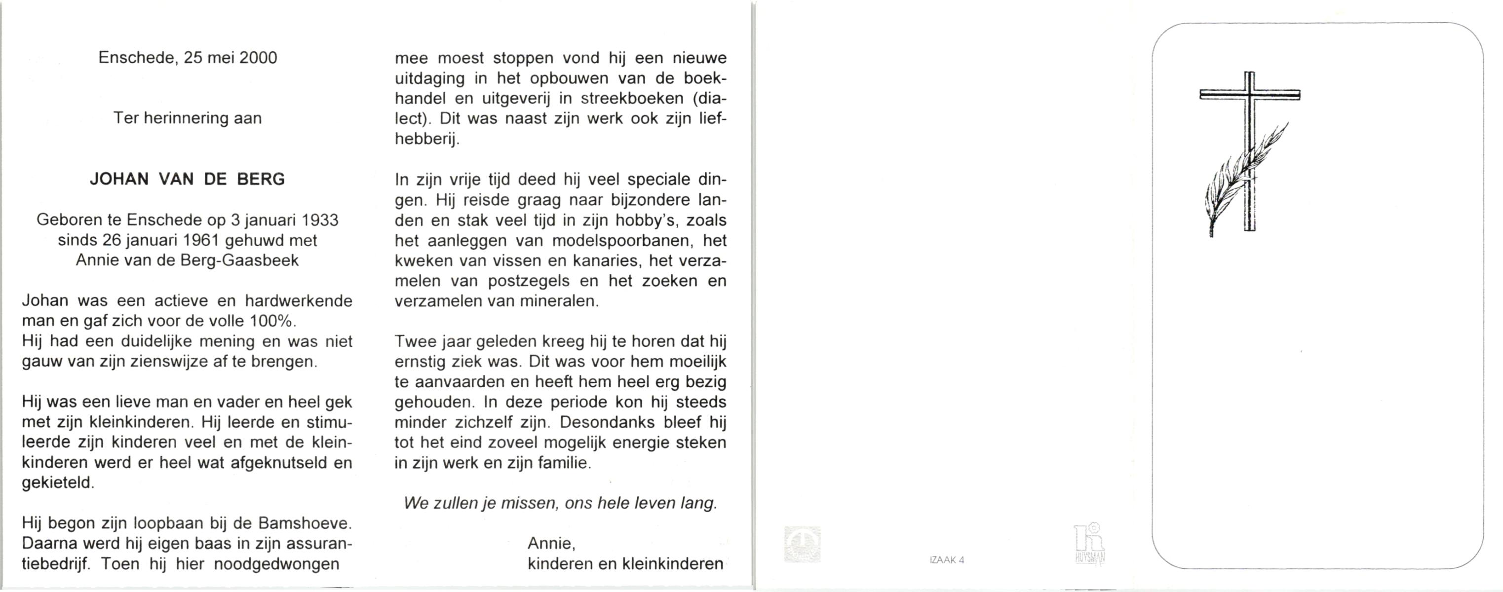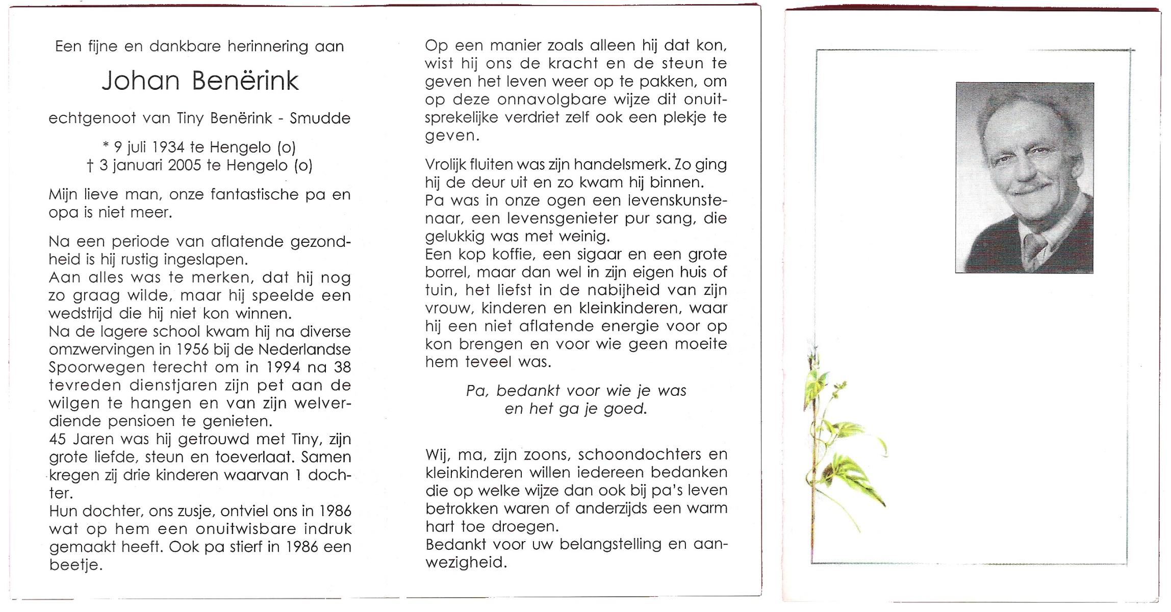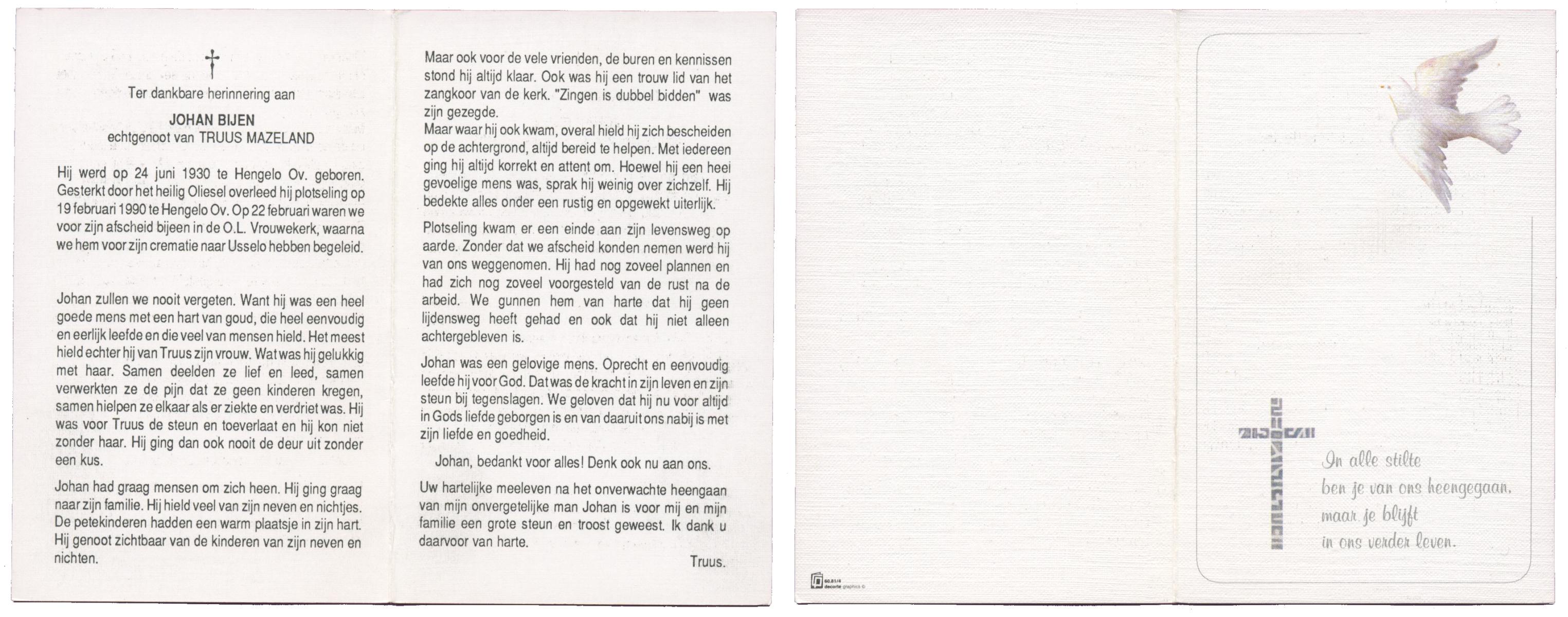 BIJEN, Johan, geboren op 24-6-1930 te Hengelo (O), overleden op 19-2-1990 te Hengelo (Ov.) op 59-jarige leeftijd, gecremeerd op 22-2-1990 te Usselo.