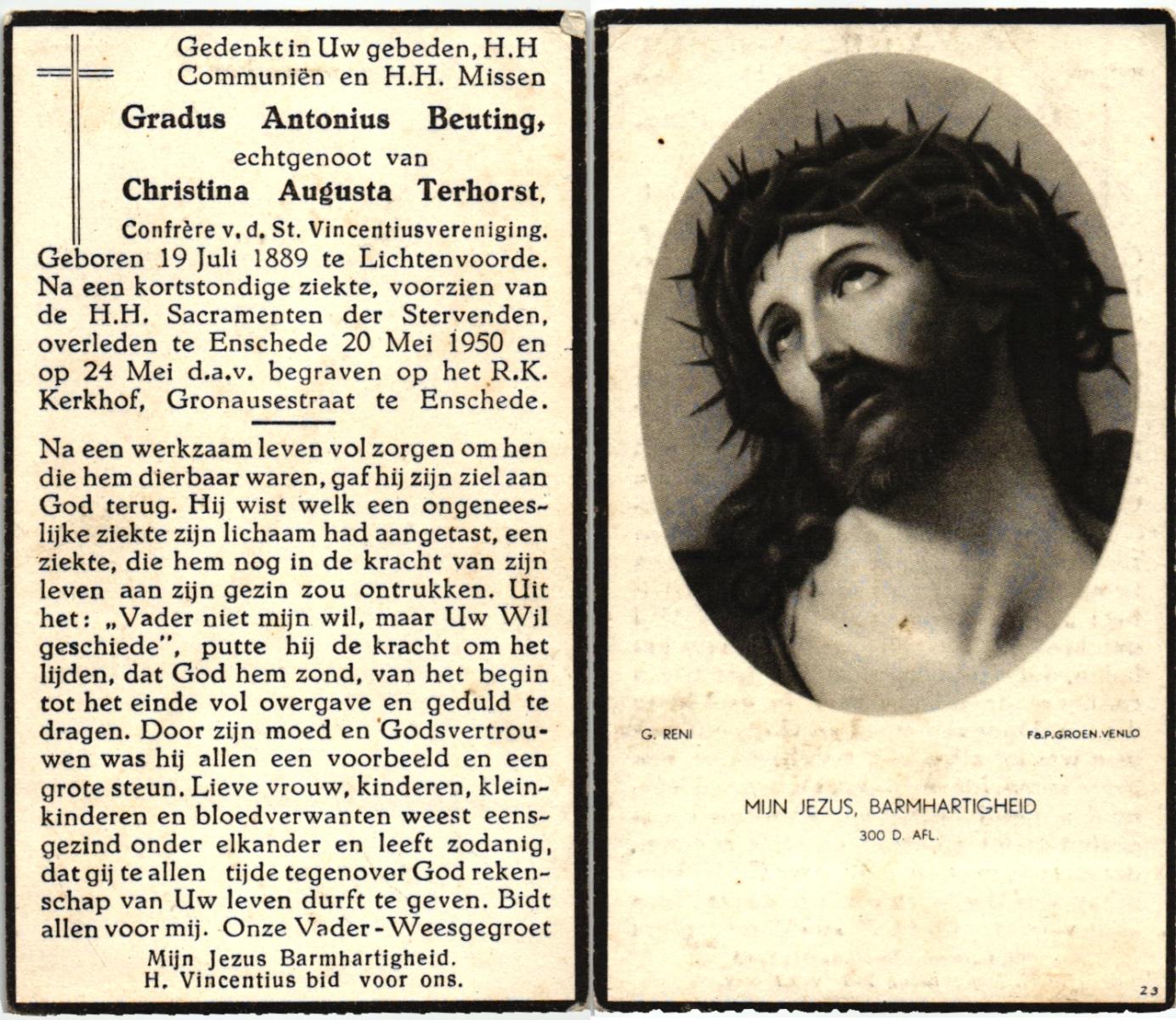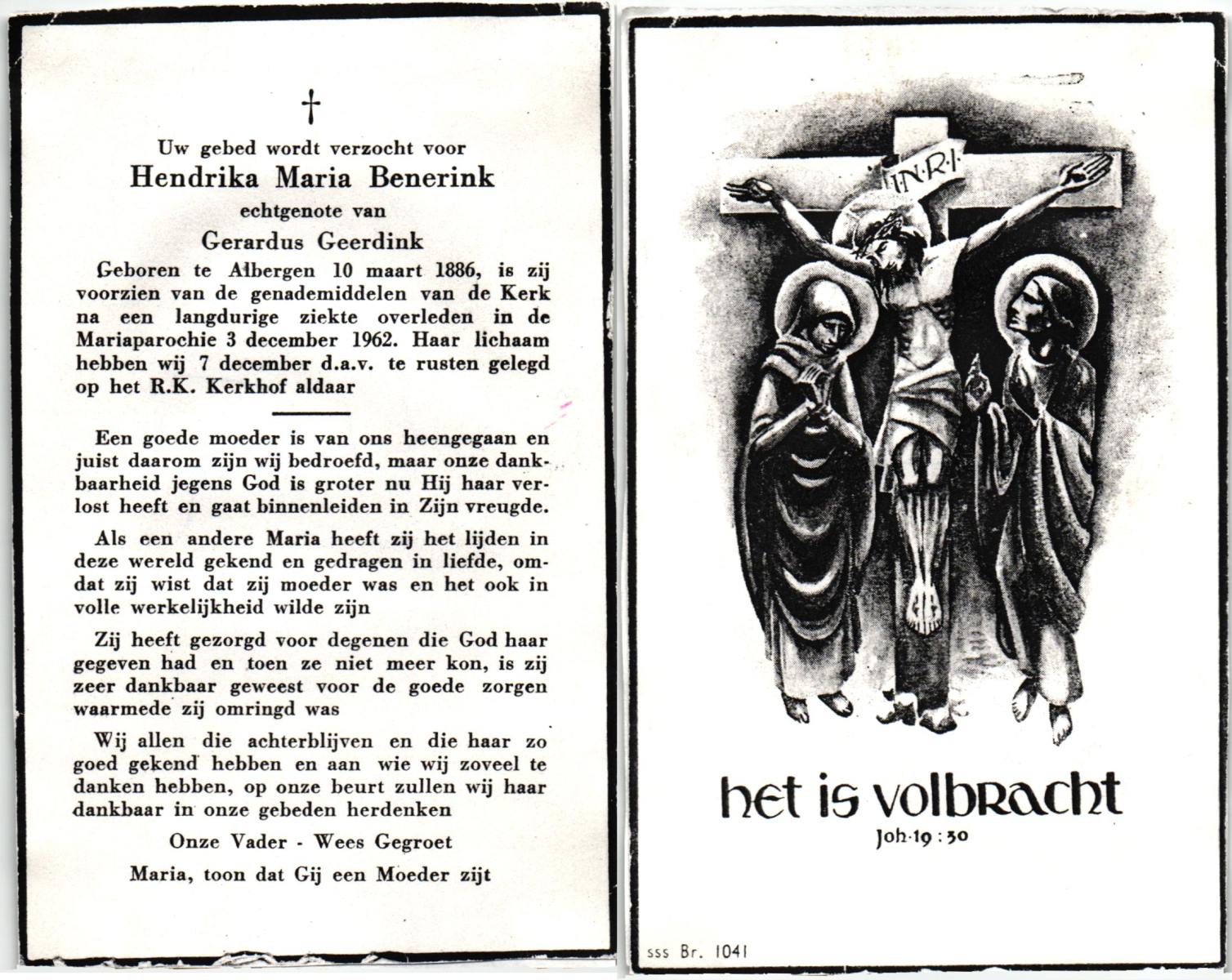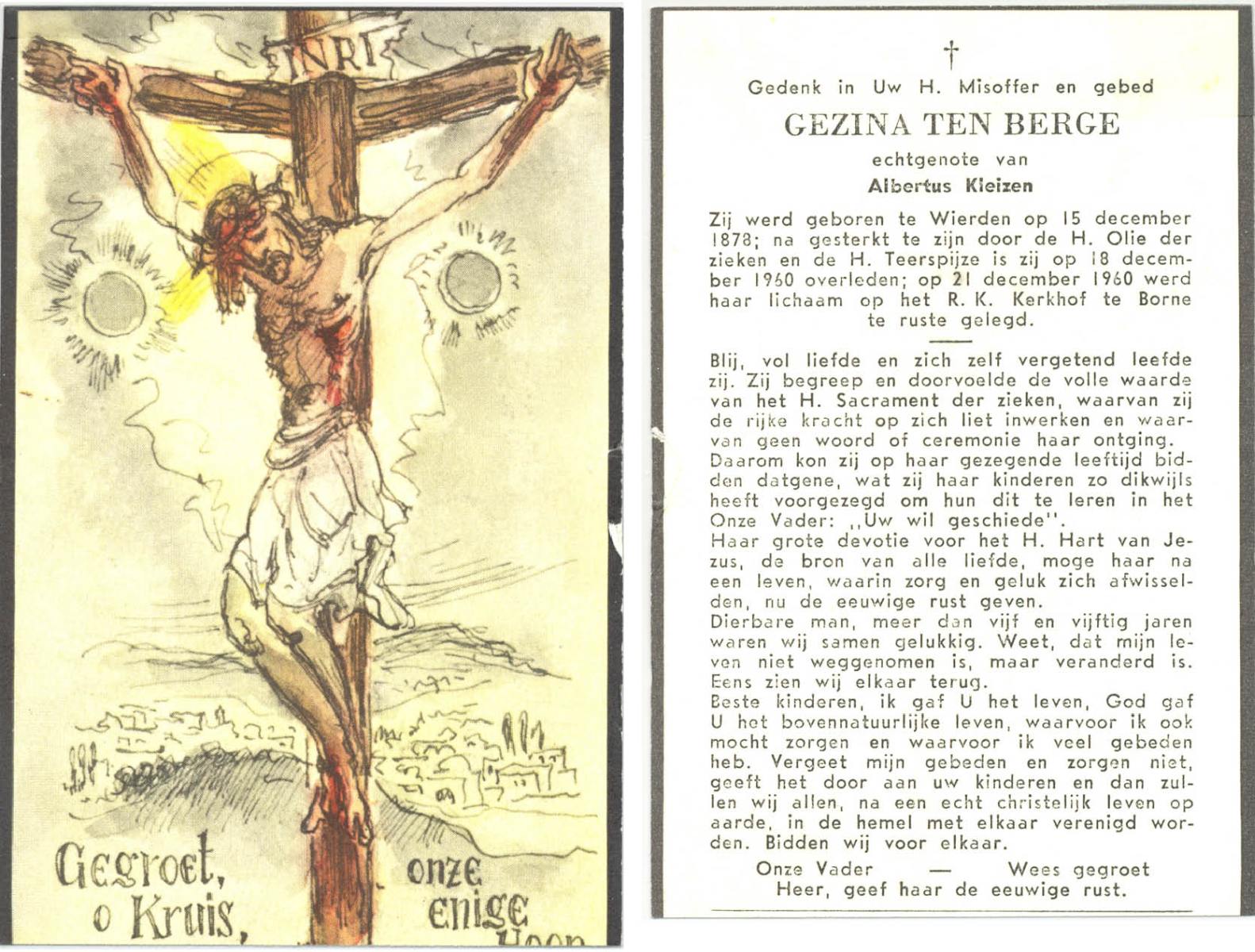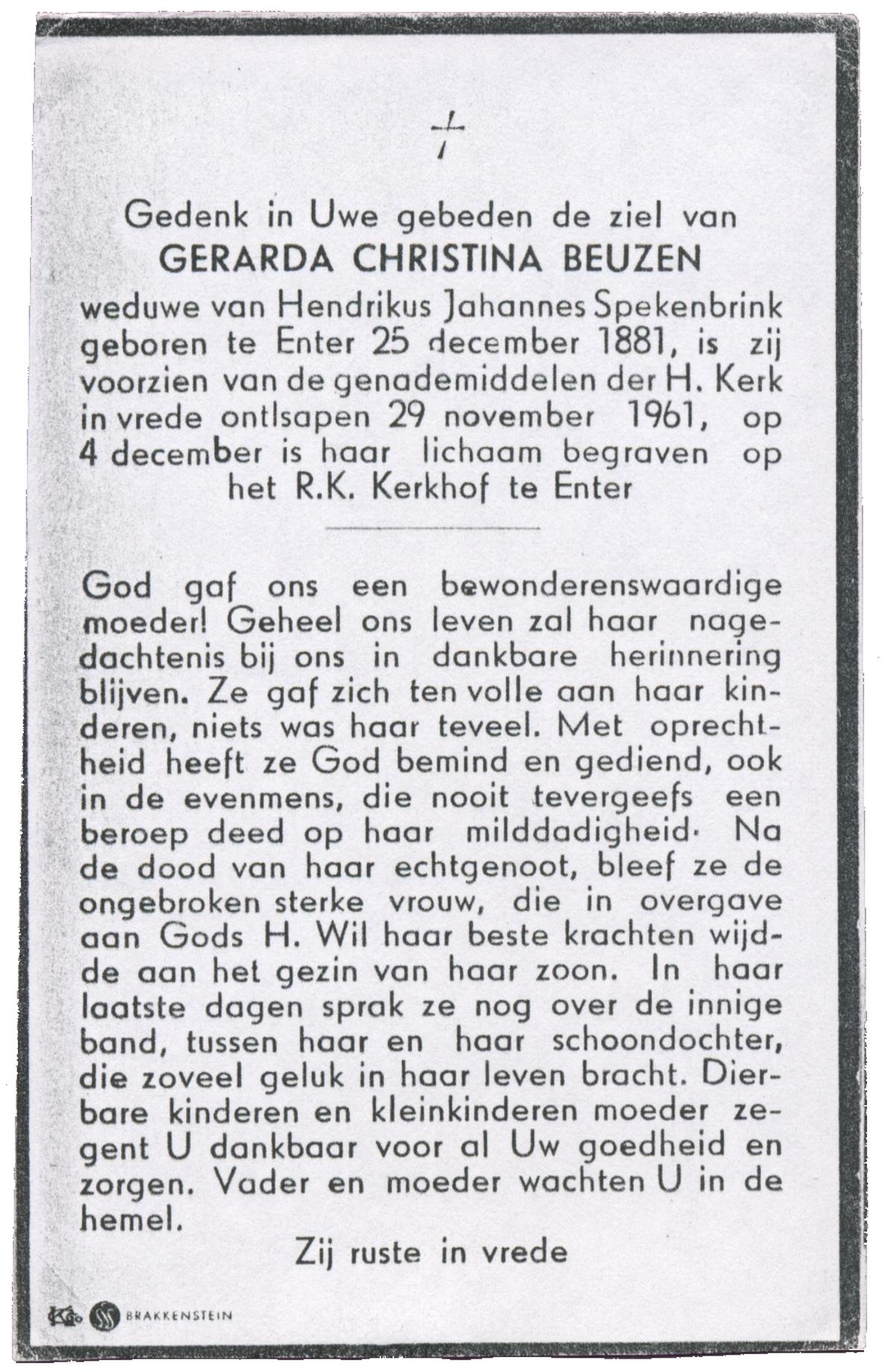 BEUZEN, Gerarda Christina, geboren op 25-12-1881 te Enter, overleden op 29-11-1961 te Enter op 79-jarige leeftijd, begraven op 4-12-1961 te Enter.