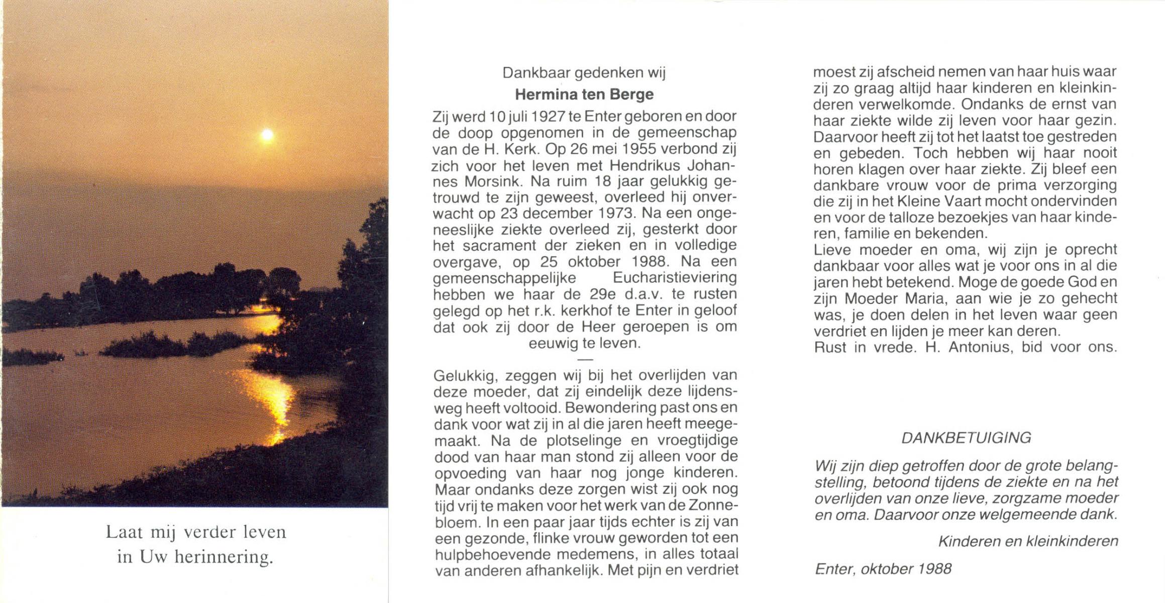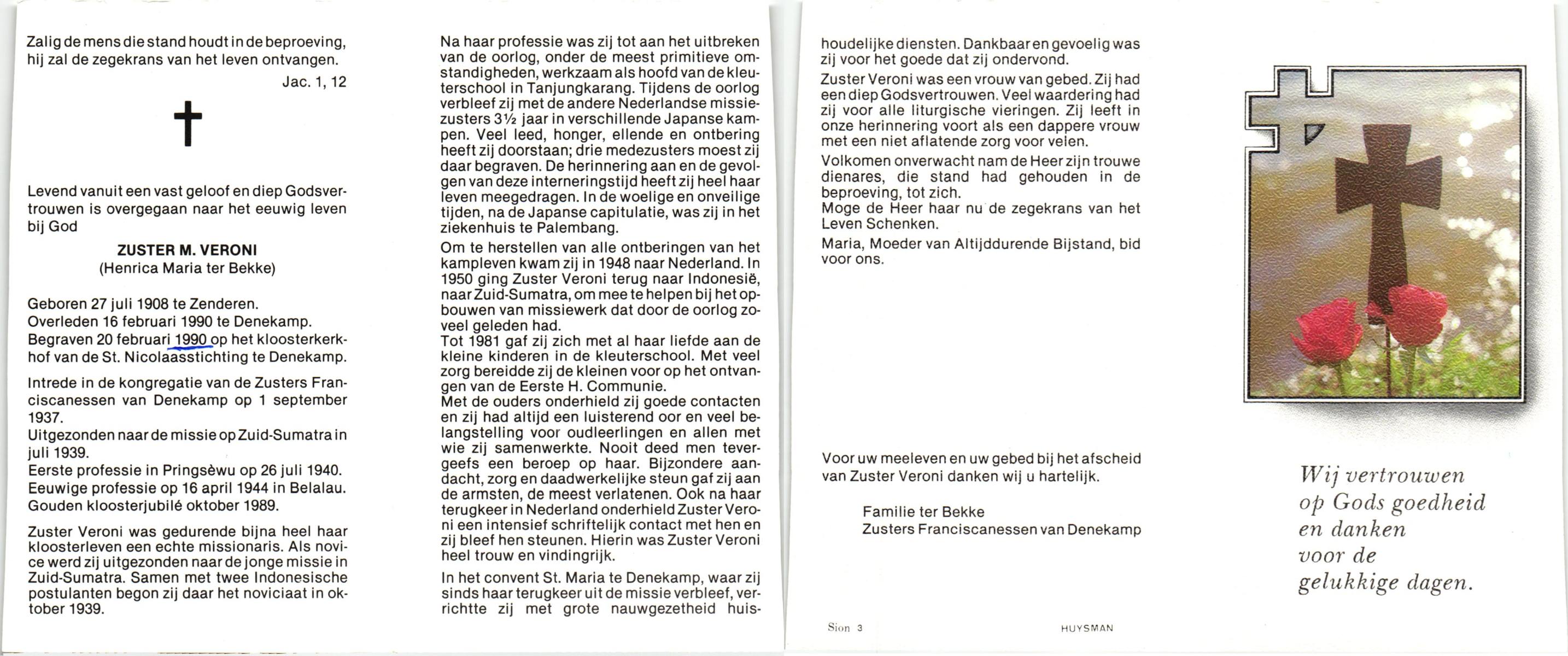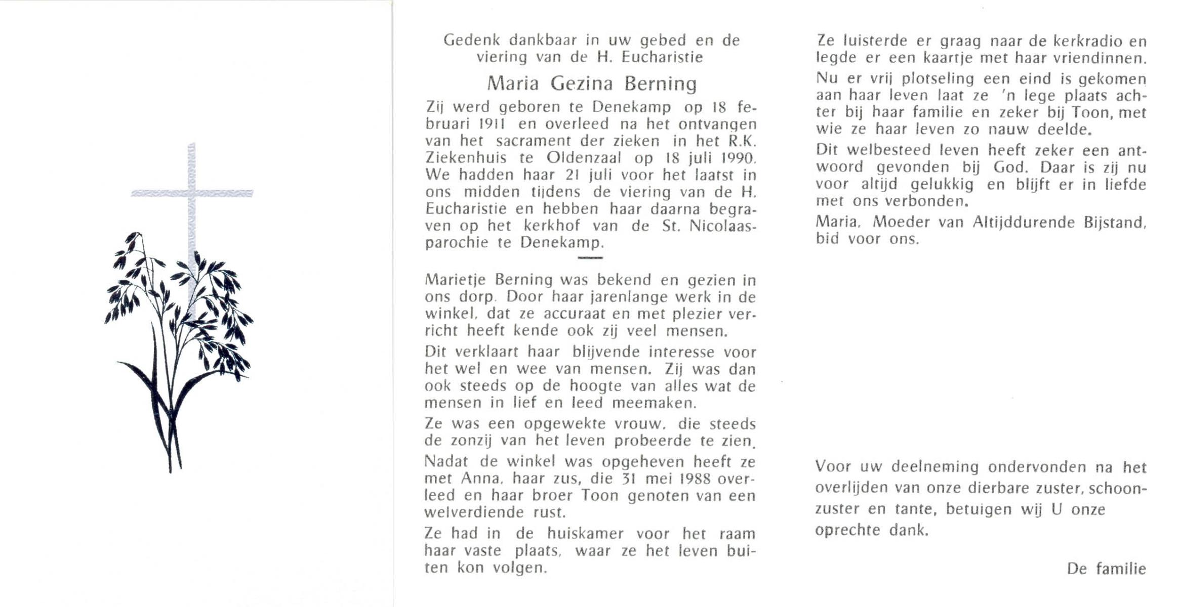 BEKKE, ter, Henrica Maria, geboren op 27-7-1908 te Zenderen, overleden op 16-2-1990 te Denekamp op 80-jarige leeftijd, begraven op 20-2-1990 te Denekamp.