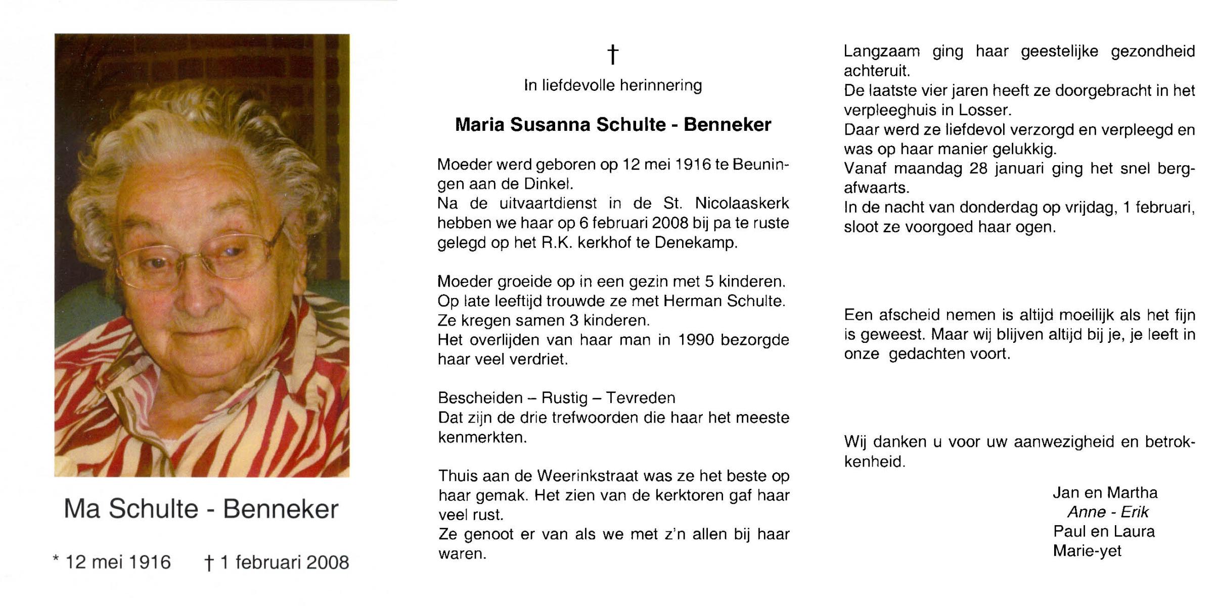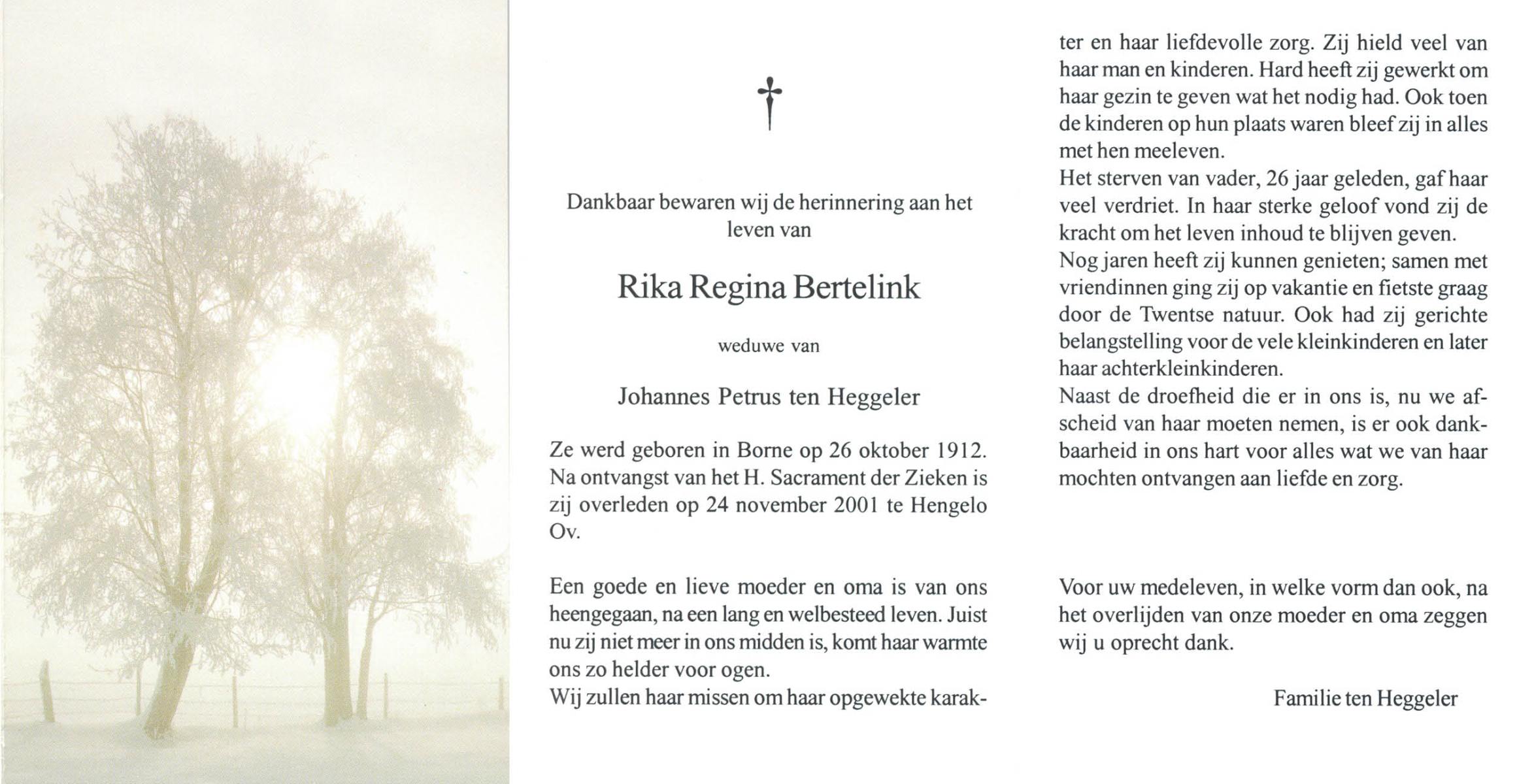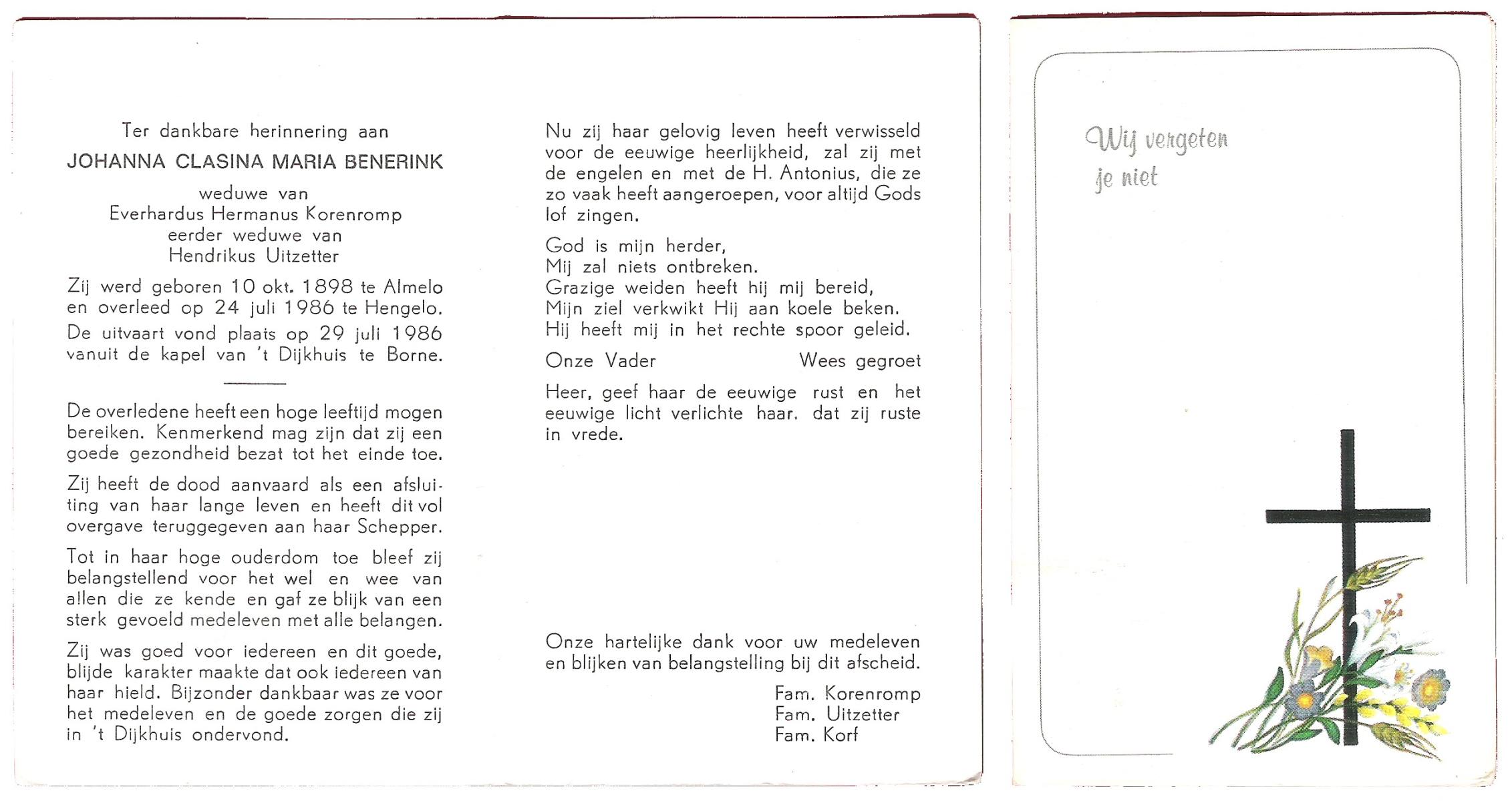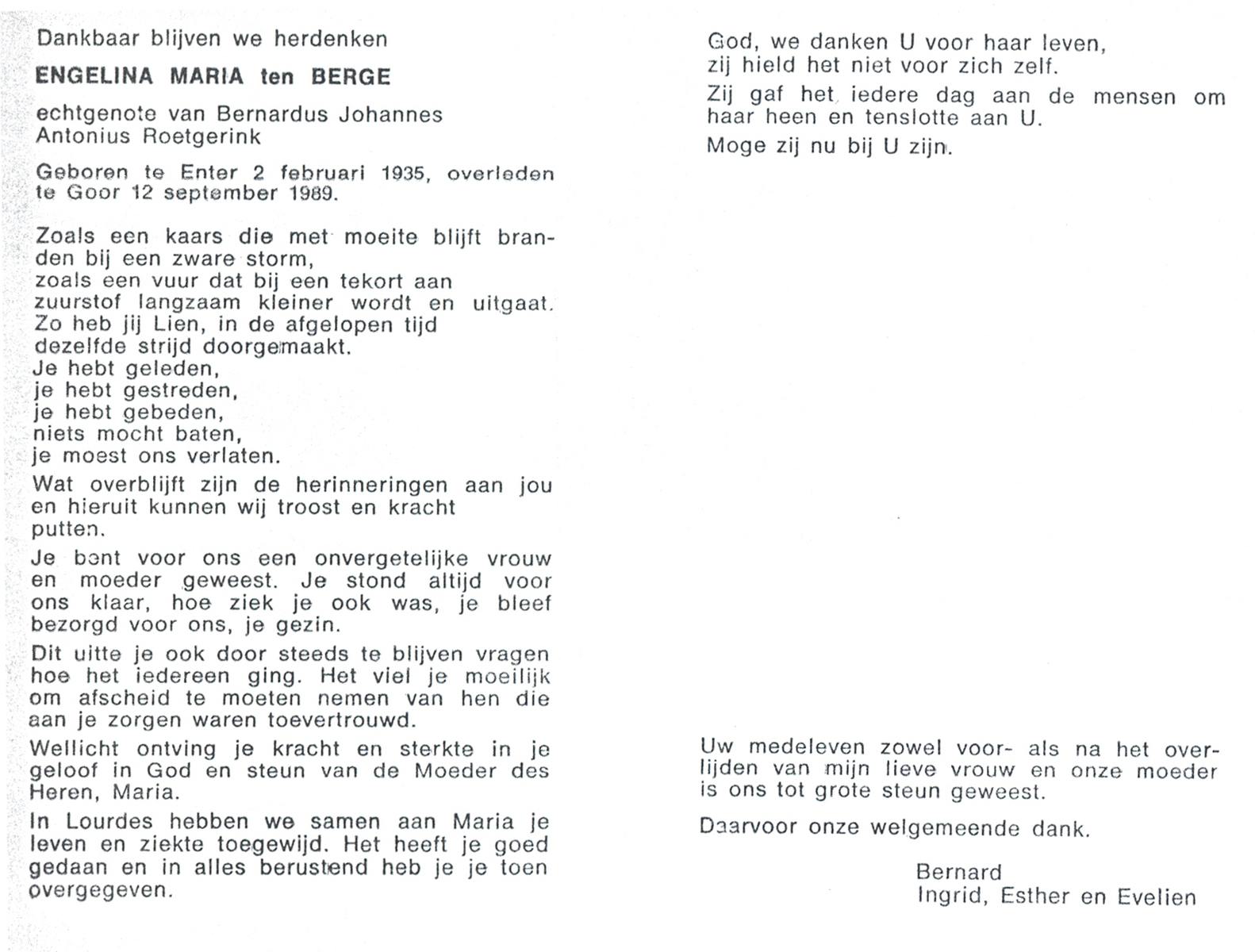 BEKKE, ter, Henrica Maria, geboren op 27-7-1908 te Zenderen, overleden op 16-2-1990 te Denekamp op 80-jarige leeftijd, begraven op 20-2-1990 te Denekamp.