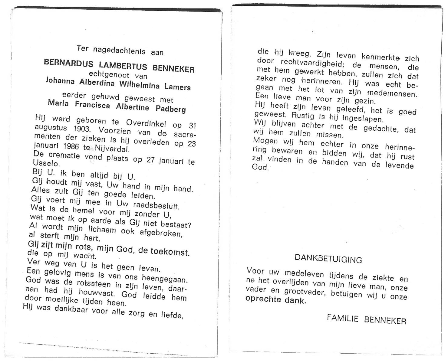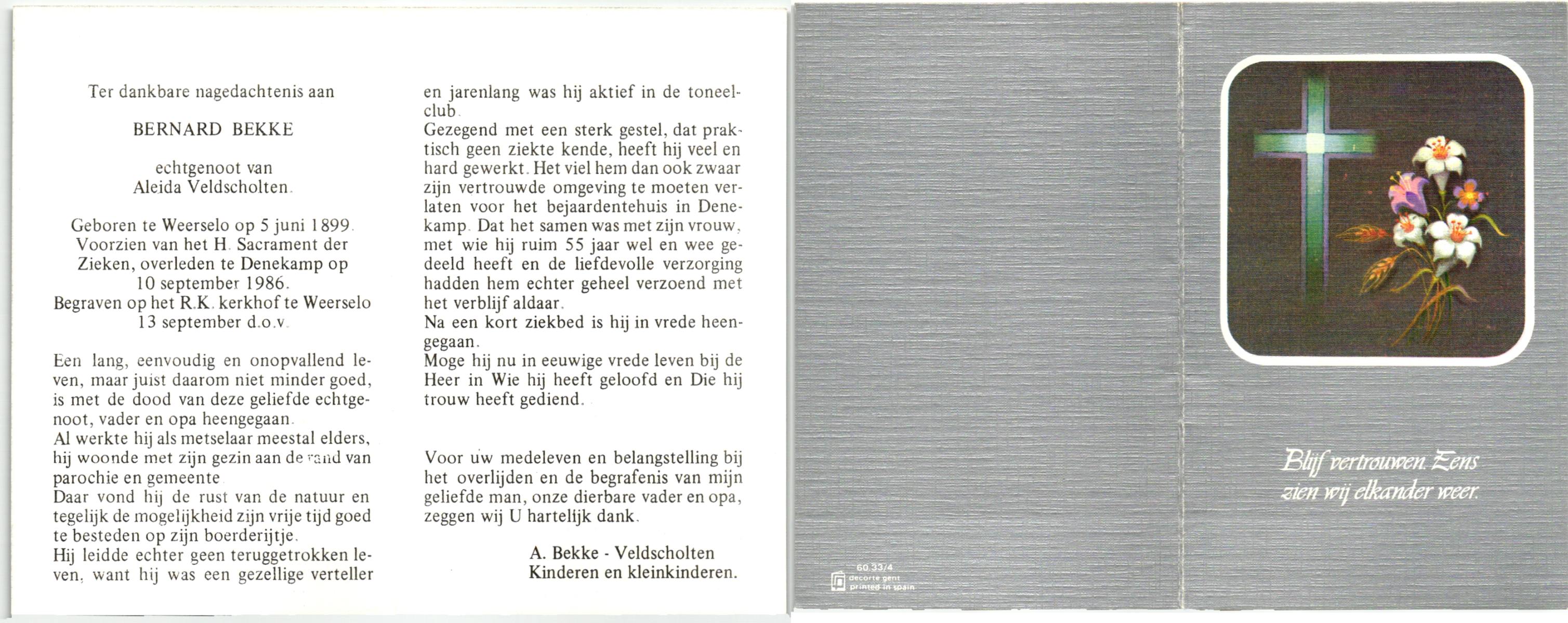 BEKKE, , Bernard, geboren op 05-06-1899 te Weerselo, overleden op 10-9-1986 te Denekamp op 87-jarige leeftijd, begraven op 13-9-1986 te Weerselo.