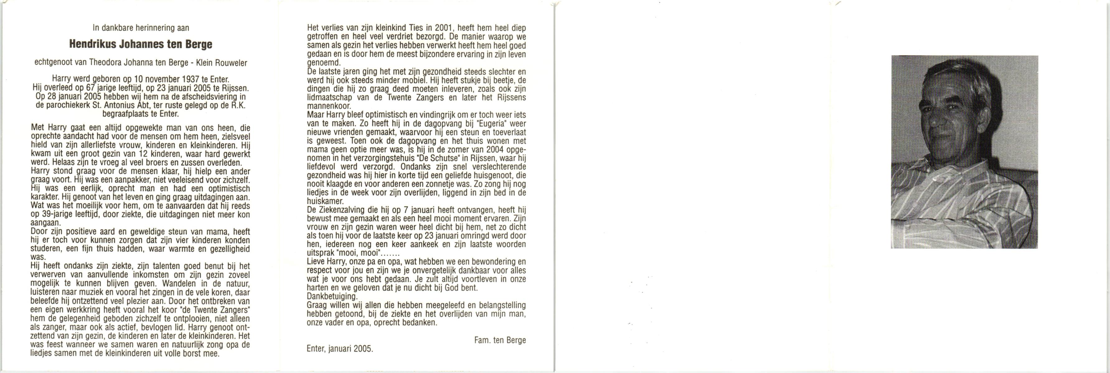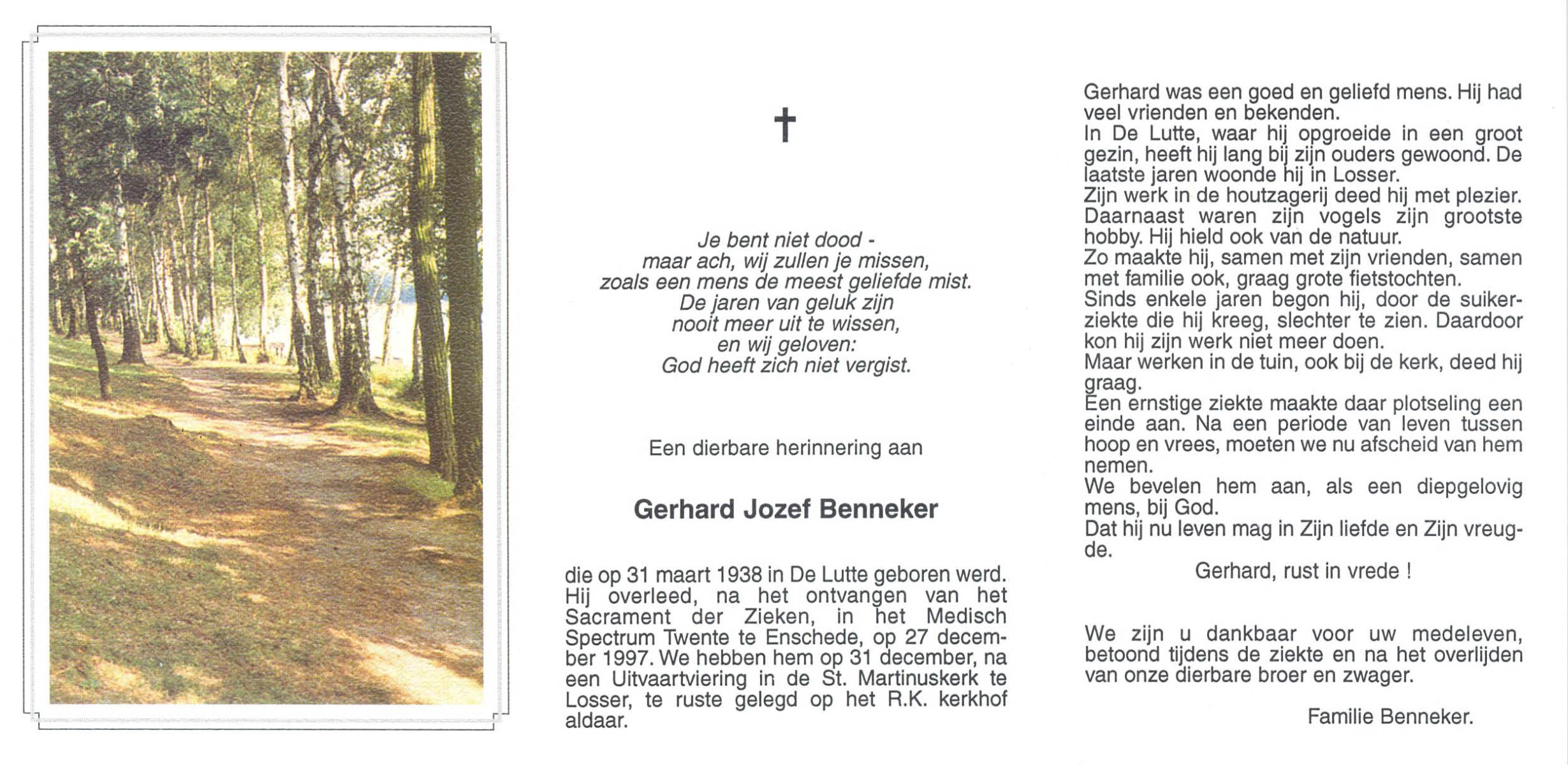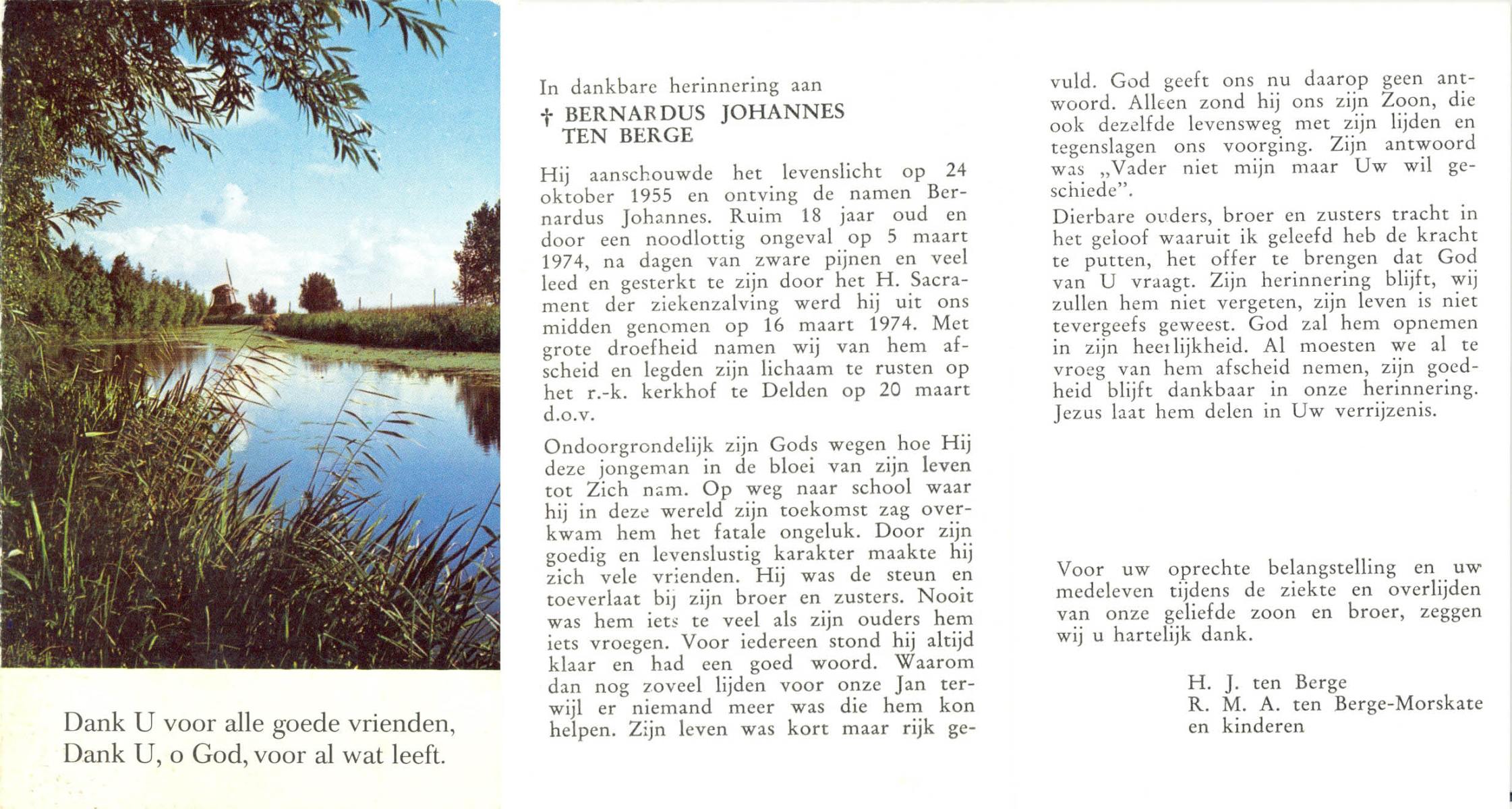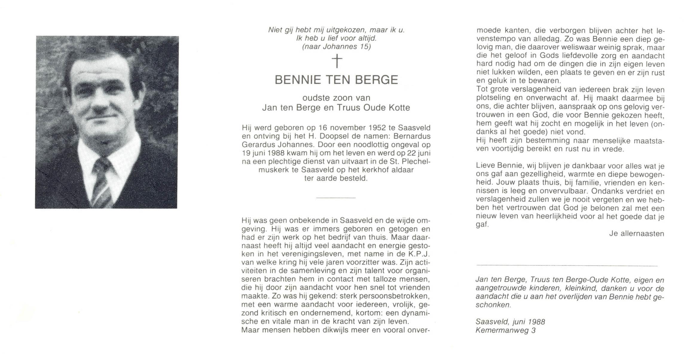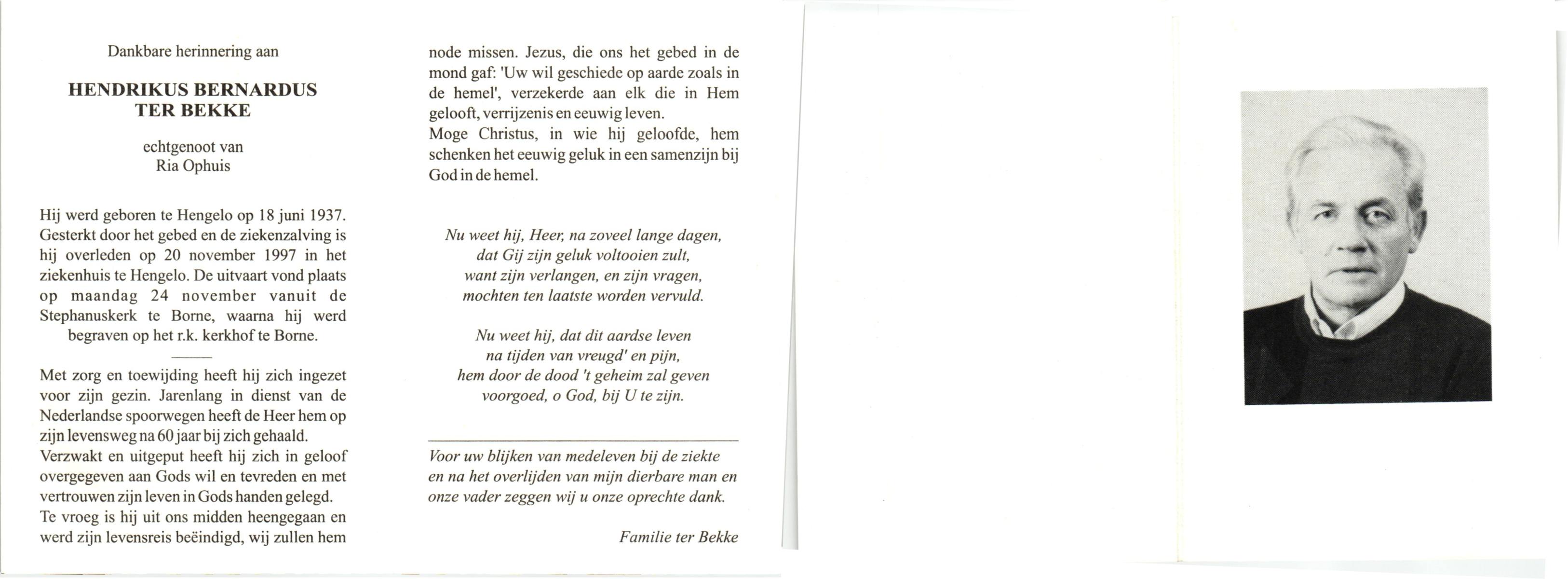 BEKKE, ter, Hendrikus Bernardus, geboren op 18-6-1937 te Hengelo, overleden op 20-11-1997 te Hengelo, ziekenhuis op 60-jarige leeftijd, begraven op 24-11-1997 te Borne.