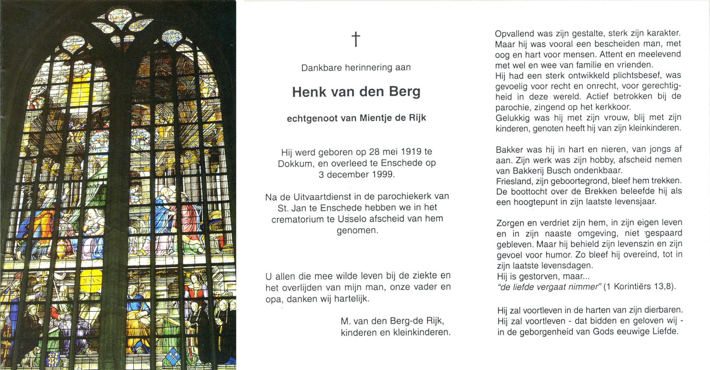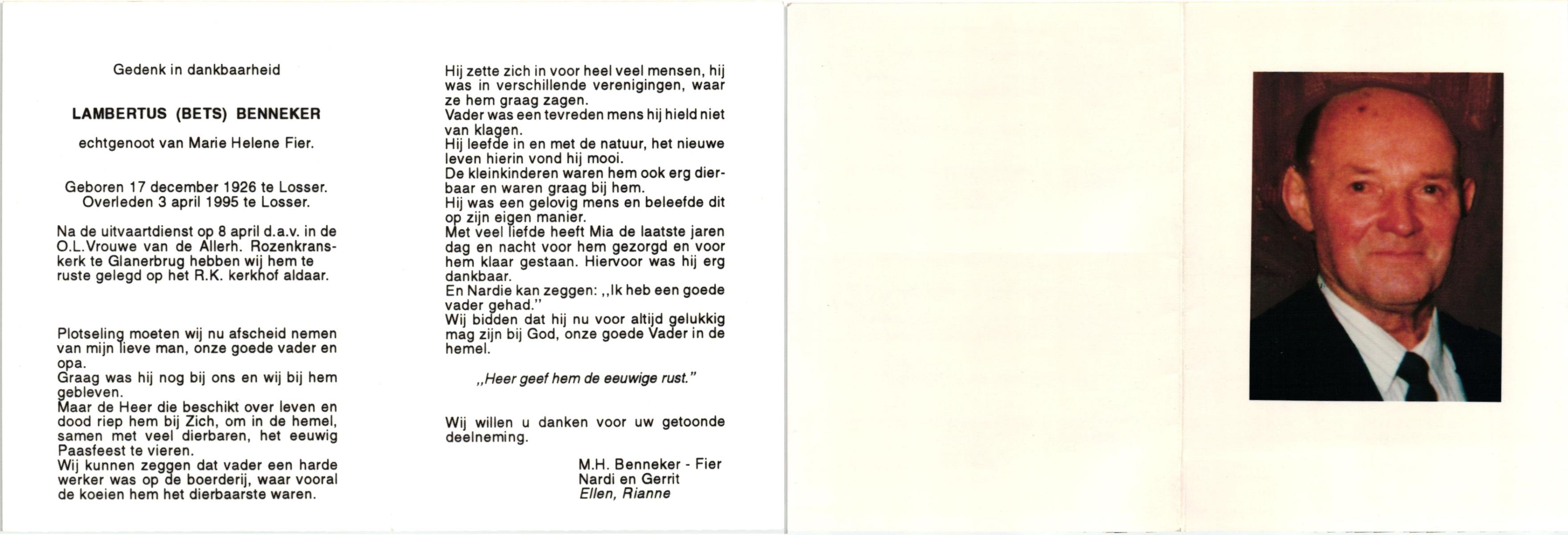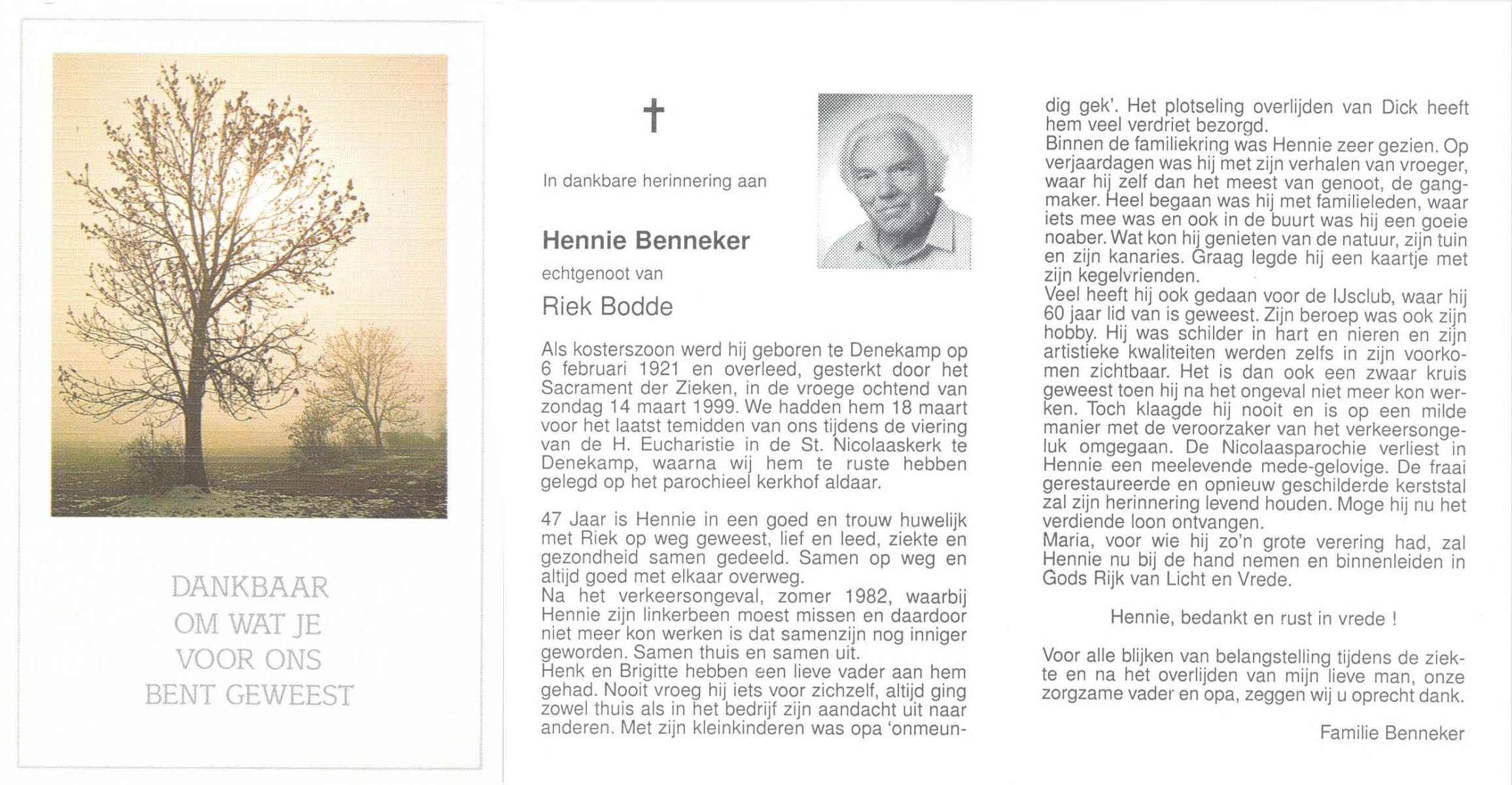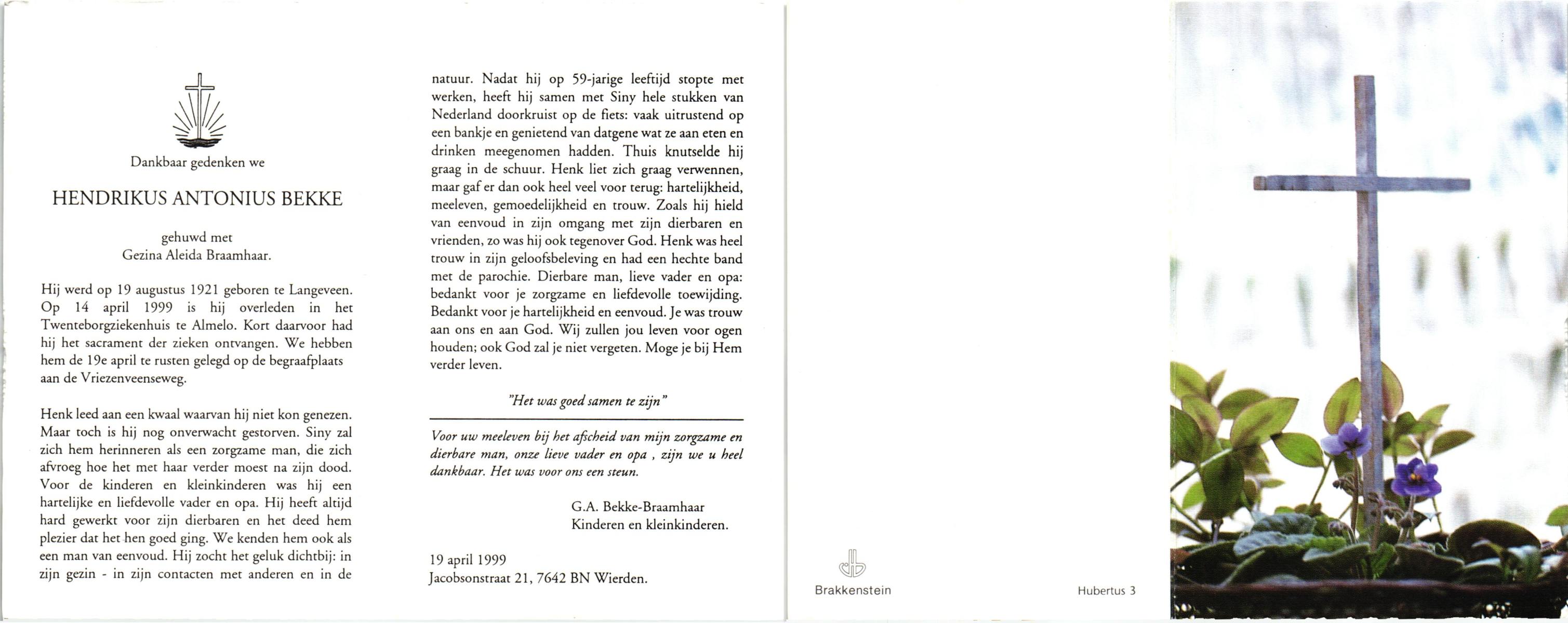 BEKKE, Hendrikus Antonius, geboren op 19-8-1921 te Langeveen, overleden op 14-4-1999 te Almelo, ziekenhuis op 77-jarige leeftijd, begraven op 19-4-1999 te Wierden.