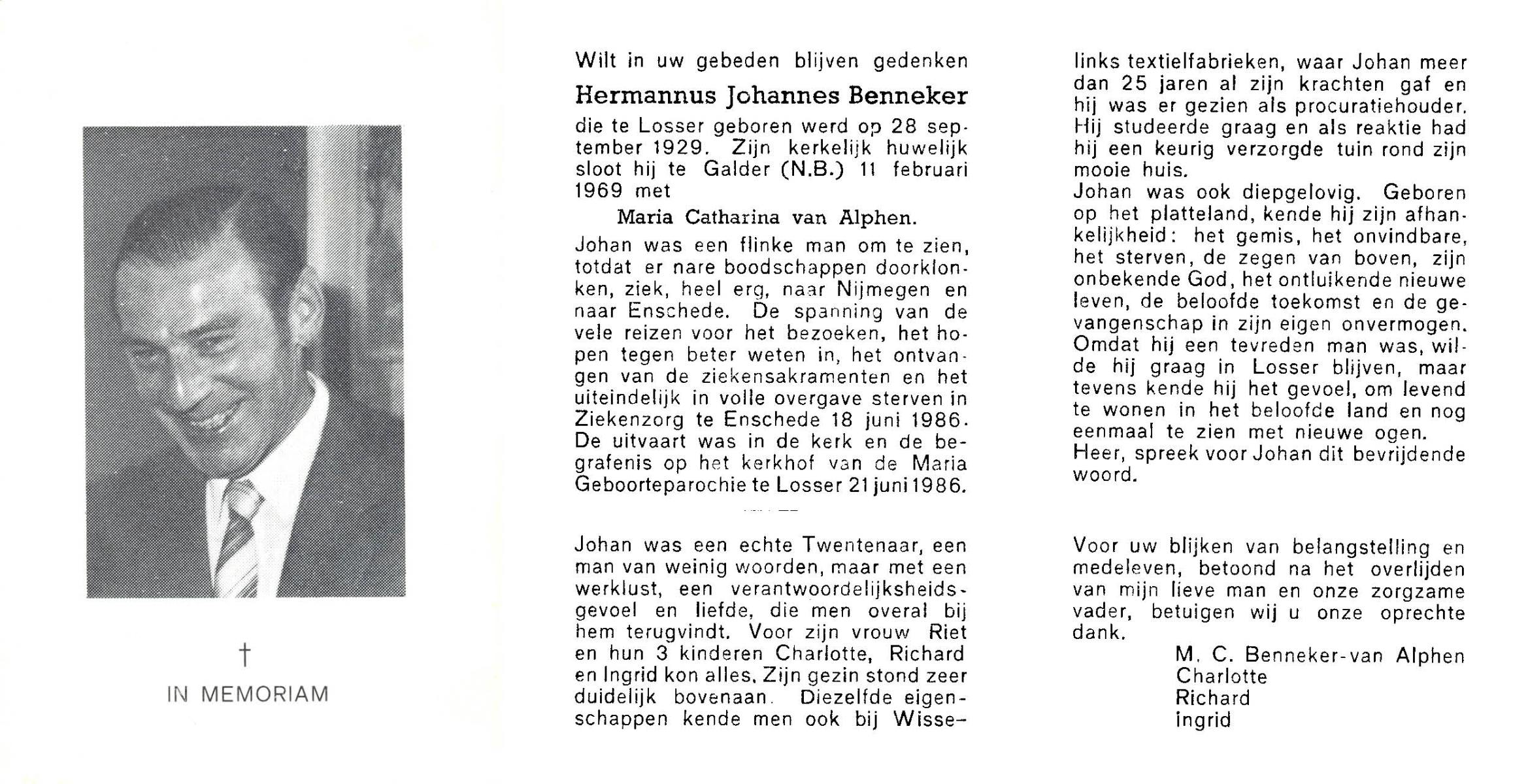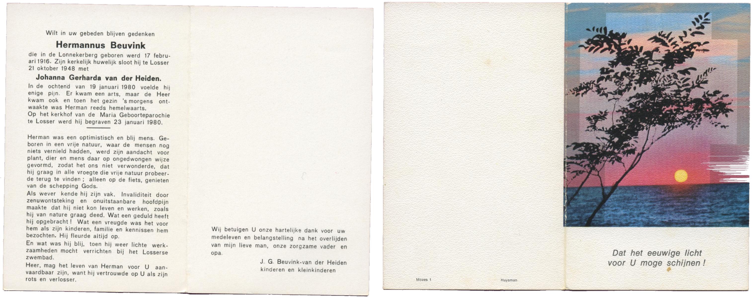 BEUVINK, Hermannus, geboren op 17-2-1916 te Lonneker, overleden op 19-1-1980 te Losser op 63-jarige leeftijd, begraven op 23-1-1980 te Losser.