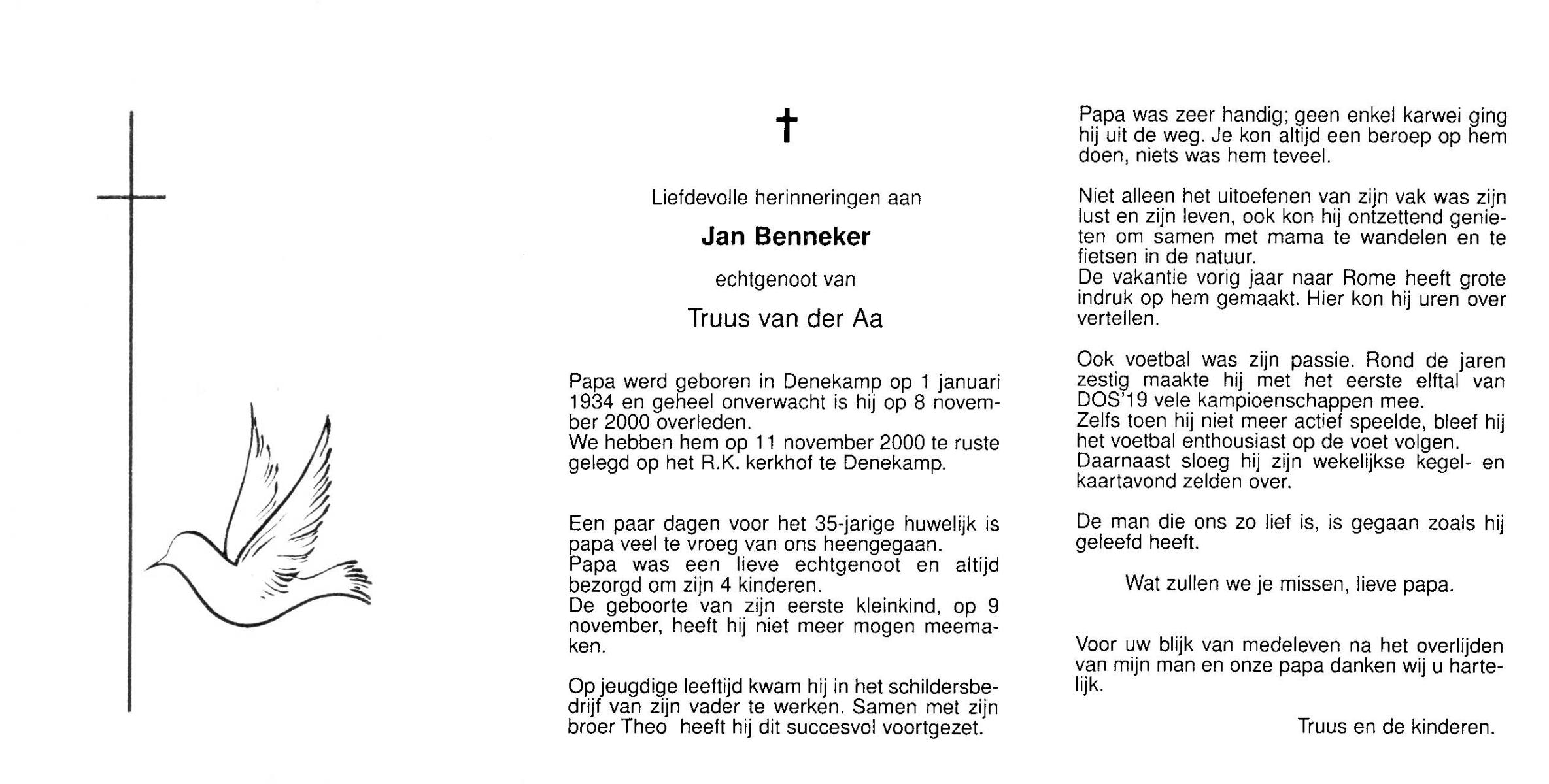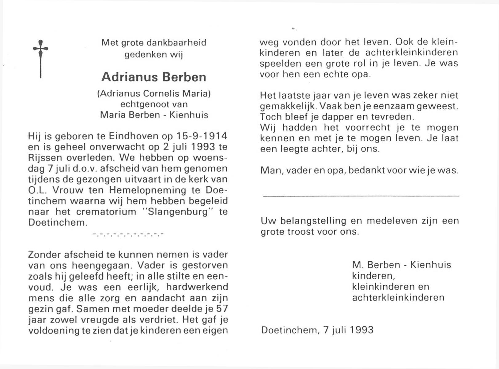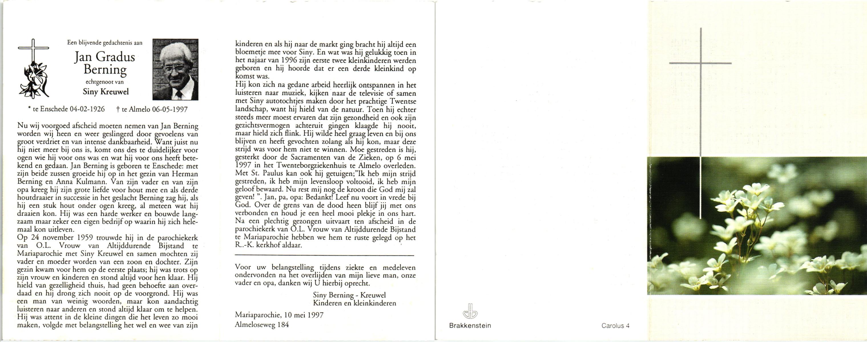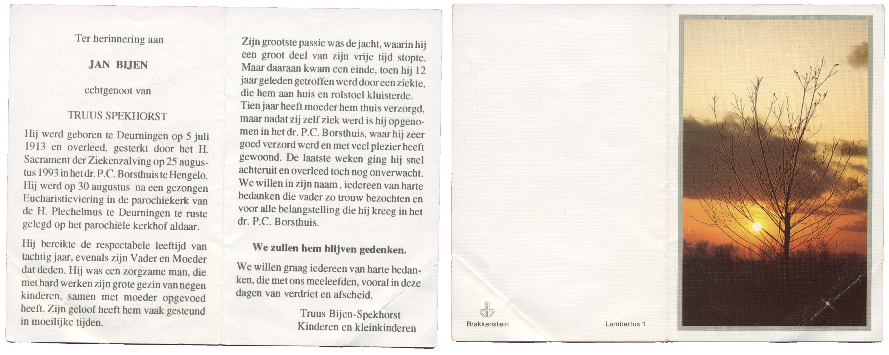 BIJEN, Jan, geboren op 5-7-1913 te Deurningen, overleden op 25-8-1993 te Hengelo (Ov.) op 80-jarige leeftijd, begraven op 30-8-1993 te Deurningen.